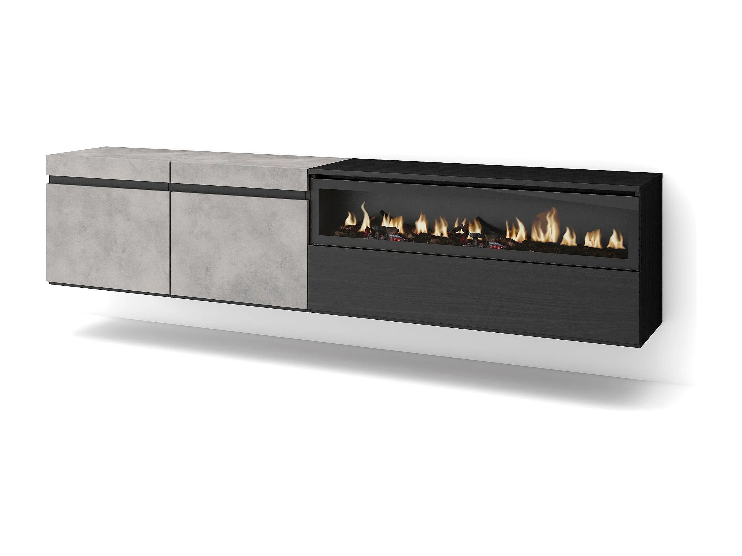 Meuble TV, Banc Télé, 200x35x45cm, Pour les TV jusqu'à 80", Cheminée électrique, Suspendu, Mural, Ciment