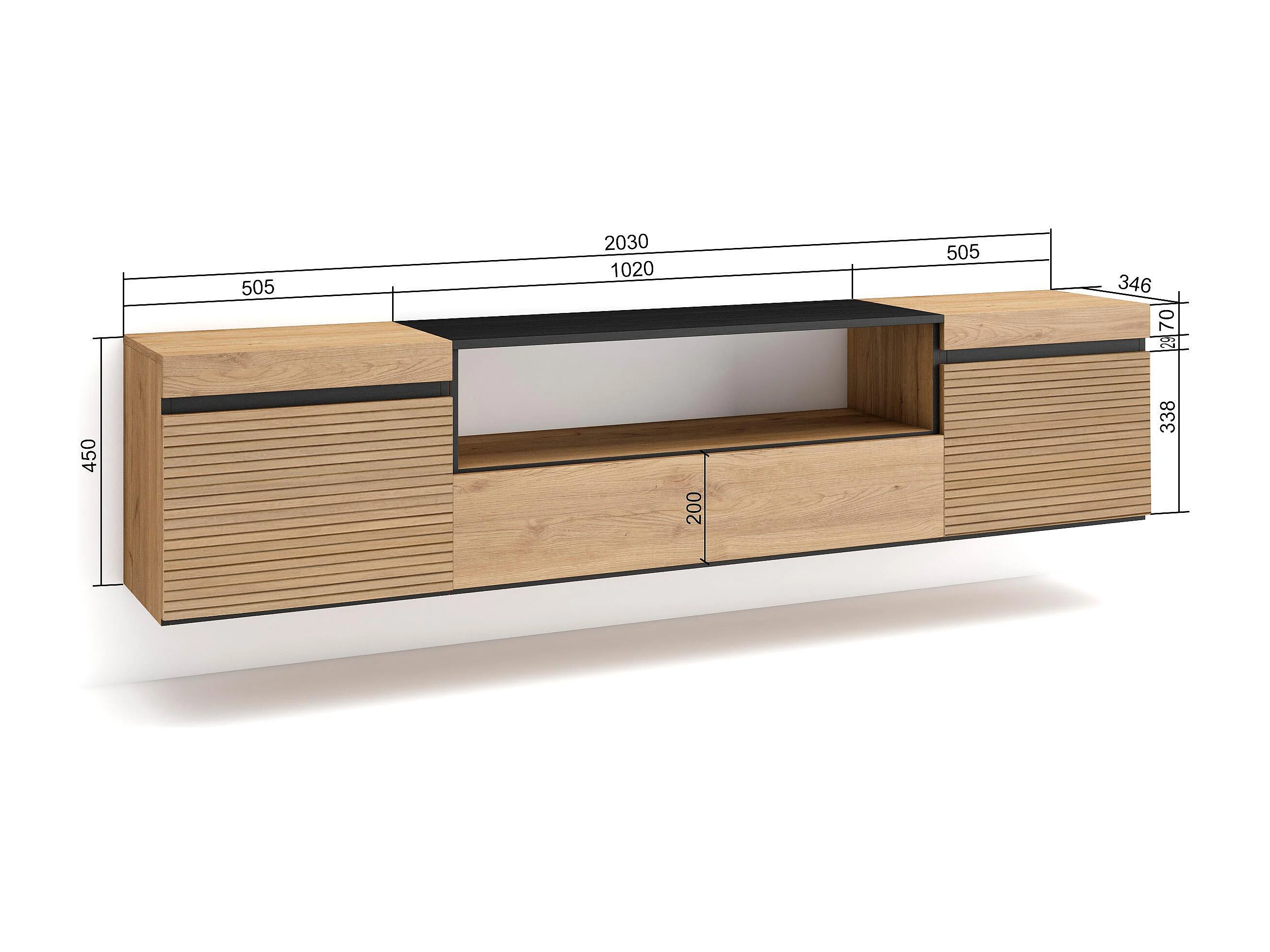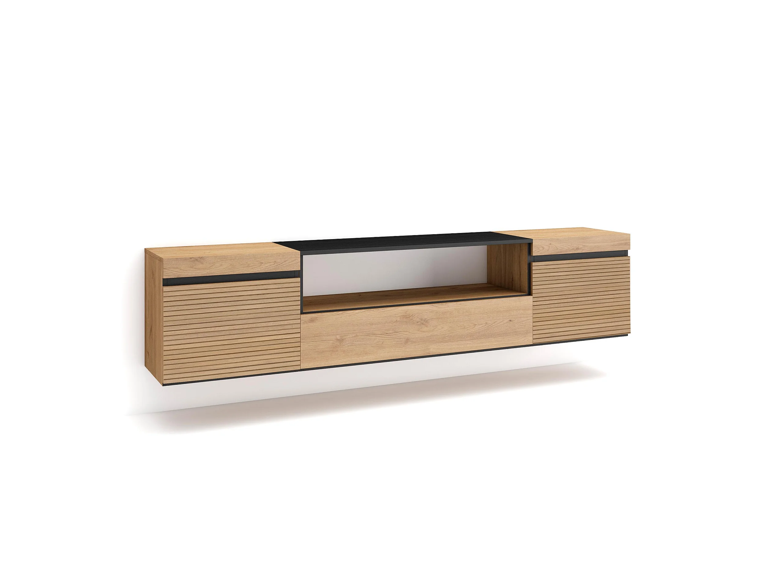 Meuble TV, Banc Télé, 200x35x45cm, Pour les TV jusqu'à 80", Suspendu, Mural, Chêne