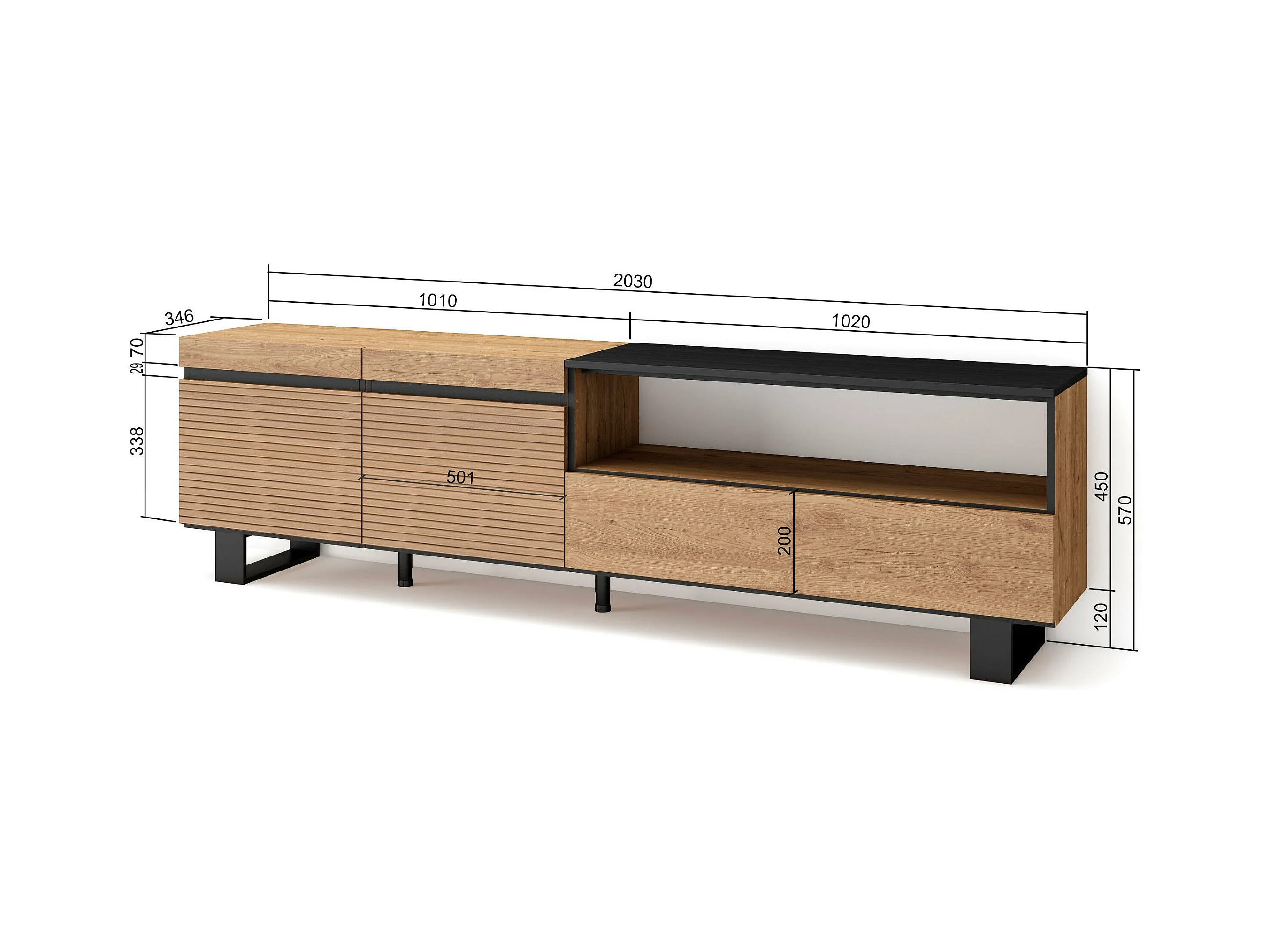 Meuble TV | Banc Télé, 200x57x35cm, Pour les TV jusqu'à 80", Design industriel, Chêne