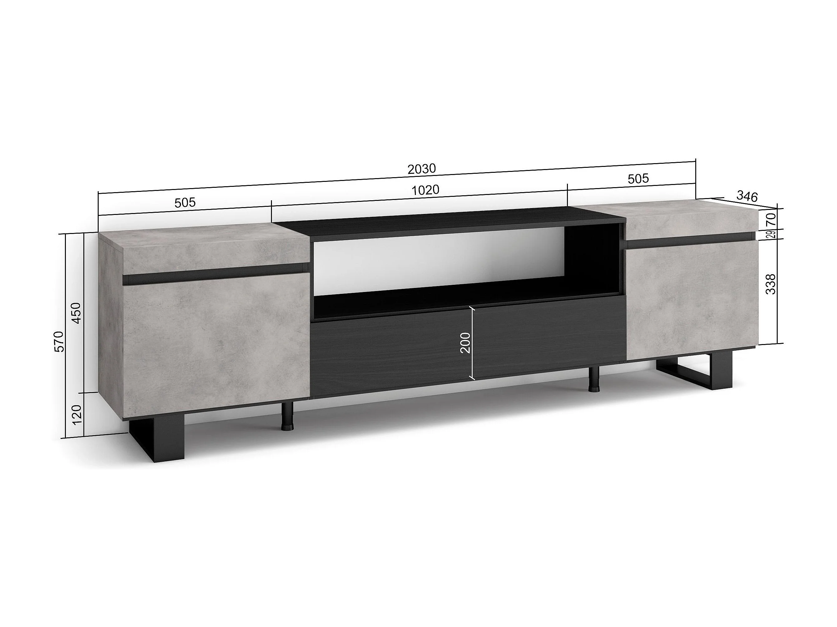 Meuble TV, Banc Télé, 200x35x57cm, Pour les TV jusqu'à 80", Design industriel, Ciment