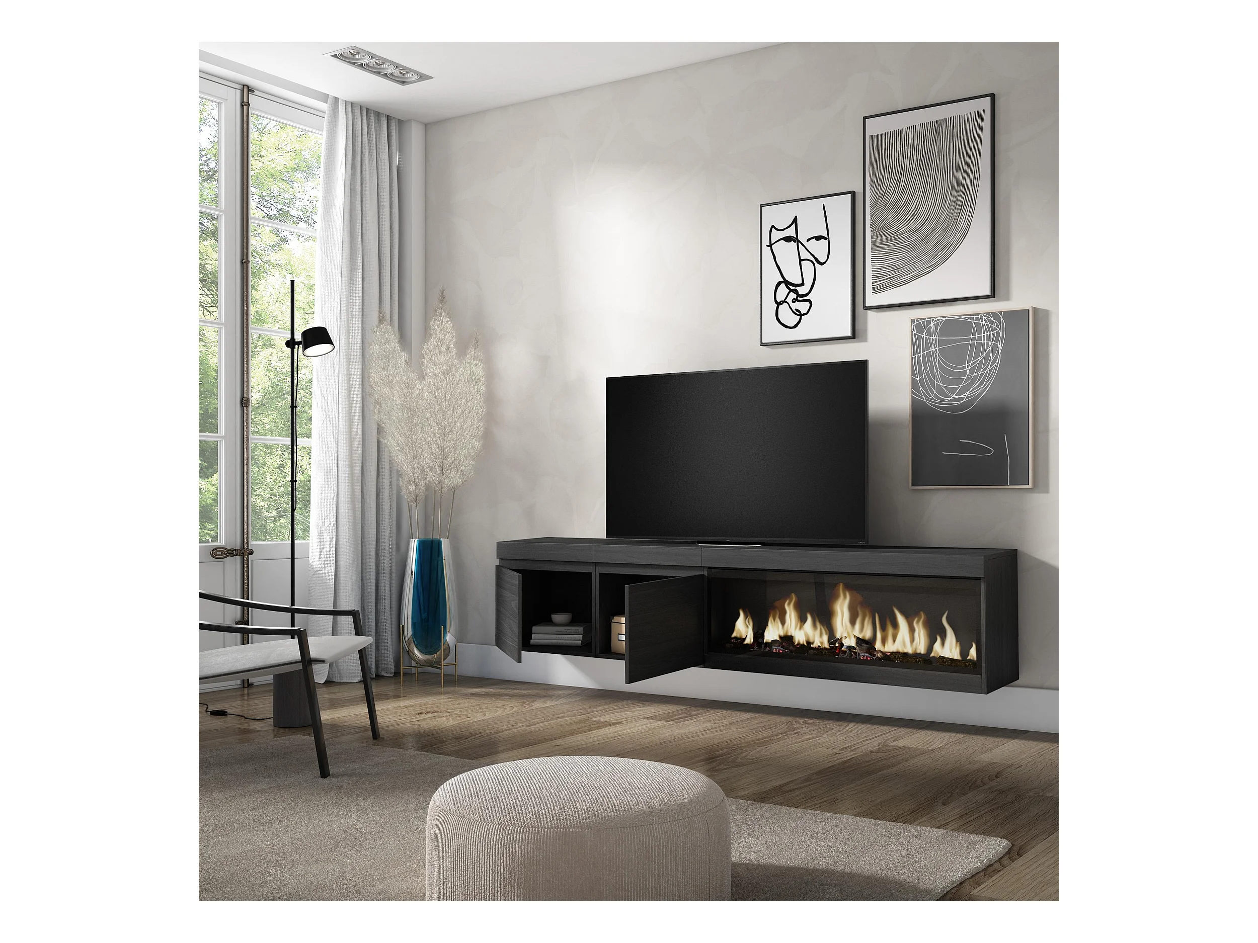 Meuble TV, Banc Télé, 208x35x45cm, Pour les TV jusqu'à 80", Cheminée électrique XXL, Suspendu, Mural, Noir