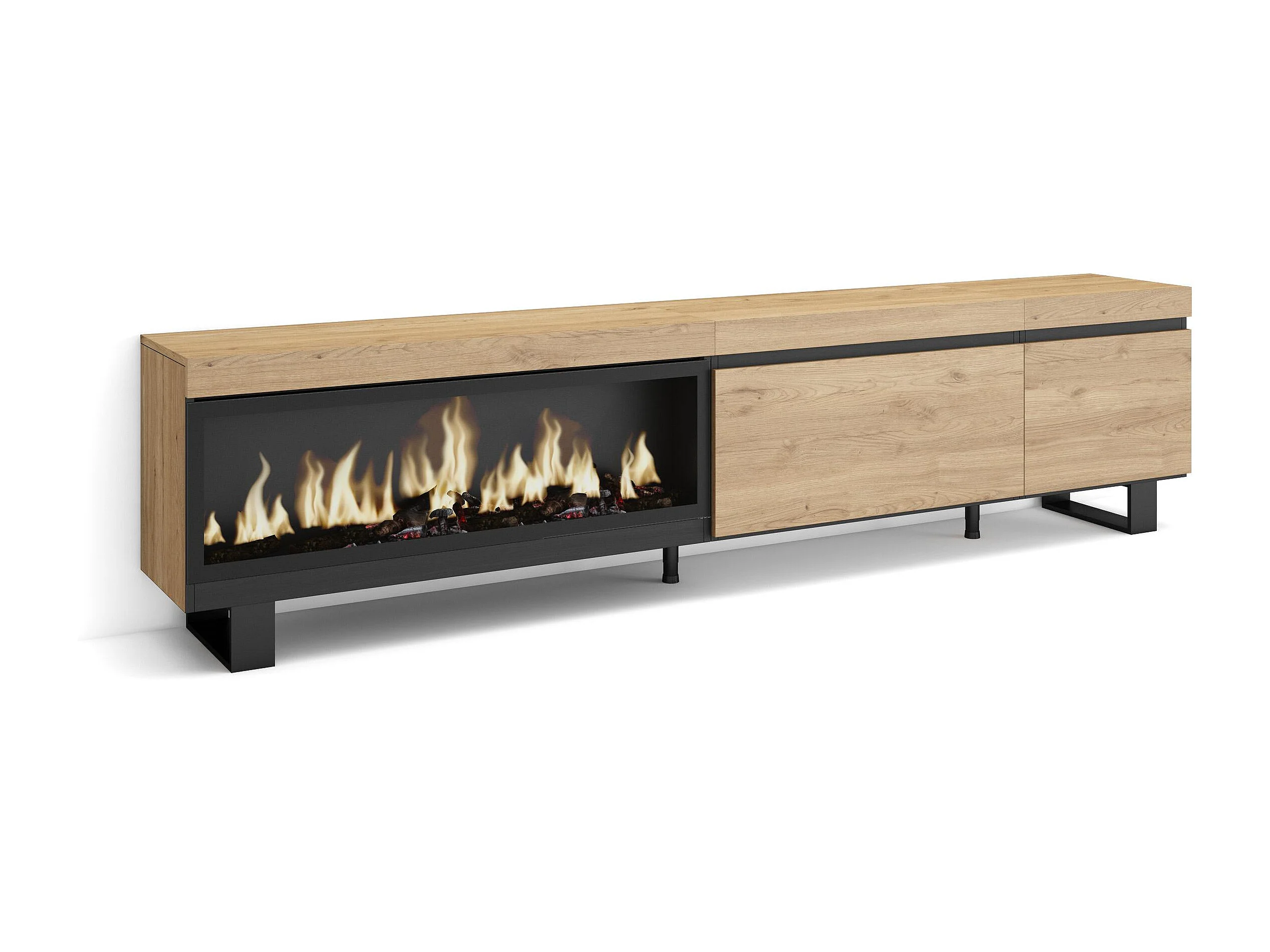 Meuble TV, Banc Télé, 237x35x57cm, TV grand format, Cheminée électrique XXL, Design industriel, Chêne