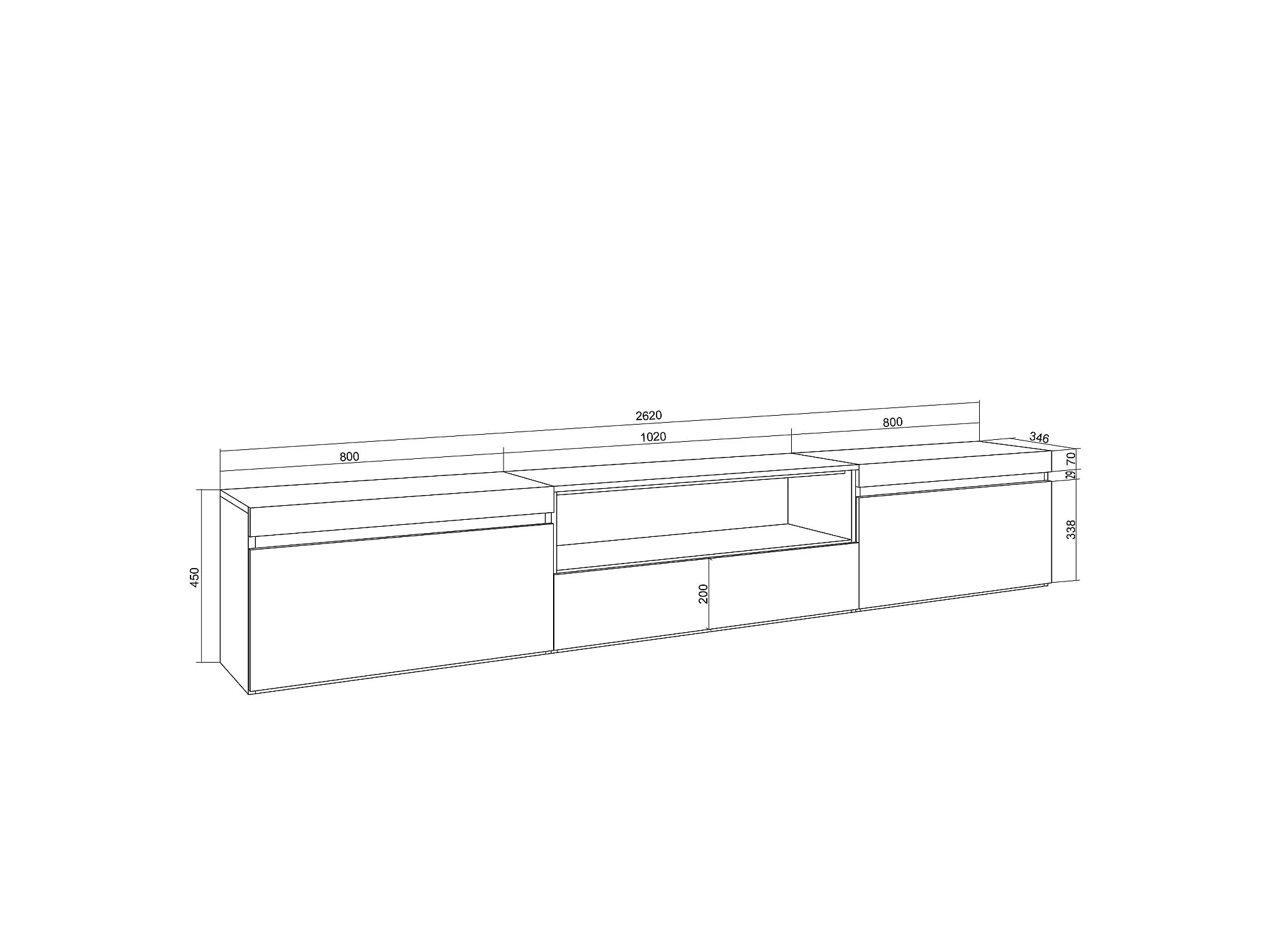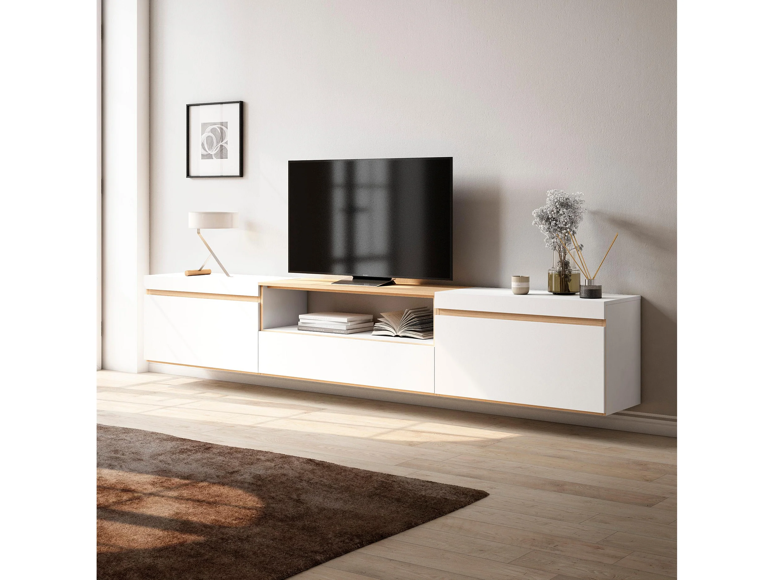 Meuble TV, Banc Télé, 260x35x45cm, TV grand format, Suspendu, Mural, Blanc et Chêne Soft