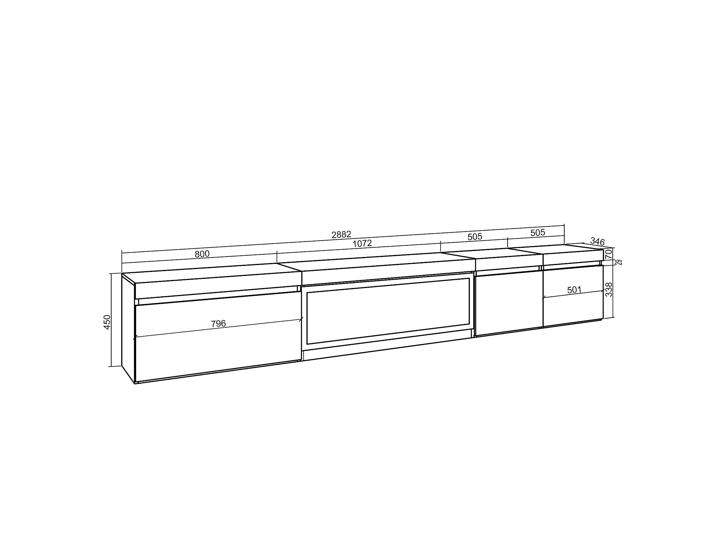 Meuble TV, Banc Télé, 288x35x45cm, TV grand format, Cheminée électrique XXL, Suspendu, Mural, Chêne et noir