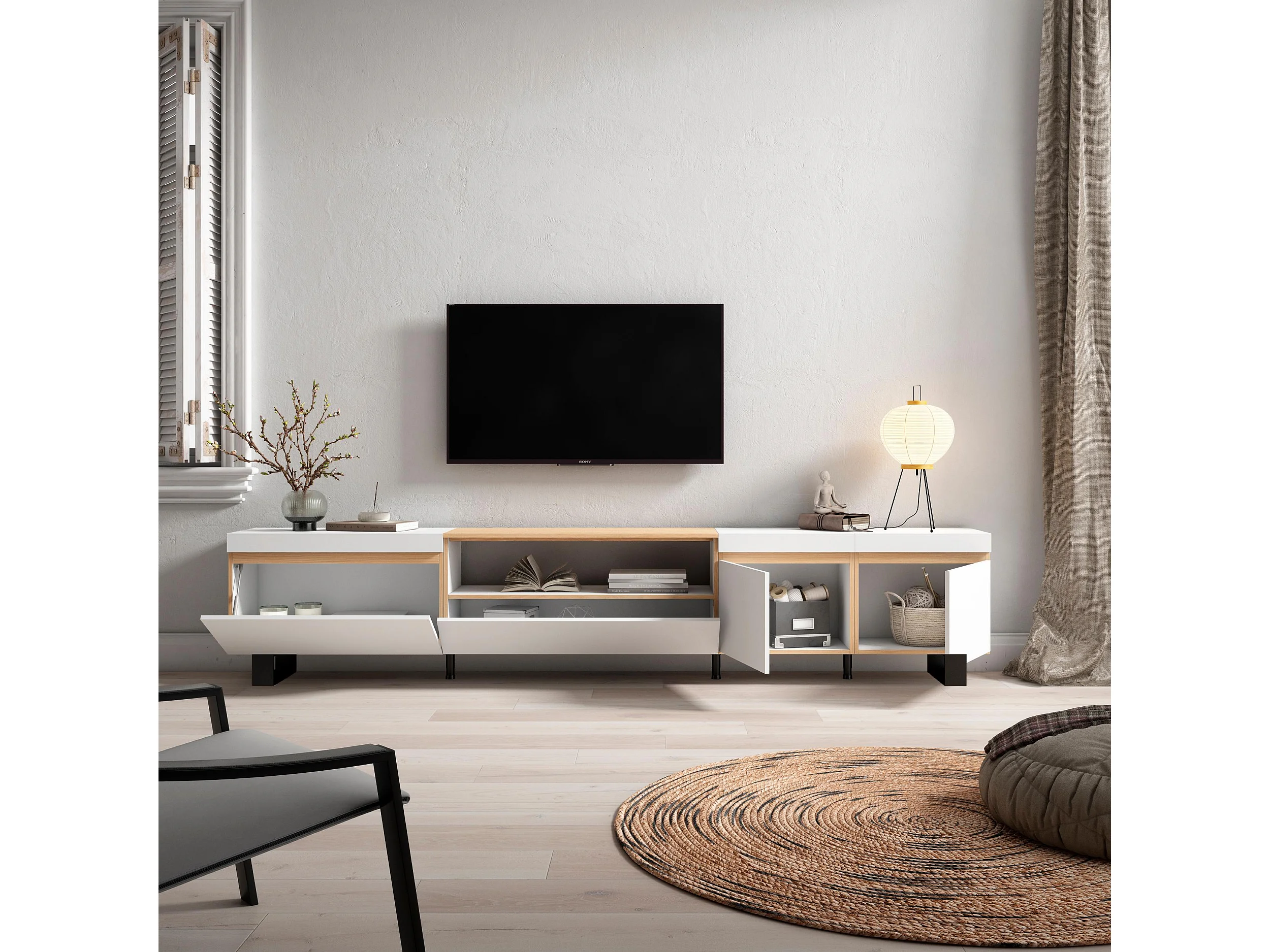 Meuble TV, Banc Télé, 288x35x57cm, TV grand format, Design industriel, Blanc et Chêne Soft