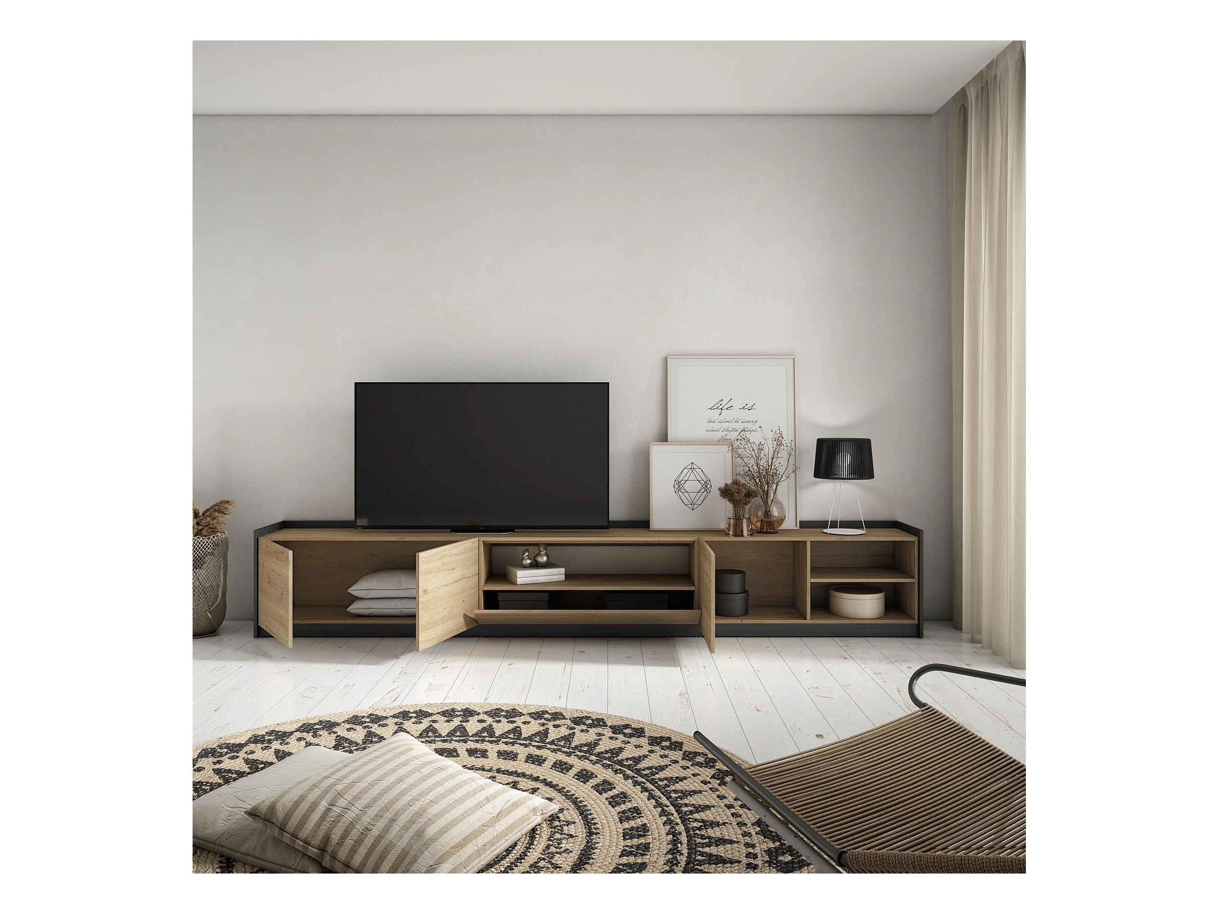 Meuble TV | Banc Télé, 310x50x37 cm, Pour les TV jusqu'à 80", Meubles de salon, Chêne et noir