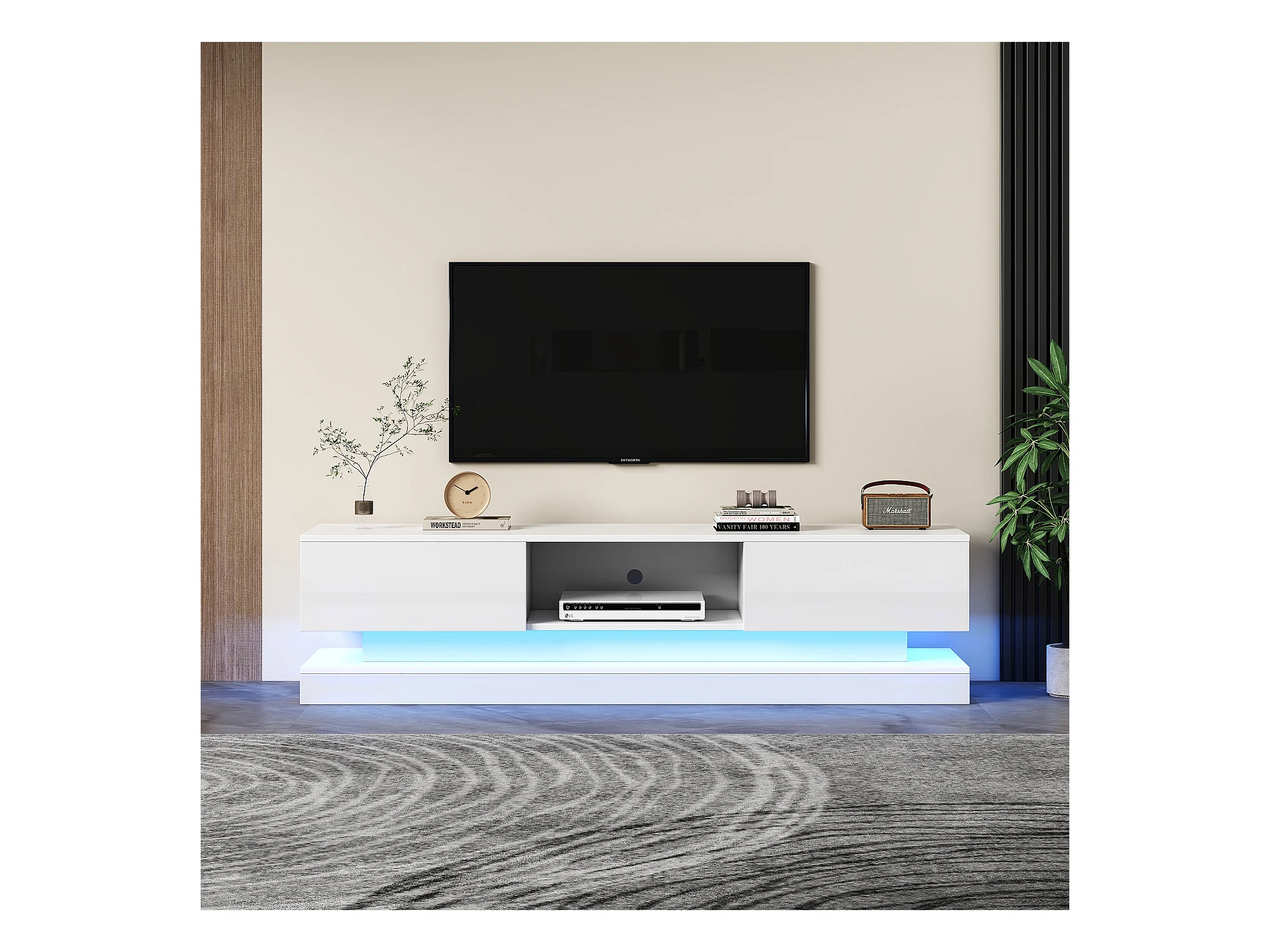 Meuble TV blanc avec 2 tiroirs et compartiments de rangement ouverts, éclairage LED
