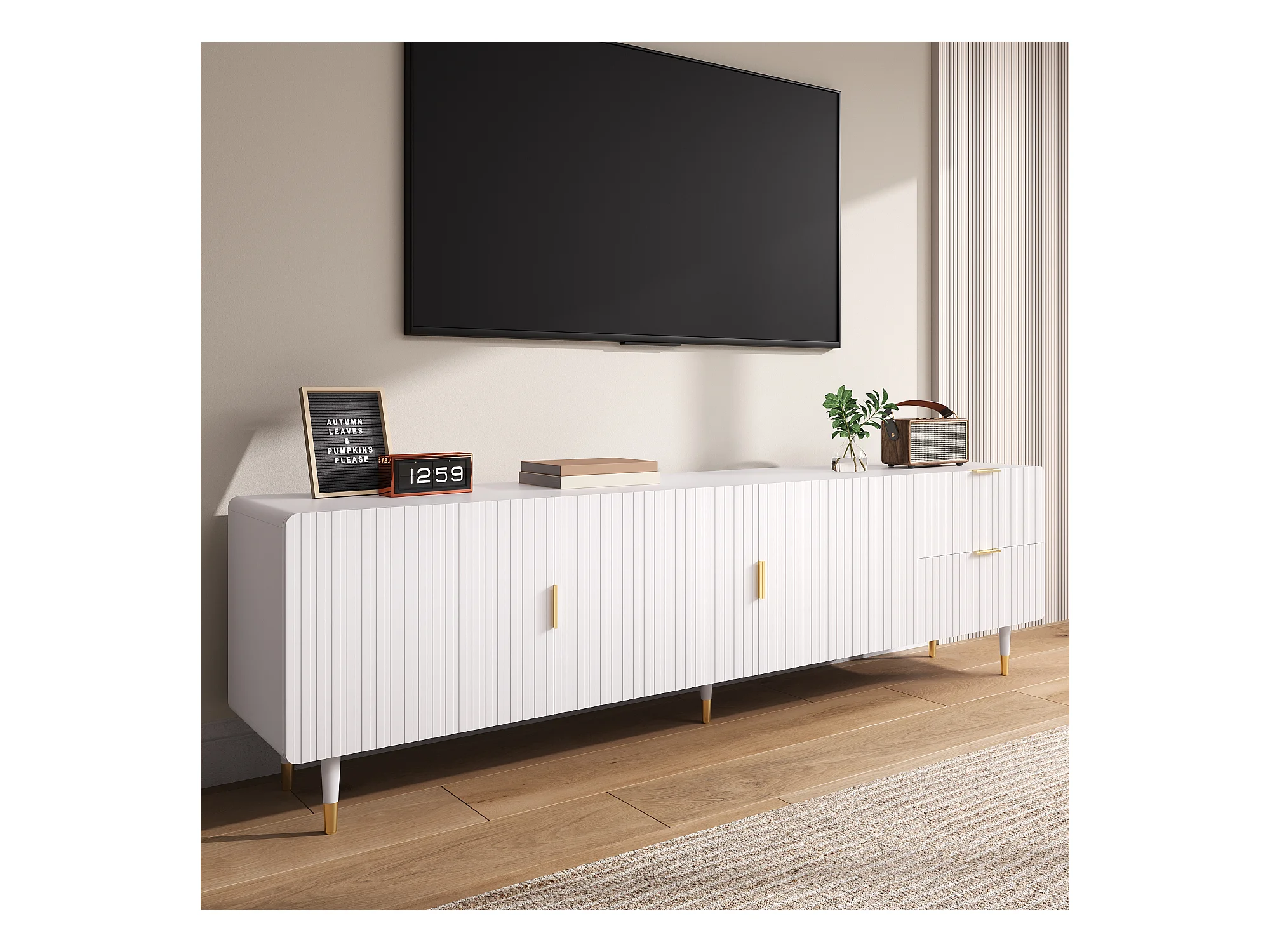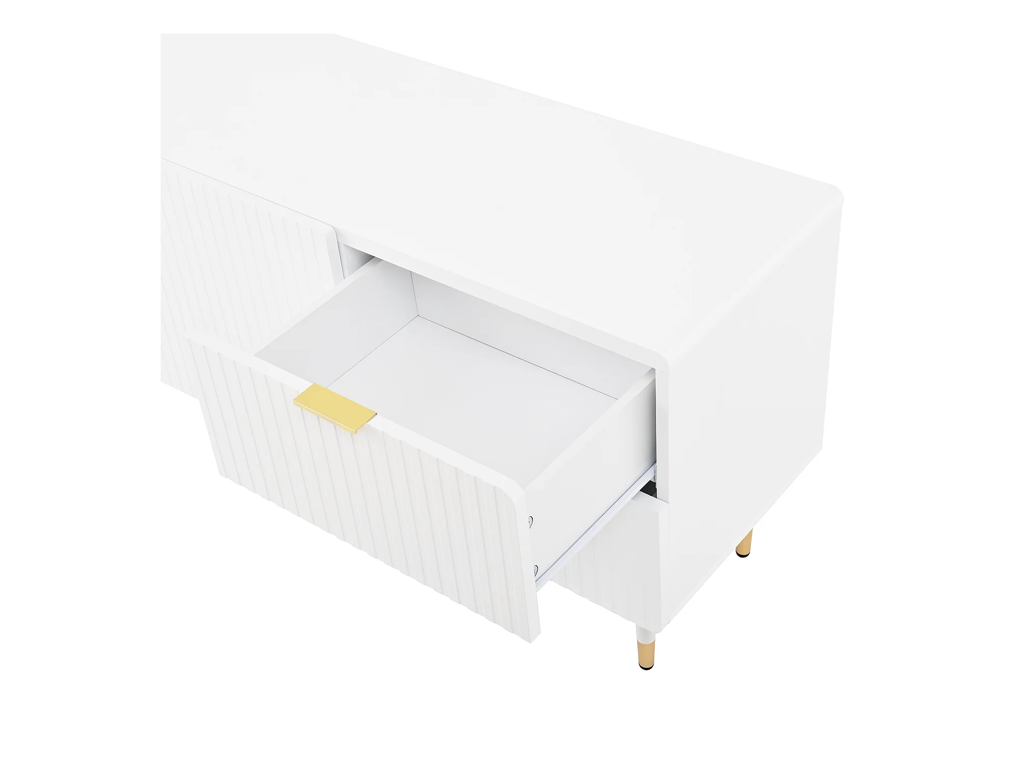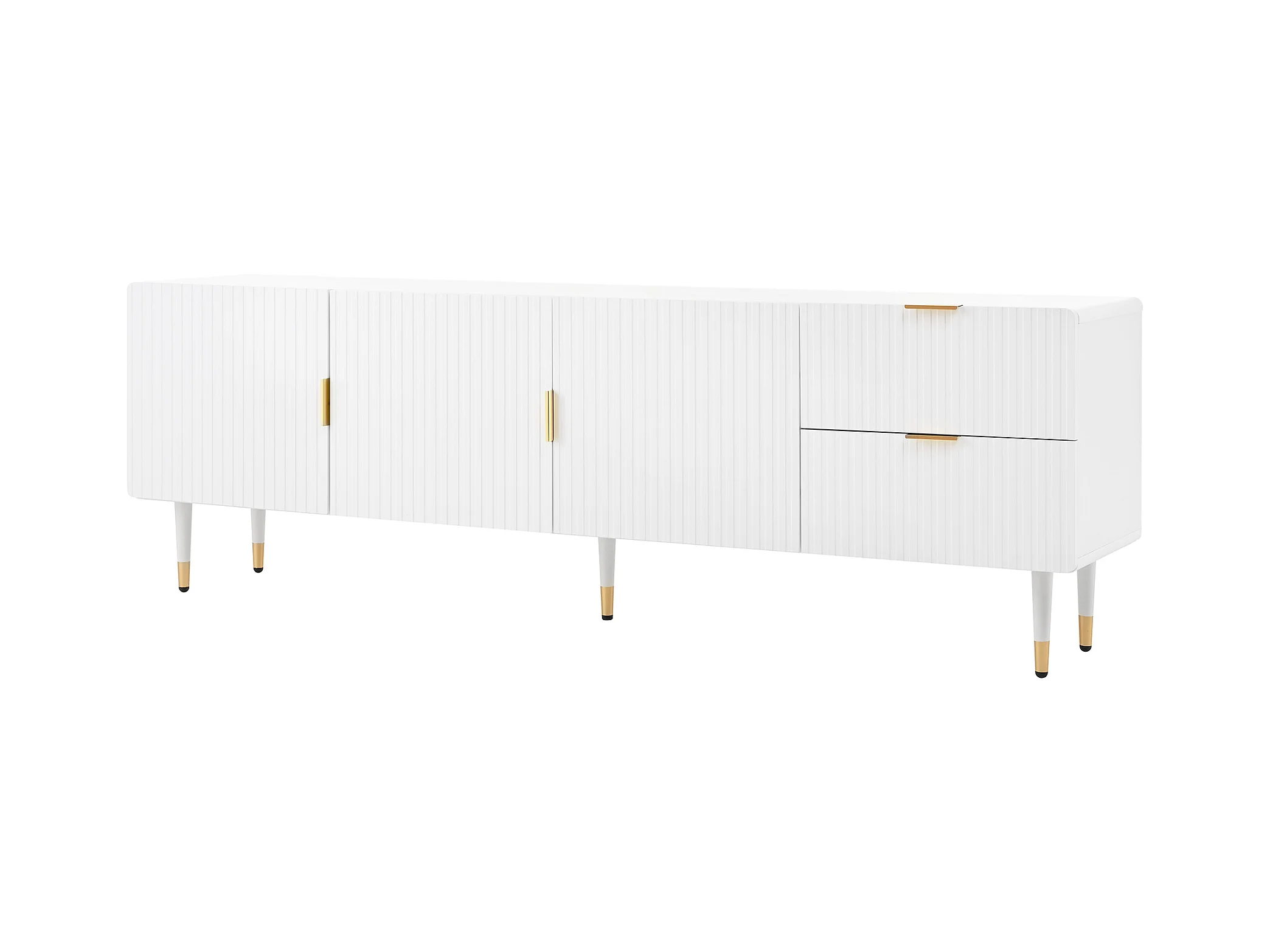 Meuble TV blanc avec 2 portes et 4 tiroirs, poignées dorées et pieds dorés - pour salons et bureaux