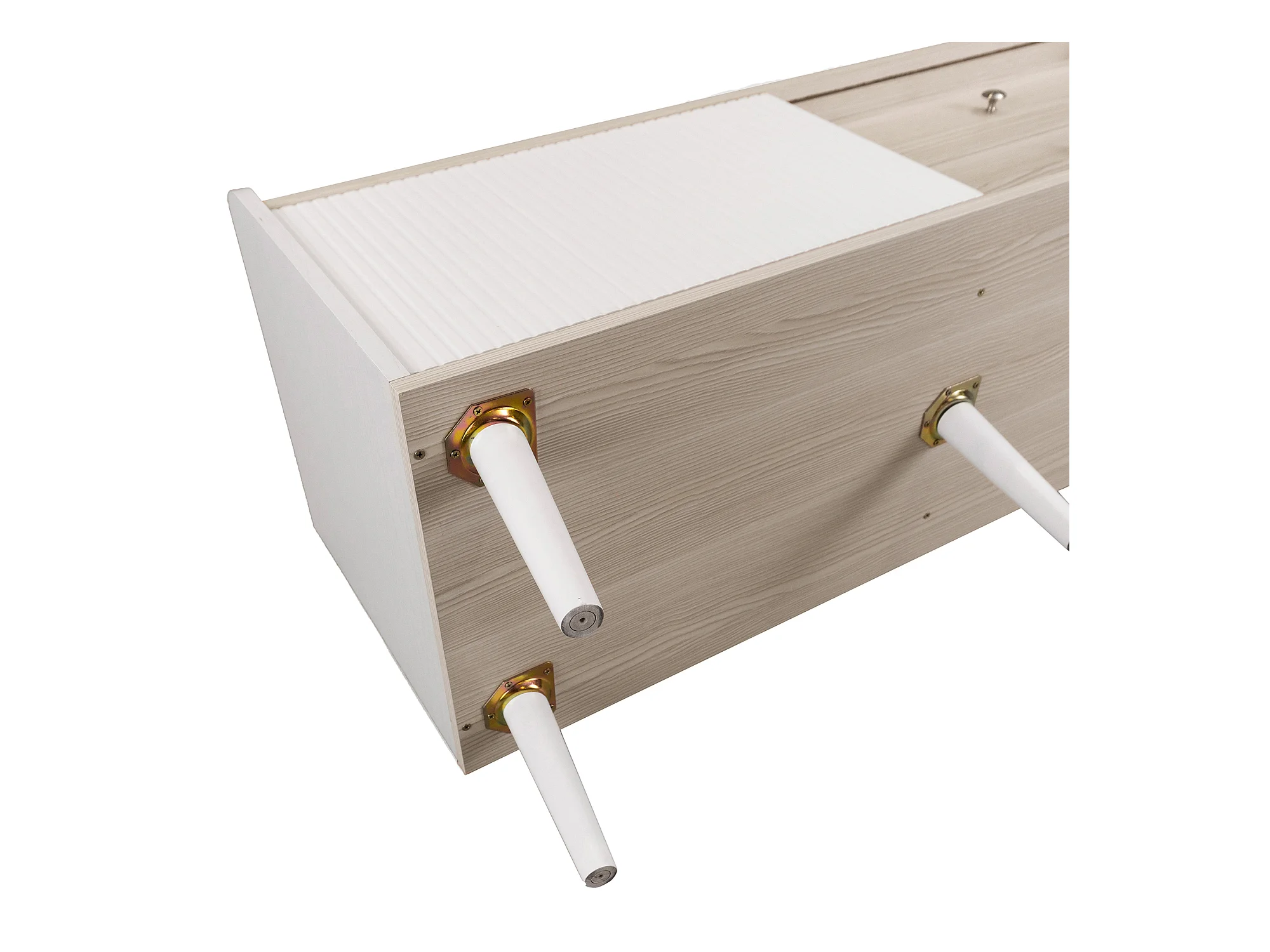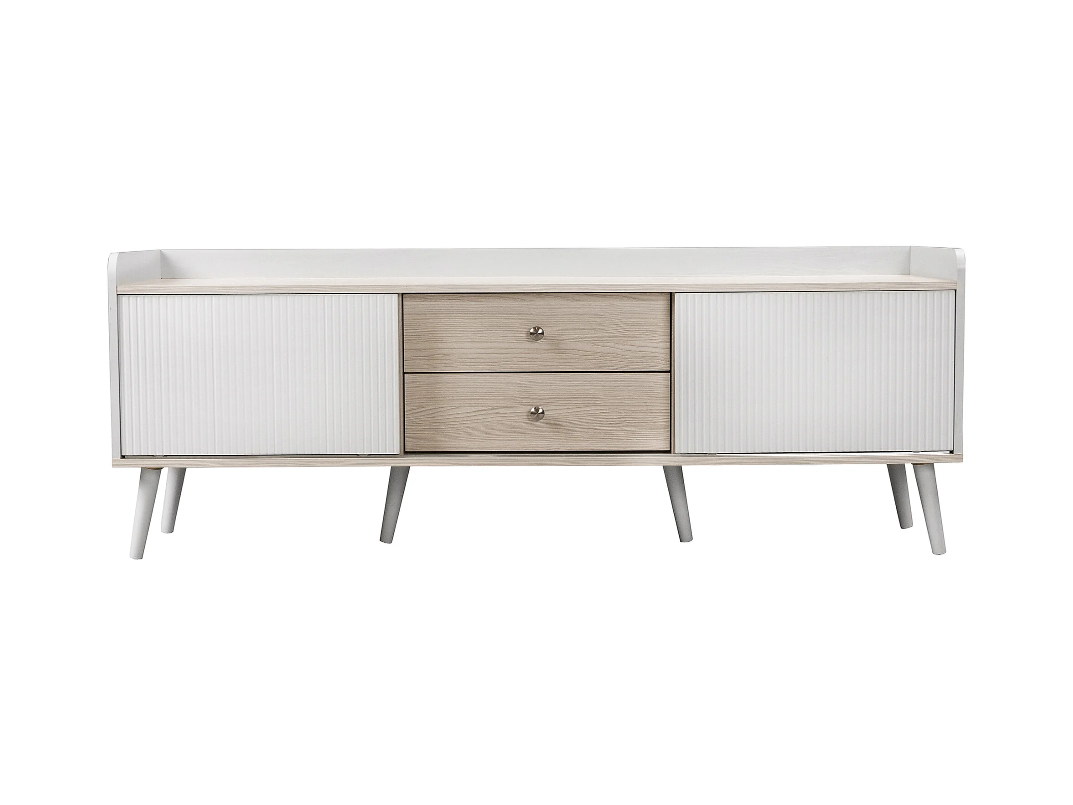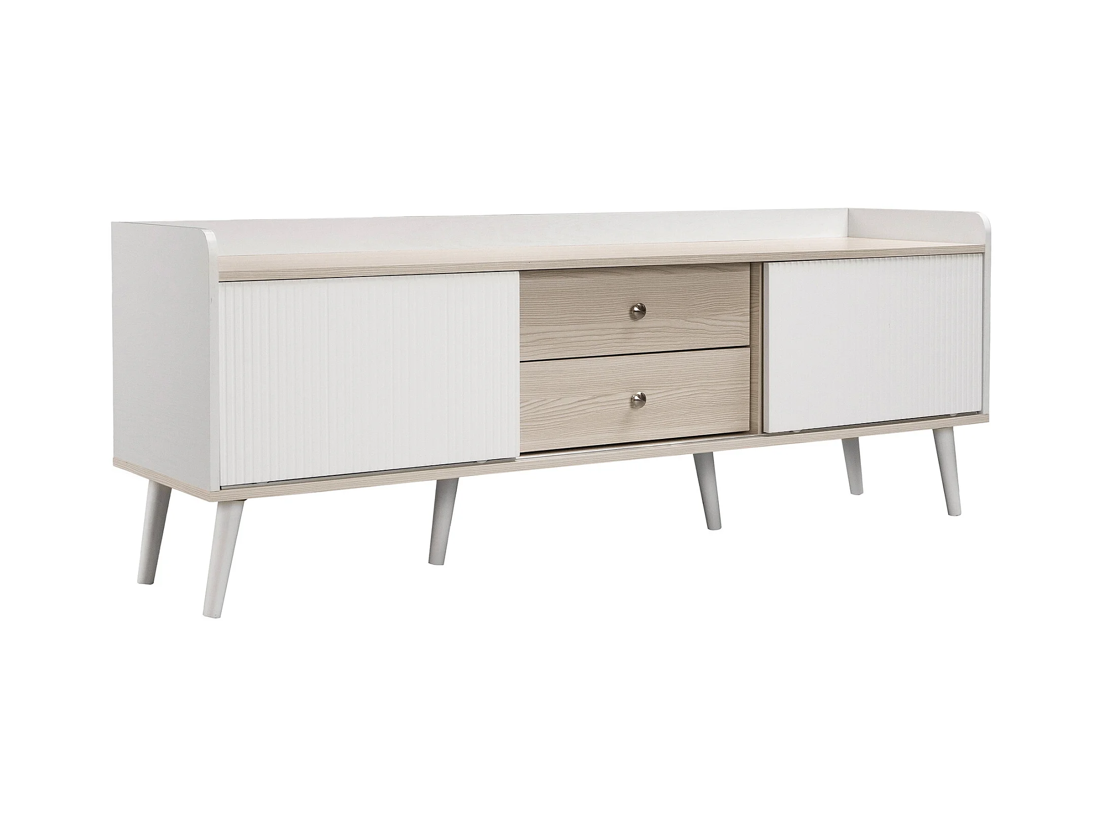 Meuble TV blanc et bois, 2 tiroirs et 2 portes, pieds bois - pour salon et bureau