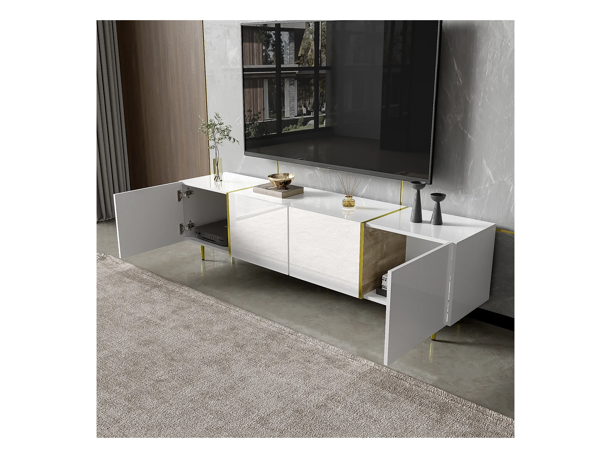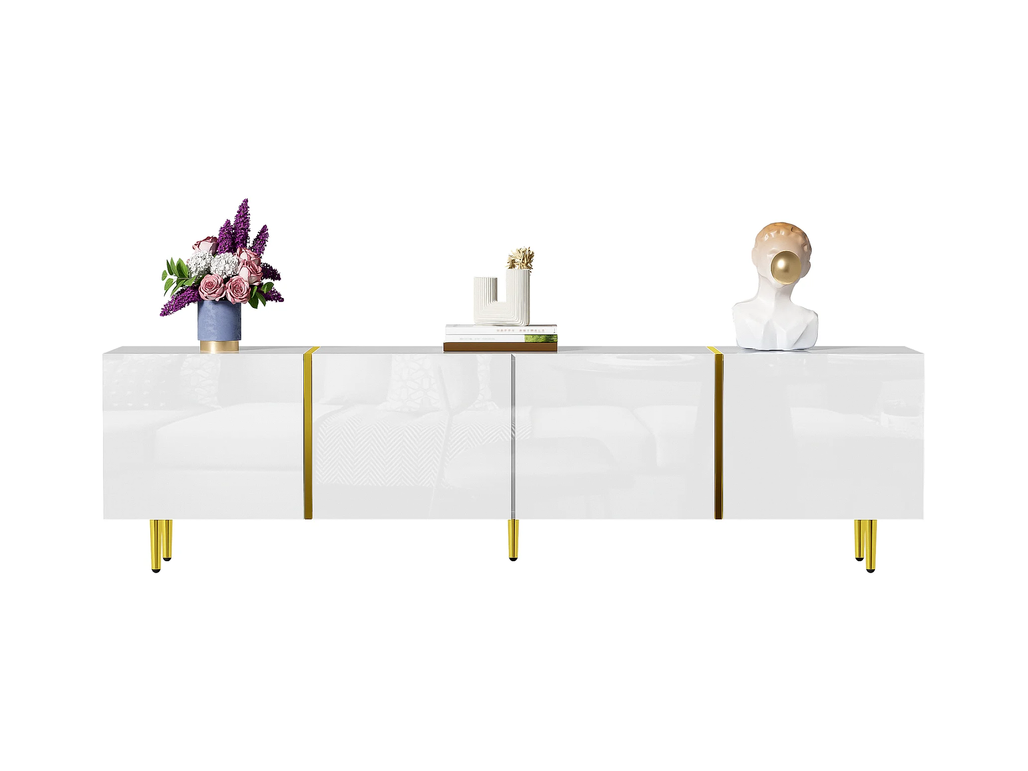Meuble TV blanc haut brillant à 4 portes, design moderne et simple, MDF, 170x35x46cm