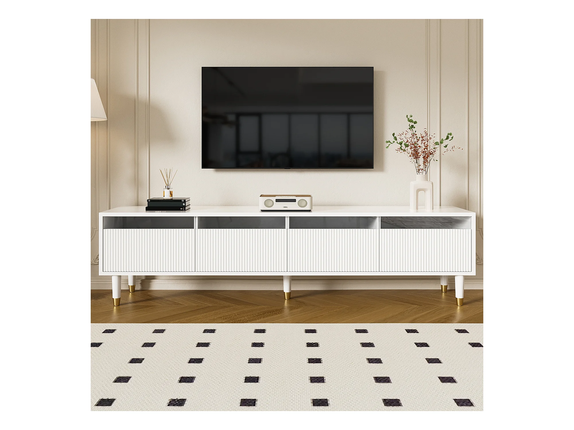 Meuble TV blanc moderne, design minimaliste, MDF et acrylique, 4 tiroirs (178x35x45cm)