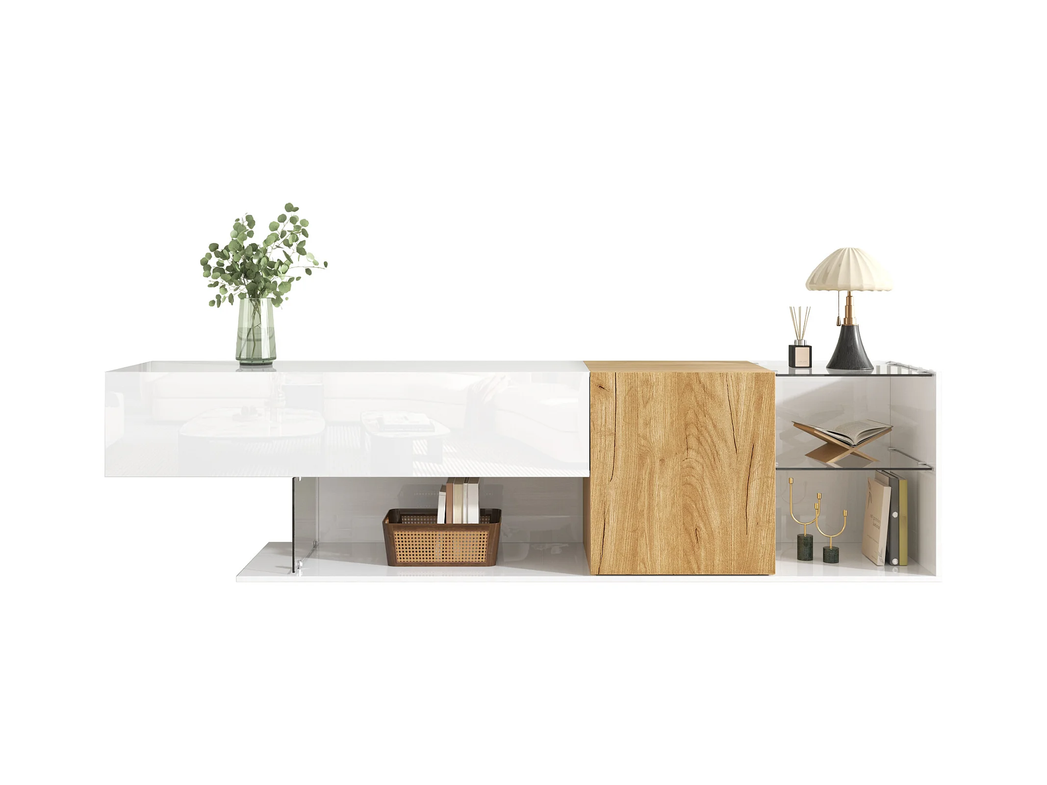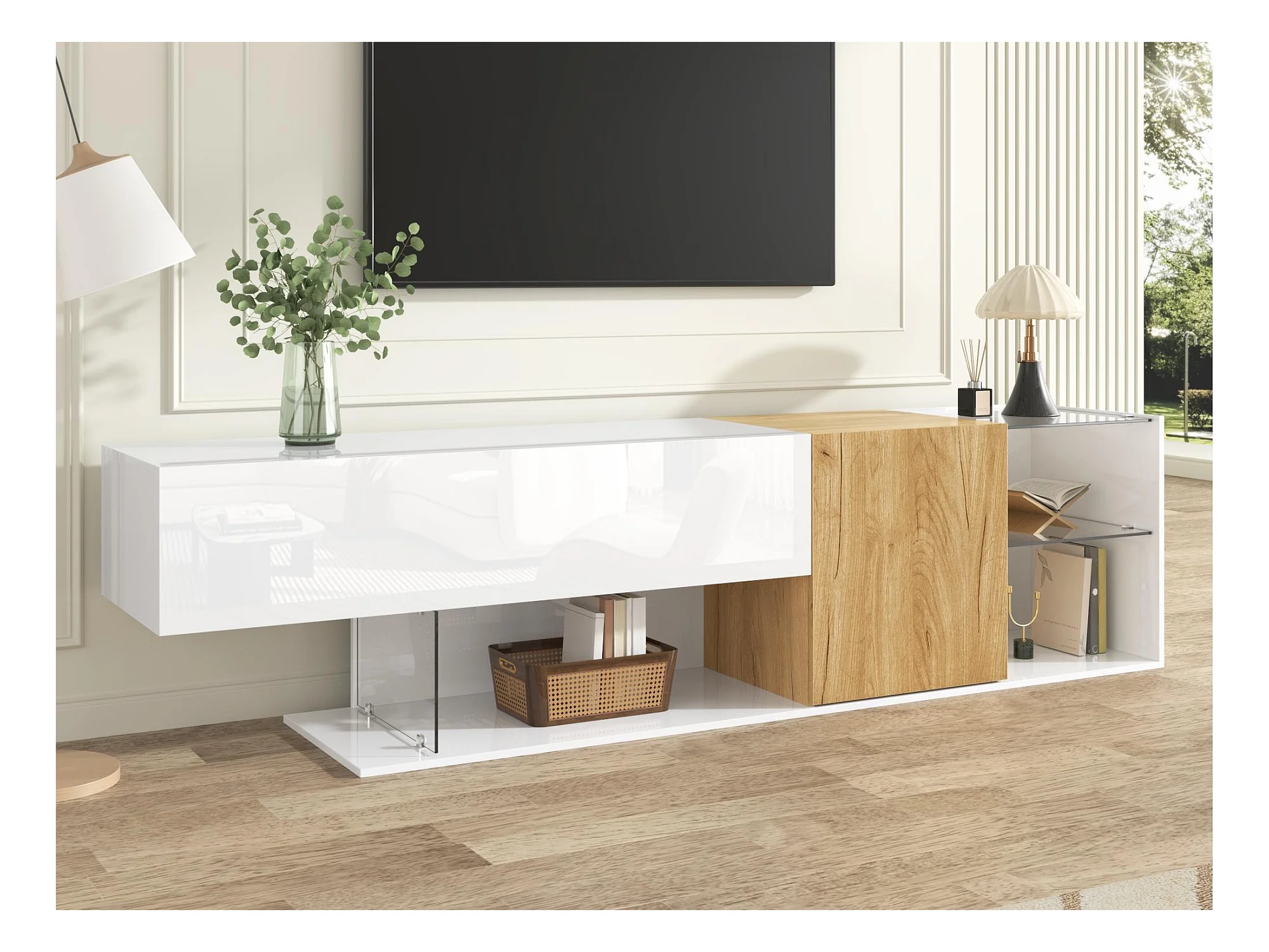 Meuble TV brillant 180x38x48cm - avec 2 portes - étagères en verre - aspect bois - panneaux de particules - blanc + naturel