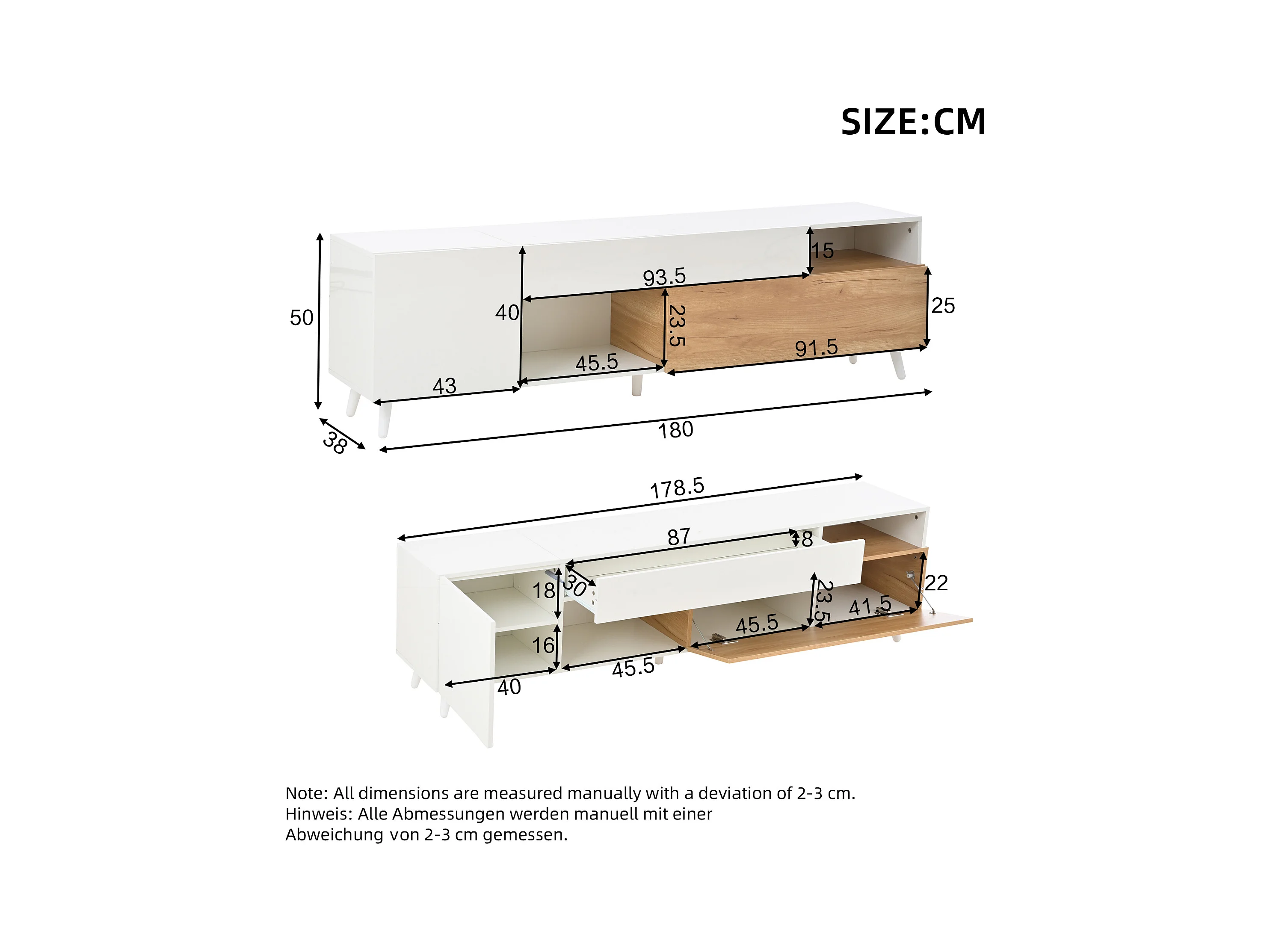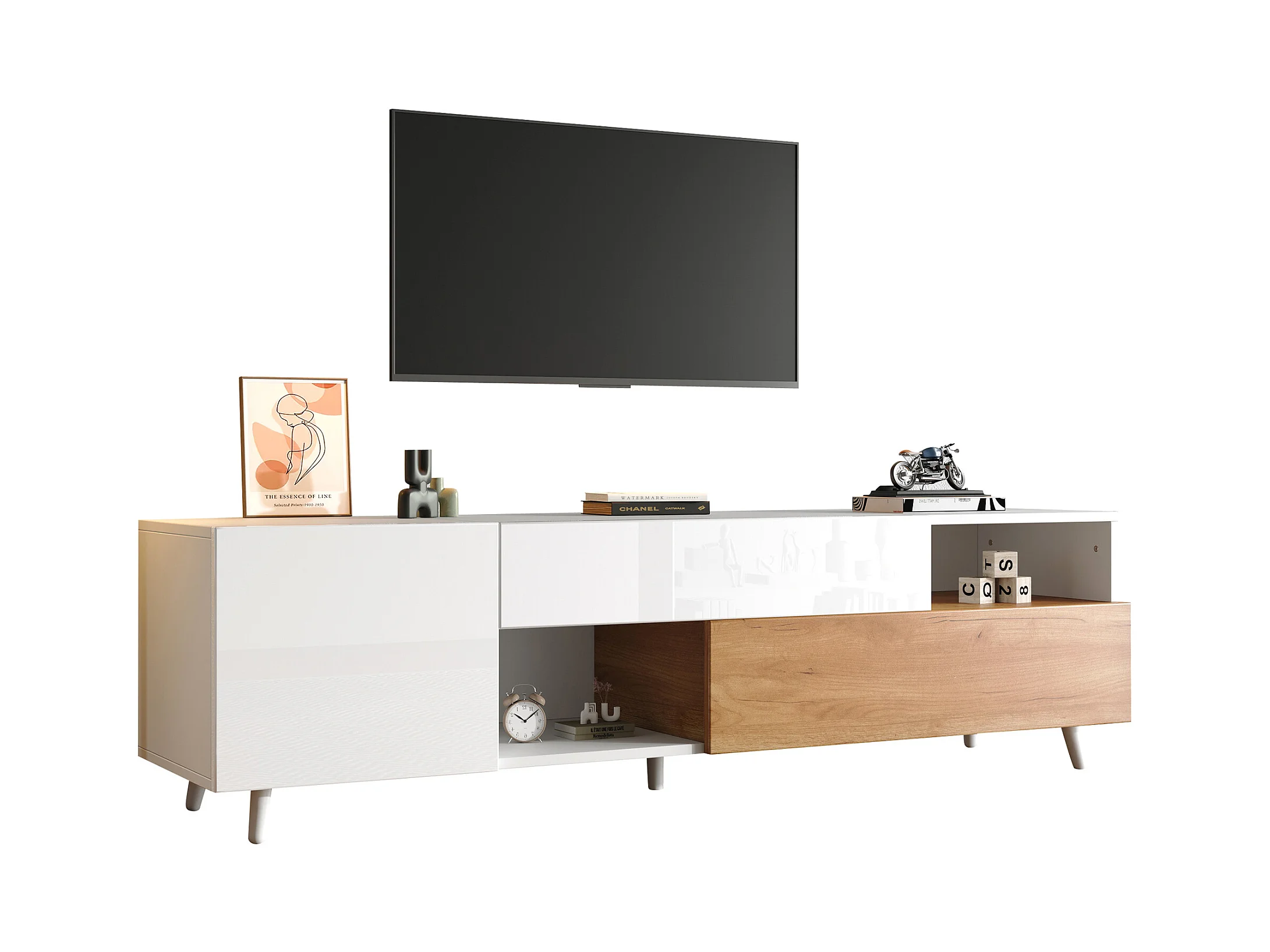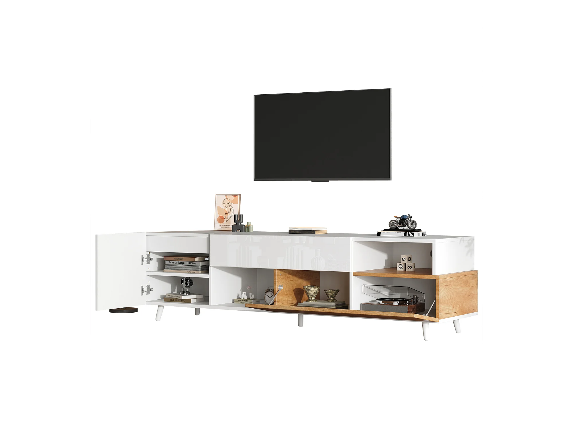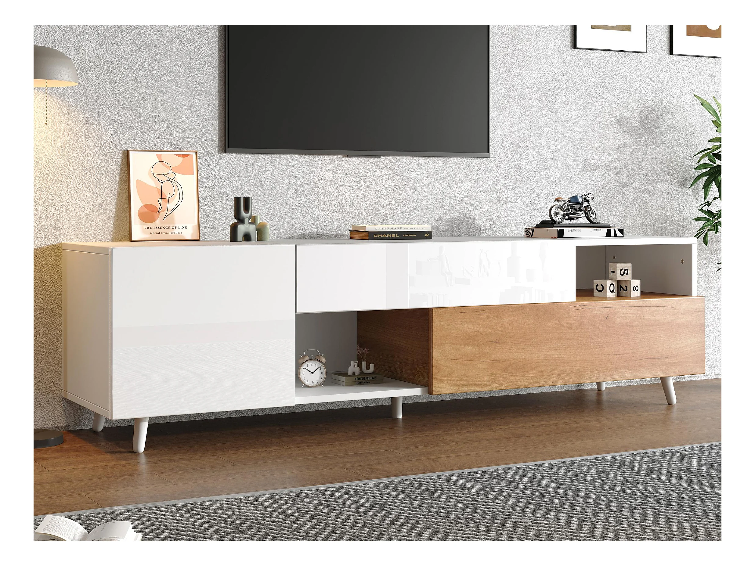 Meuble TV brillant 180x38x50 cm - 2 portes et 1 tiroir - Compatible avec téléviseurs 75 pouces - Blanc et naturel