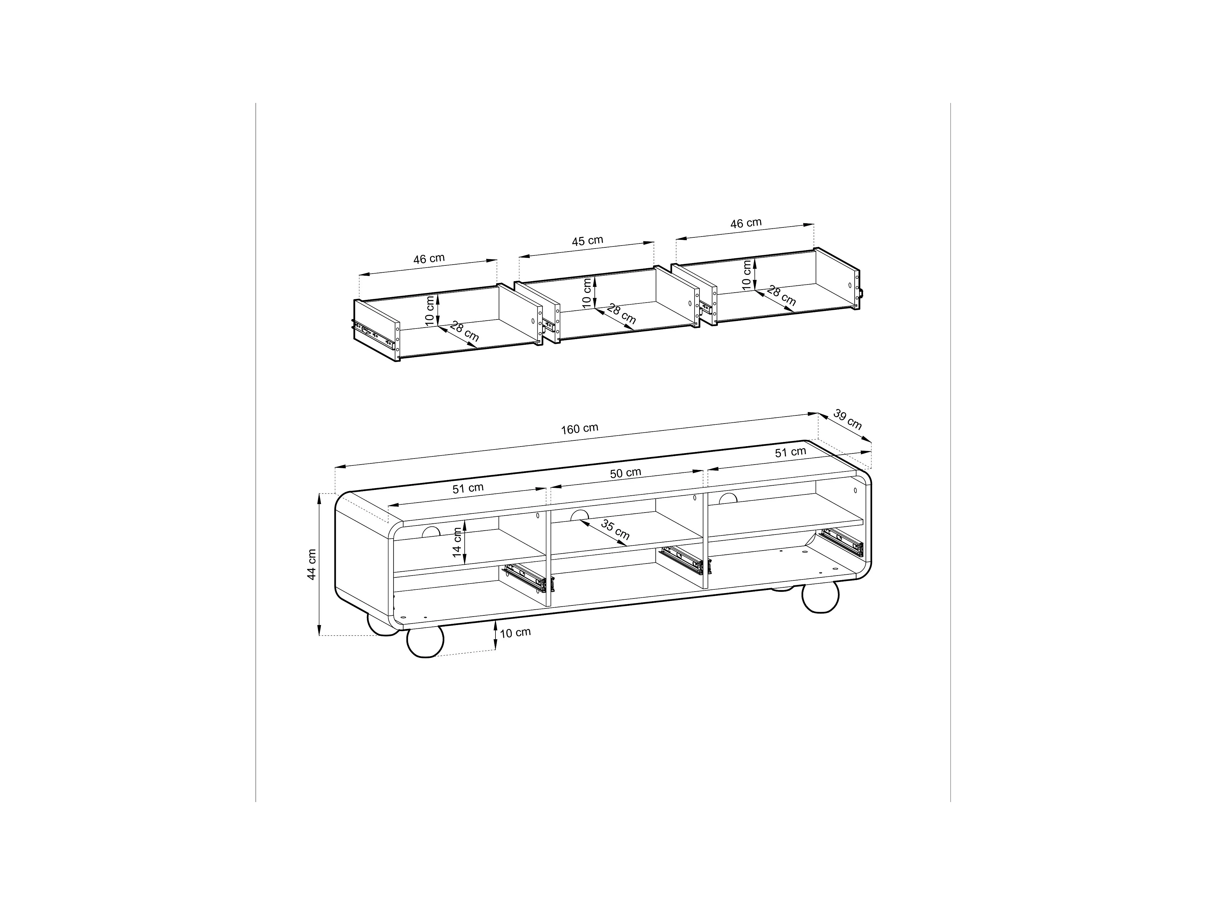 Meuble TV Cachemire, 45 x 140 x 33cm, poignées noires, pieds 15 cm