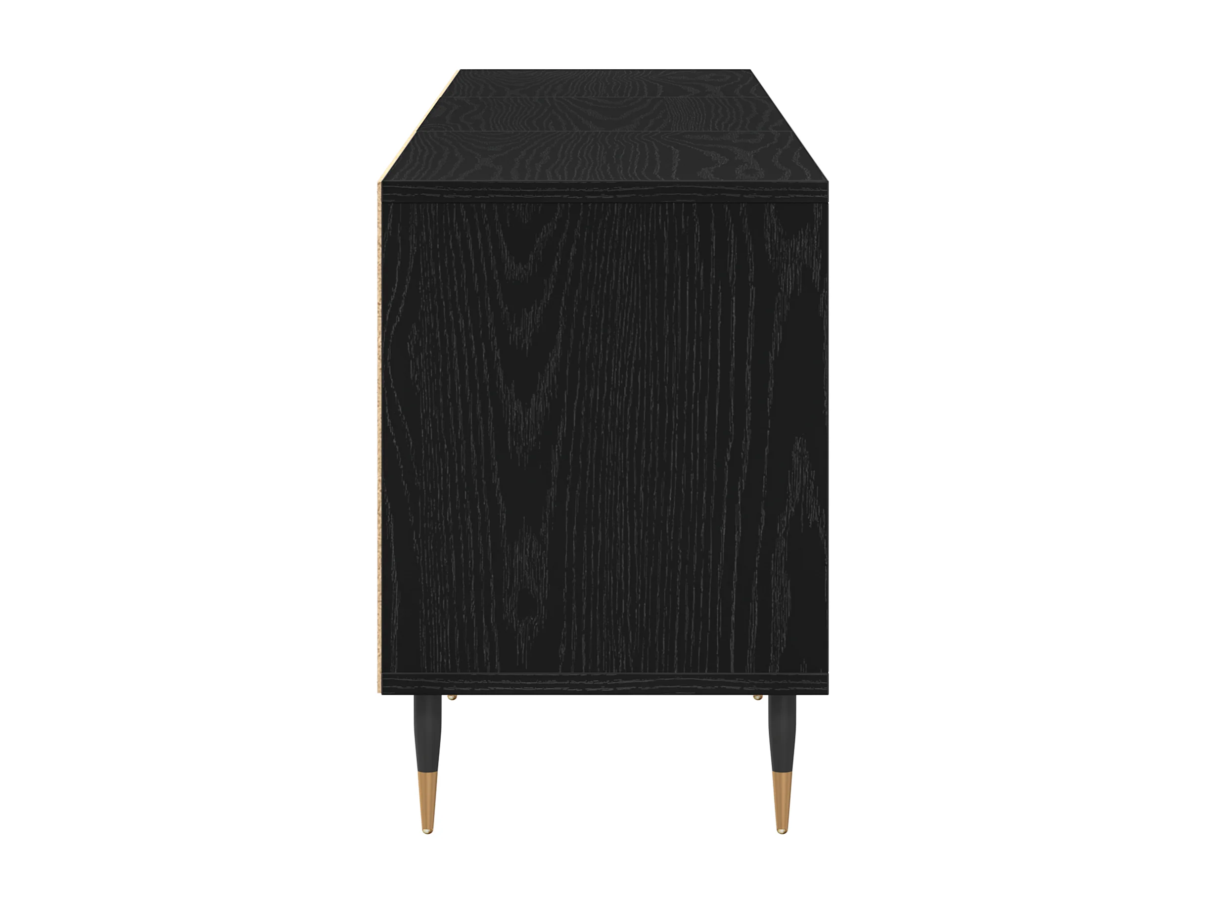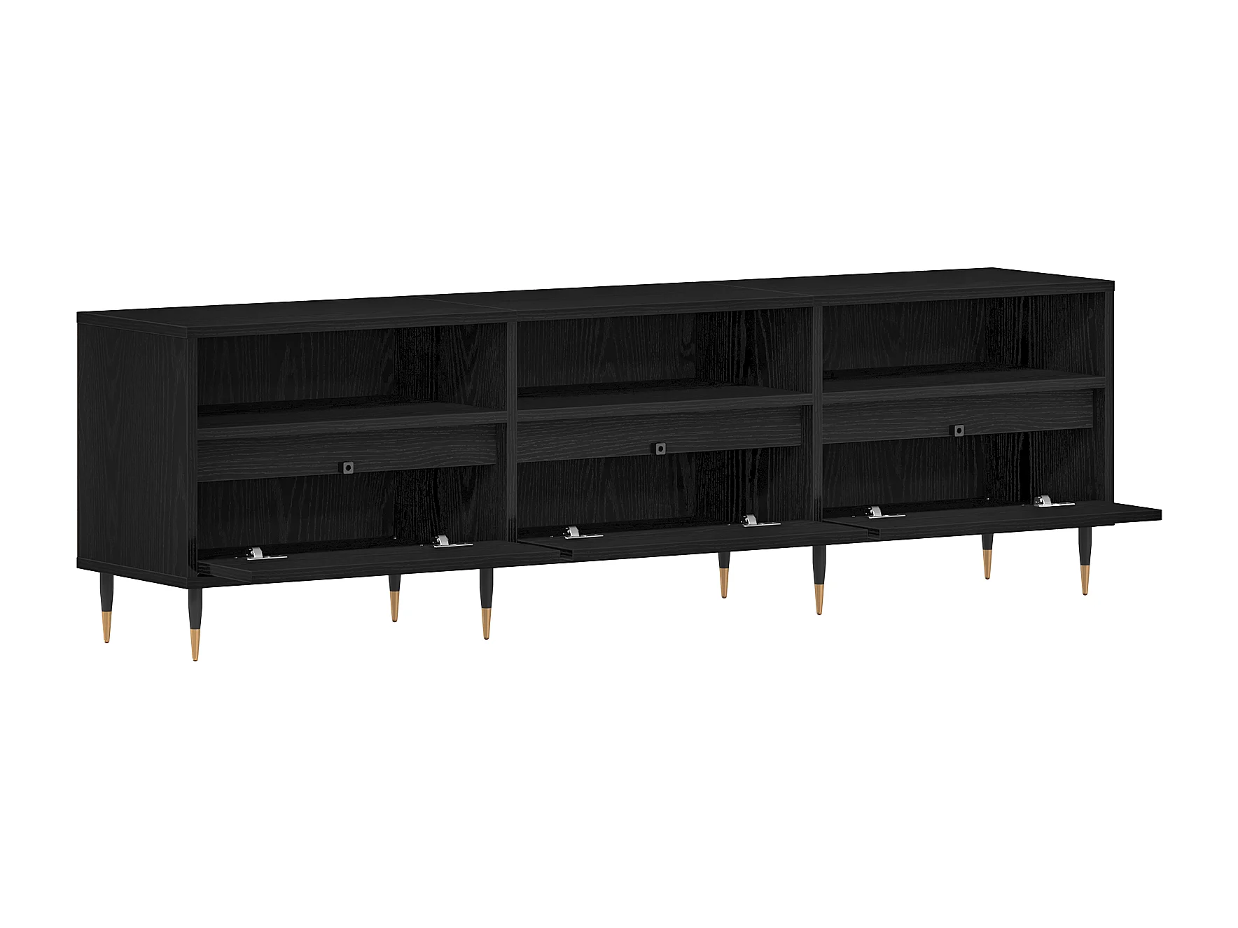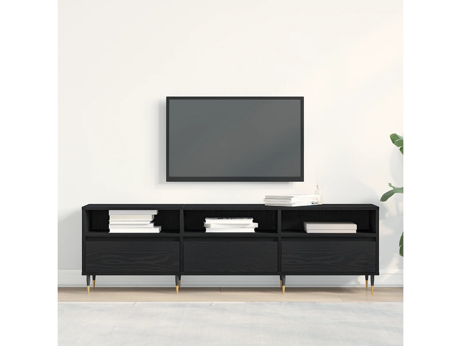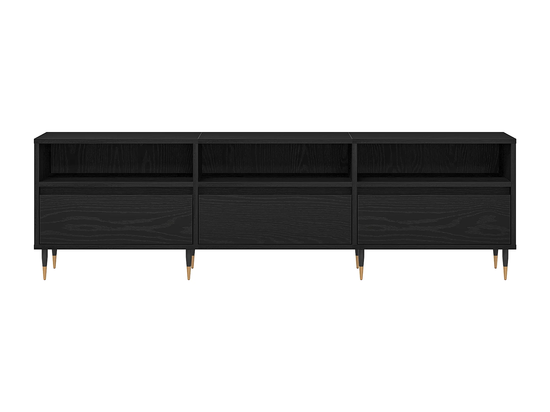 Meuble TV, design moderne, portes texturées, 1 tiroir, 3 portes, pieds dorés, MDF, noir (175x30x46cm)