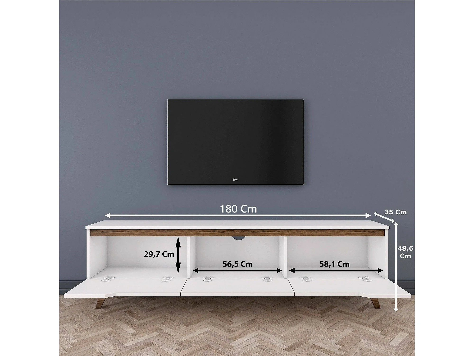 Meuble TV Cor, Buffet de salon, Armoire basse pour TV, Base murale de rangement, 180x35h49 cm, Blanc et Noyer