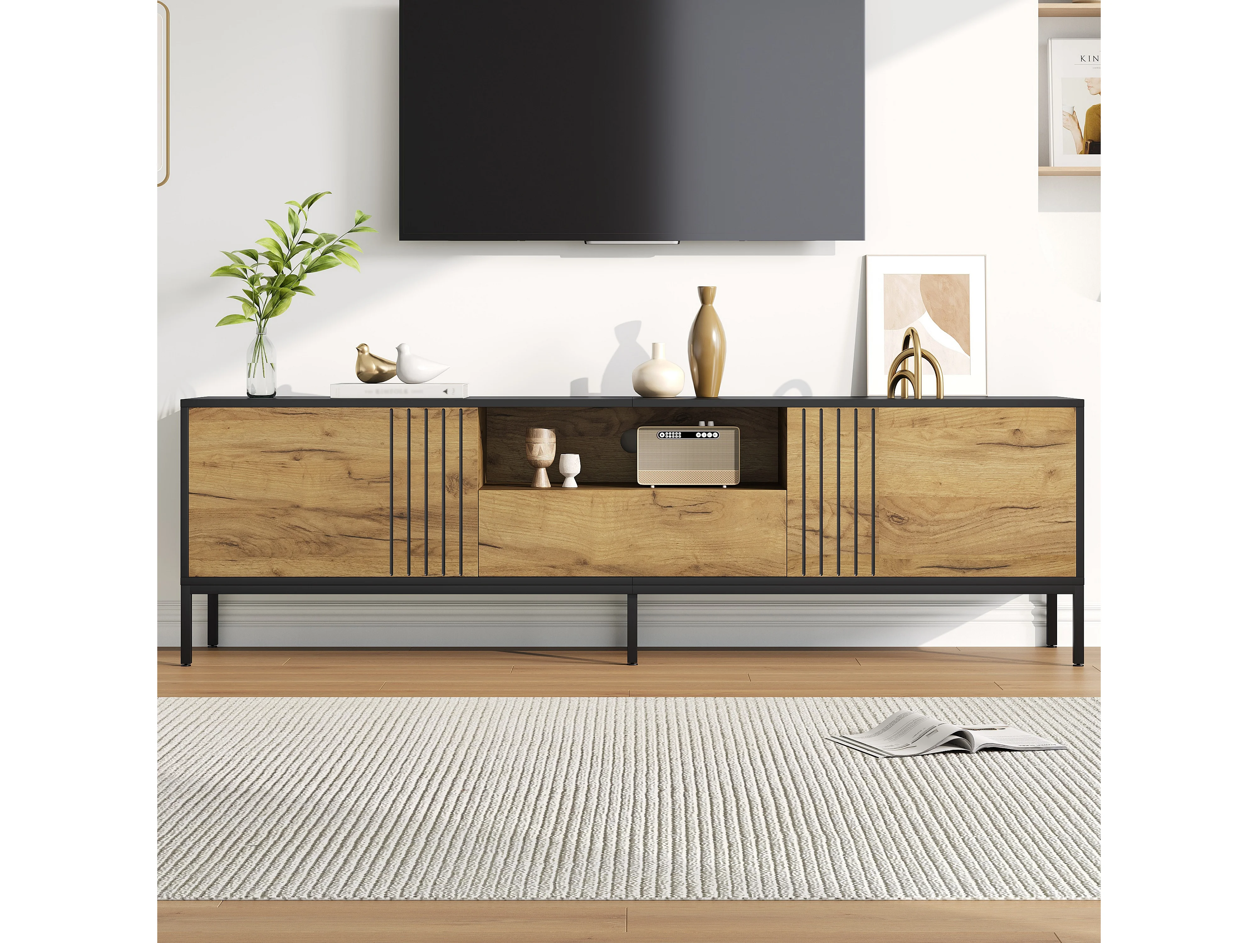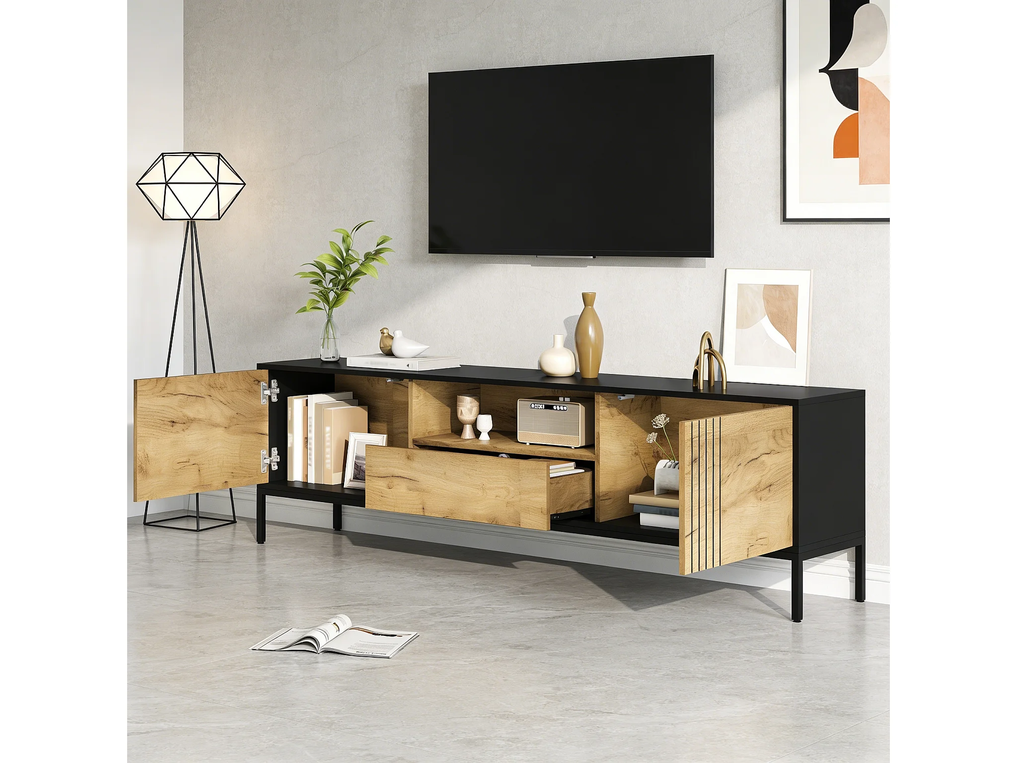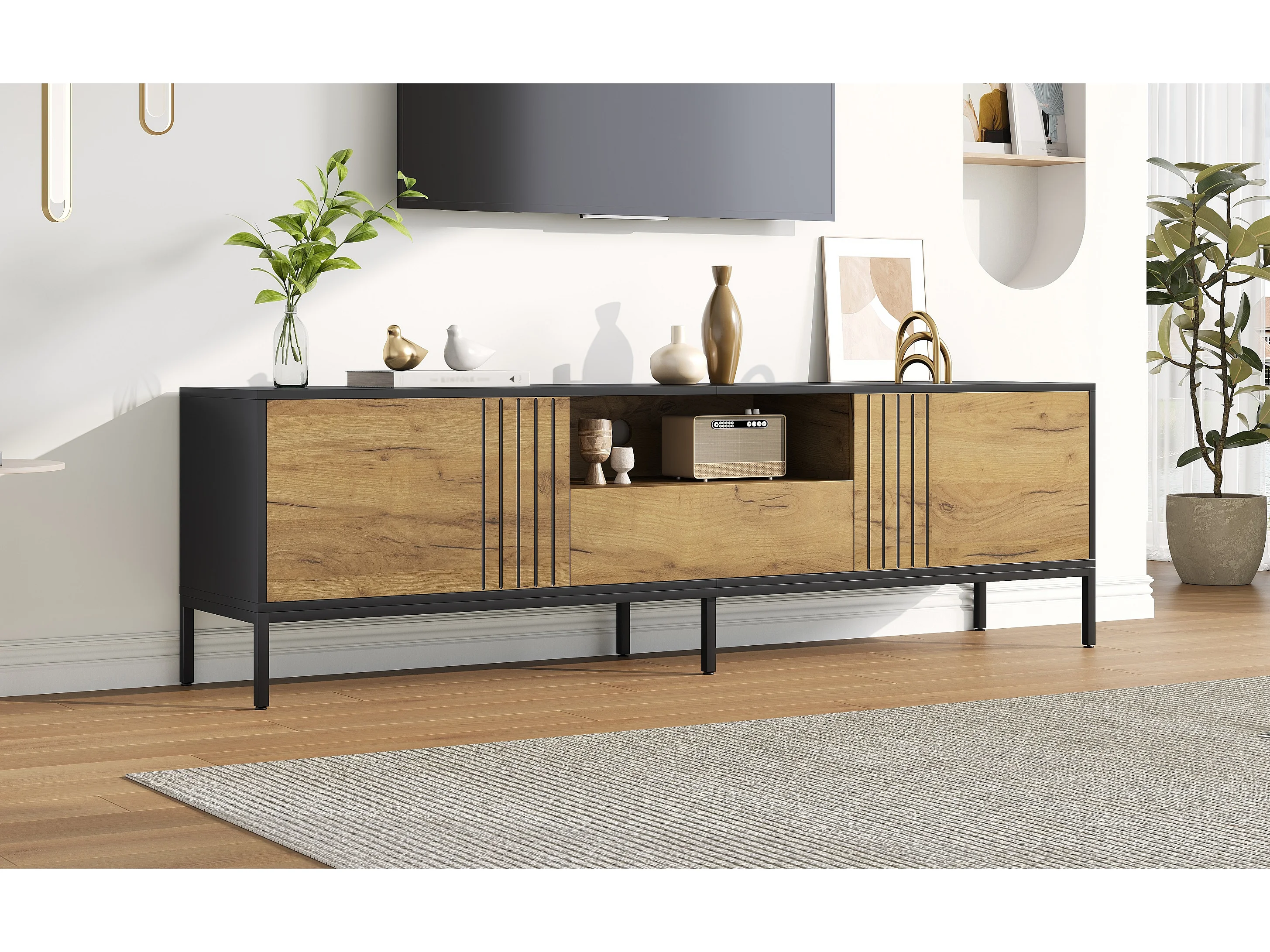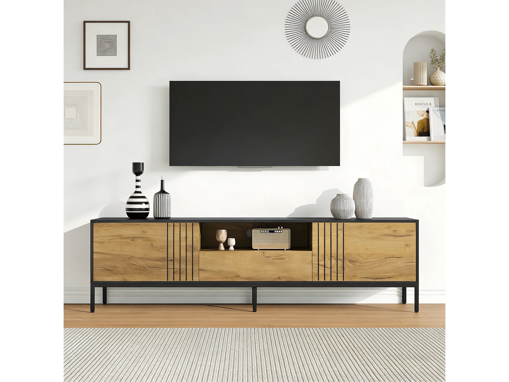 Meuble TV moderne - 200 x 45 x 45 cm - avec 3 portes + compartiments ouverts - aggloméré - naturel