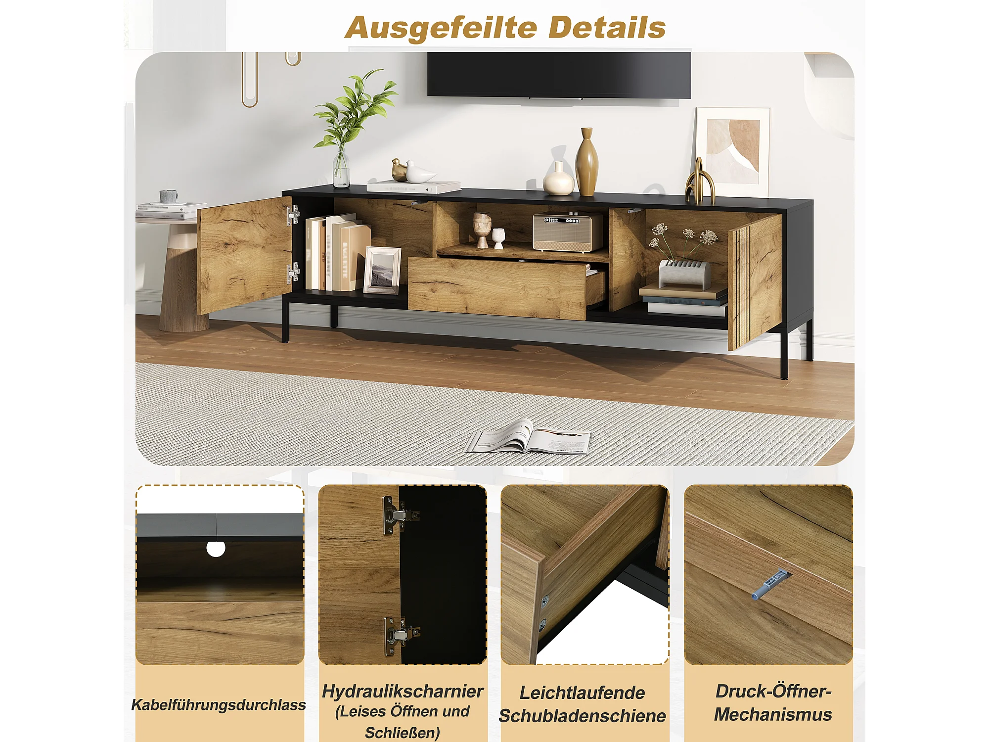 Meuble TV aspect bois - 178 cm x 35 x 45 cm - avec 4 tiroirs - pour le salon - MDF - naturel