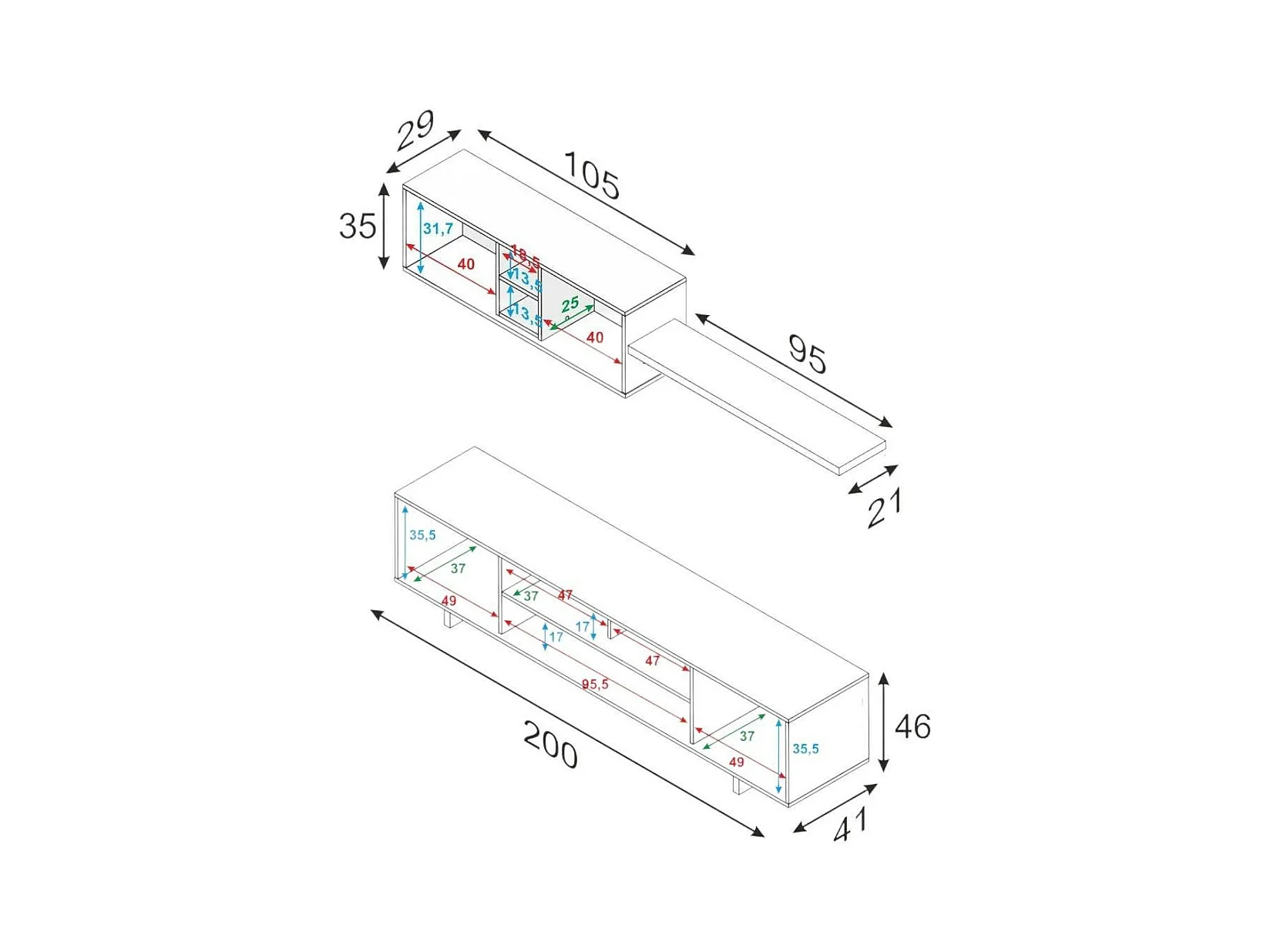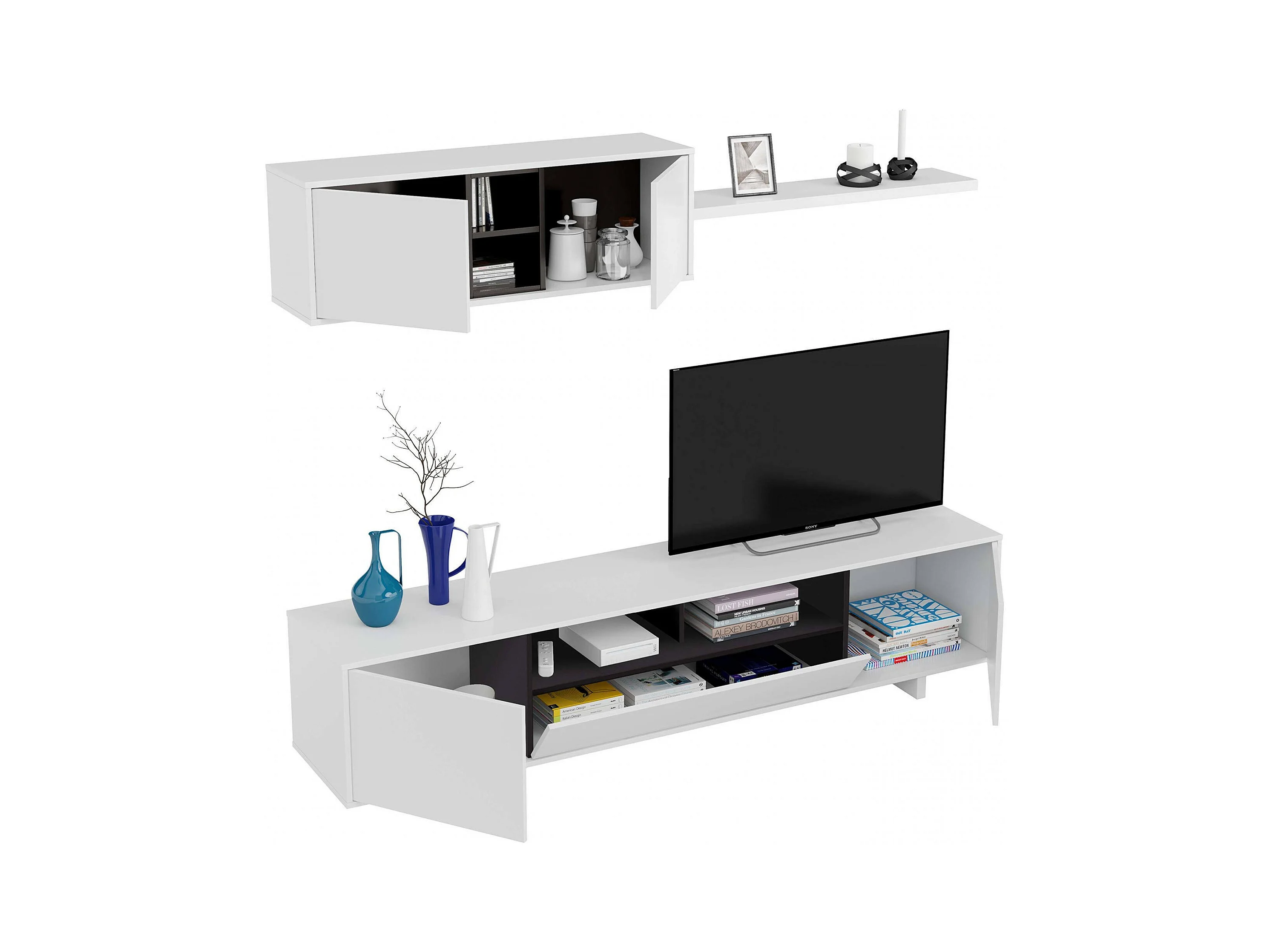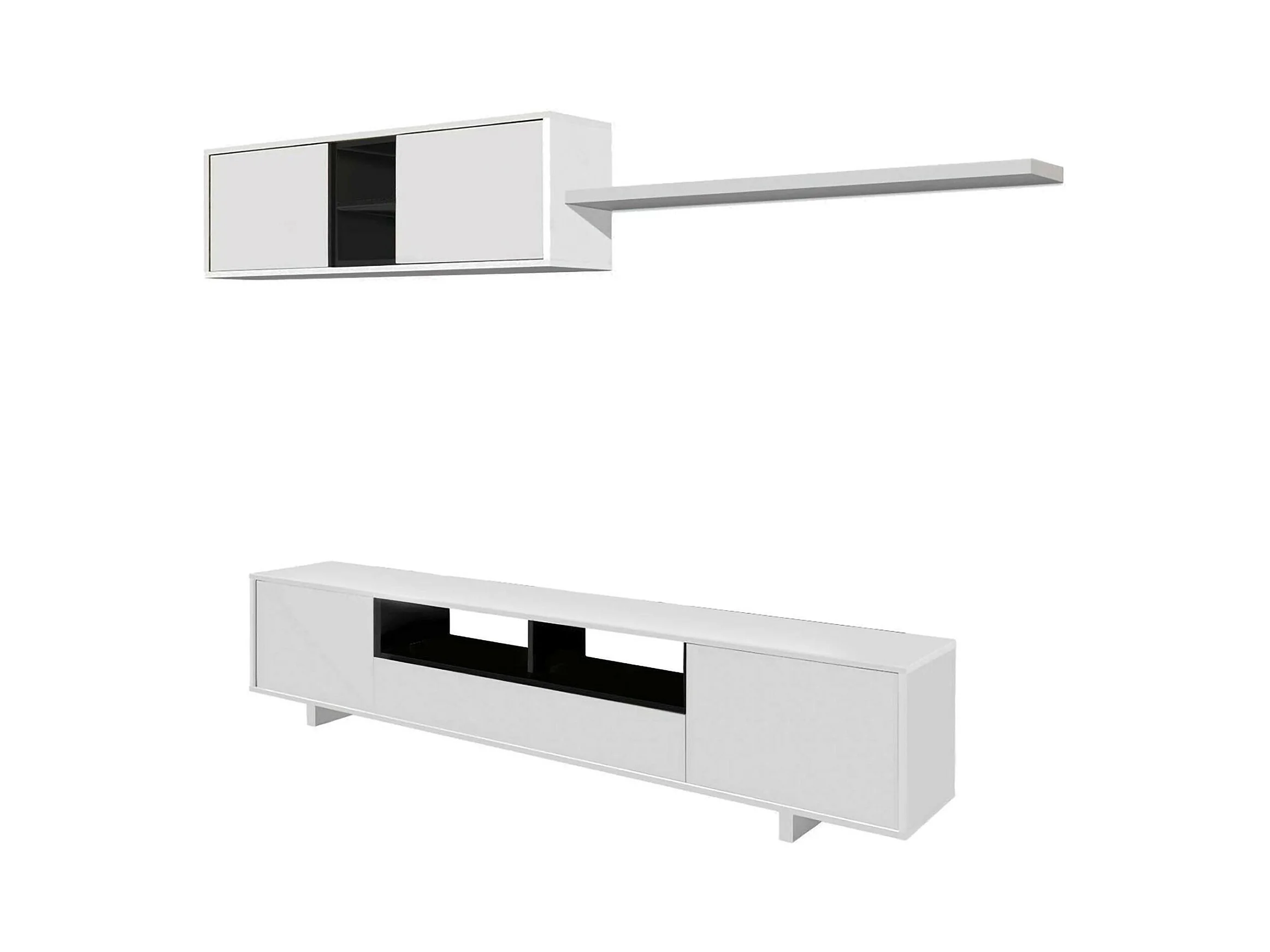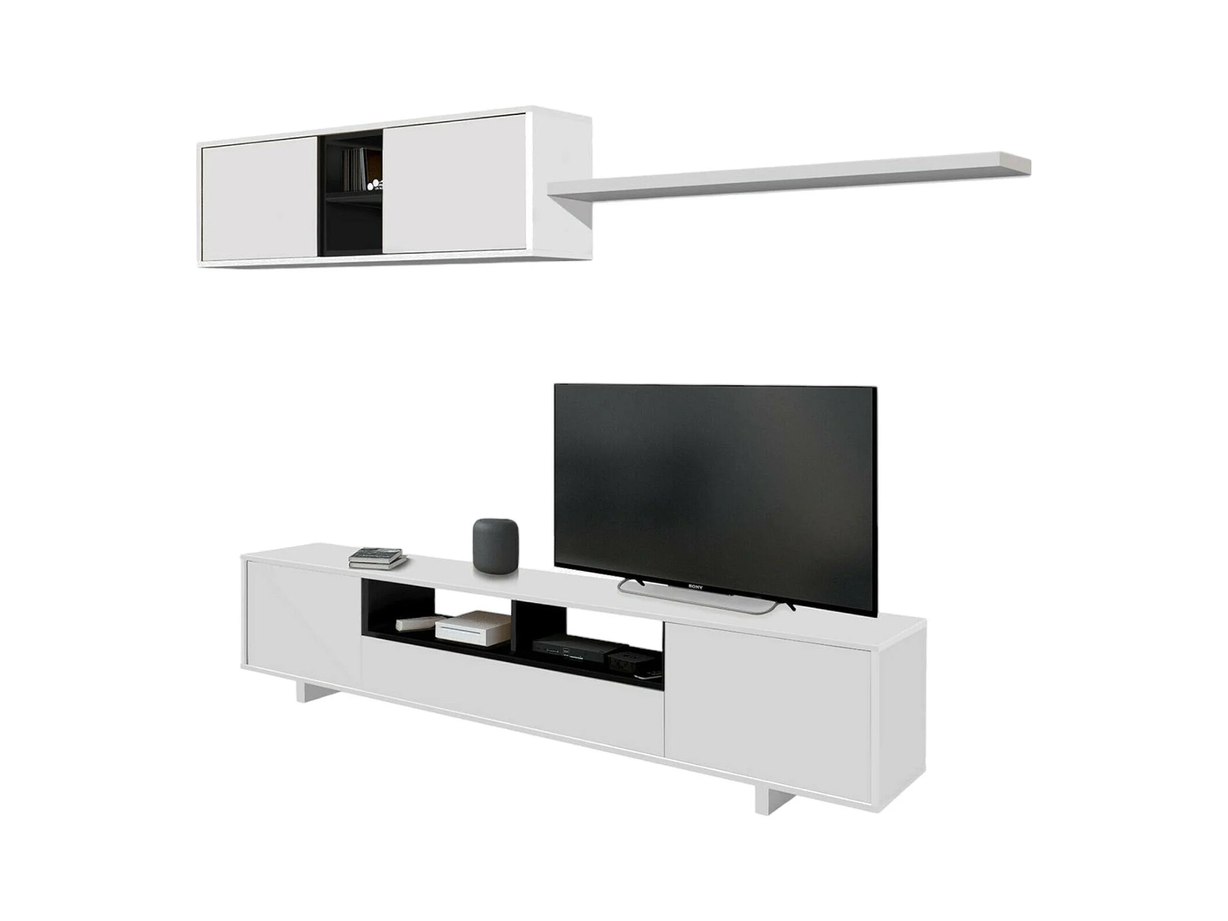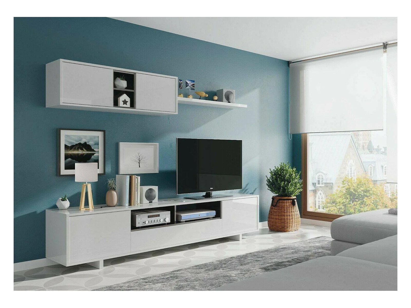 Système mural Hartford, meuble TV, composition d'ensemble de salon, ensemble de salon avec unité murale, 200x41h46 cm, blanc brillant