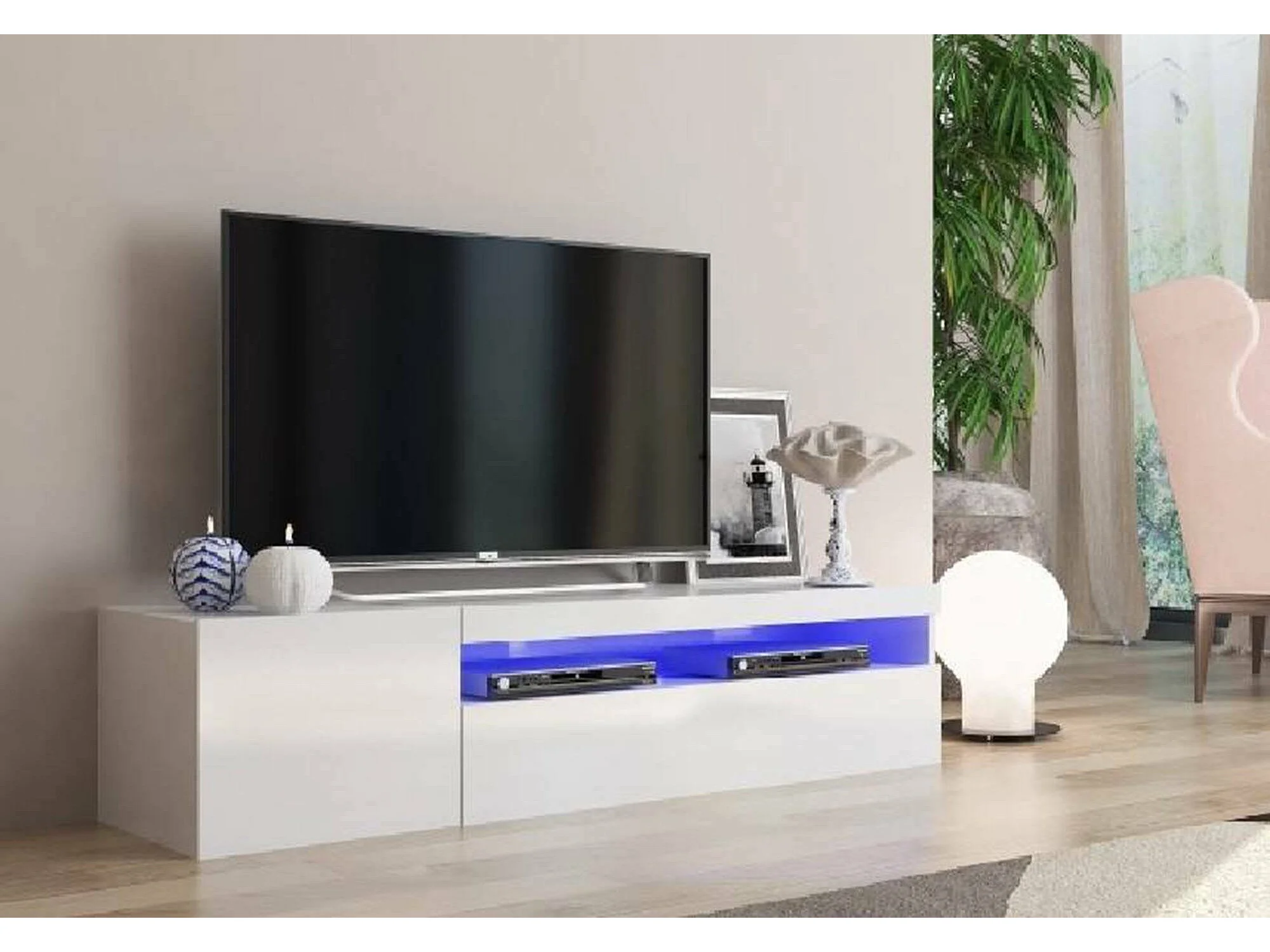 Meuble TV Dmangoni, Buffet bas de salon avec 2 portes, Base pour meuble TV, 100% Made in Italy, 150x40h37 cm, Blanc brillant, avec lumière LED