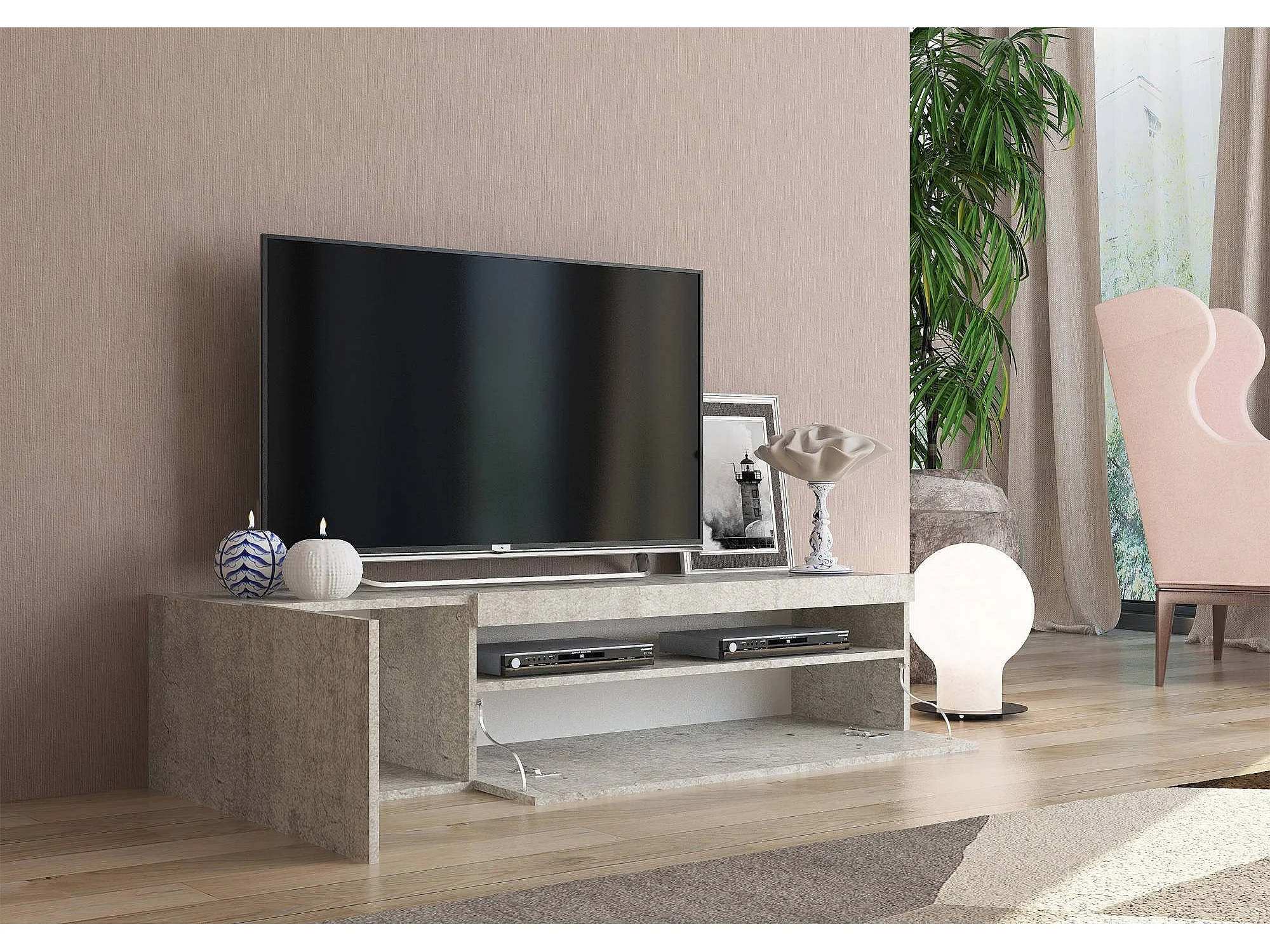 Meuble TV Dmangoni, Buffet bas de salon avec 2 portes, Base pour meuble TV, 100% Made in Italy, 150x40h37 cm, Ciment, avec lumière LED