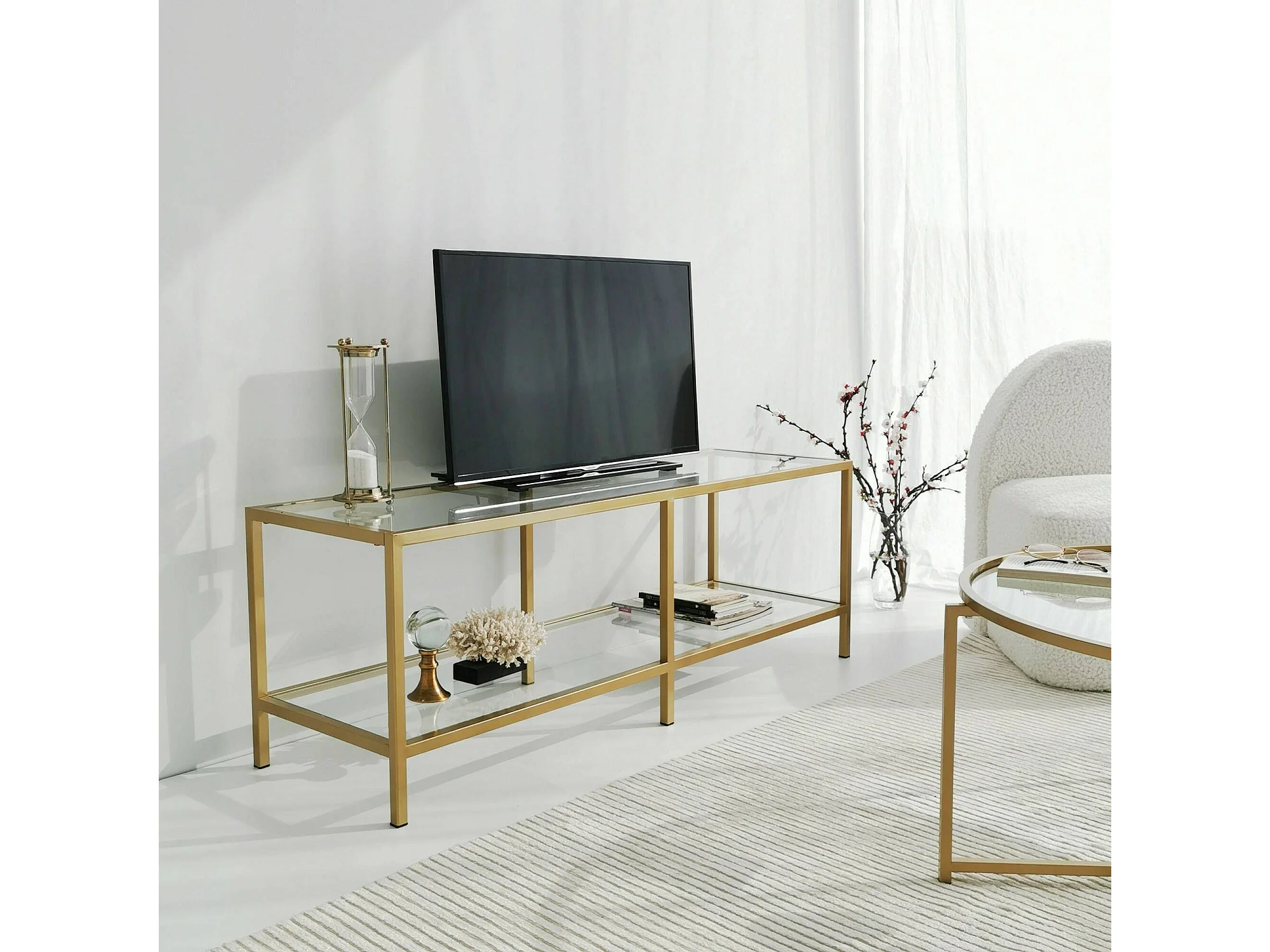 Meuble TV Electra, Buffet de salon, Armoire basse pour TV, Base murale de rangement, 130x40h45 cm, Or