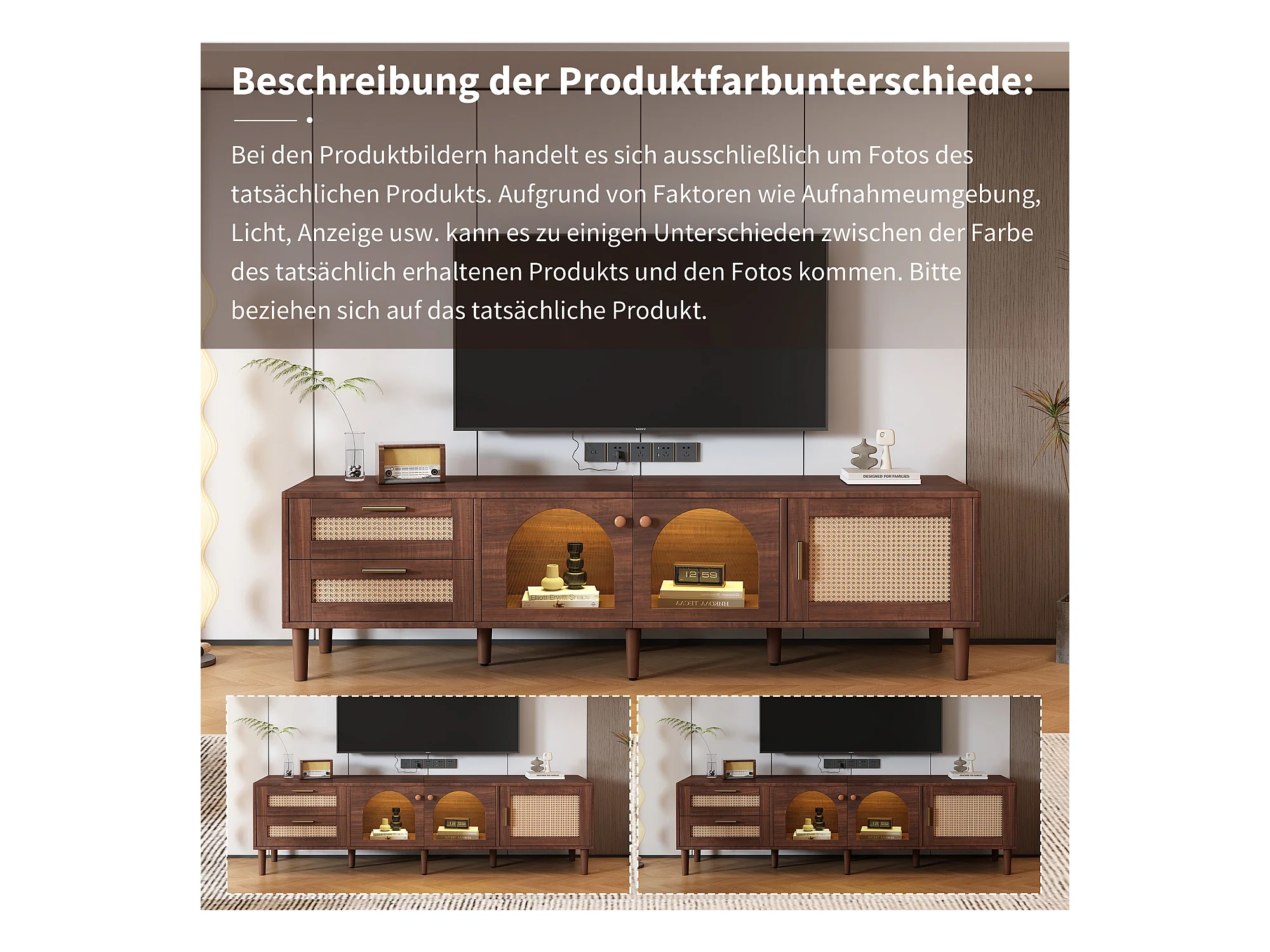 Meuble TV en bois brun avec 2 tiroirs en rotin, 2 portes en verre incurvées, 1 porte en rotin, éclairage LED, design moderne (180x40x50cm)