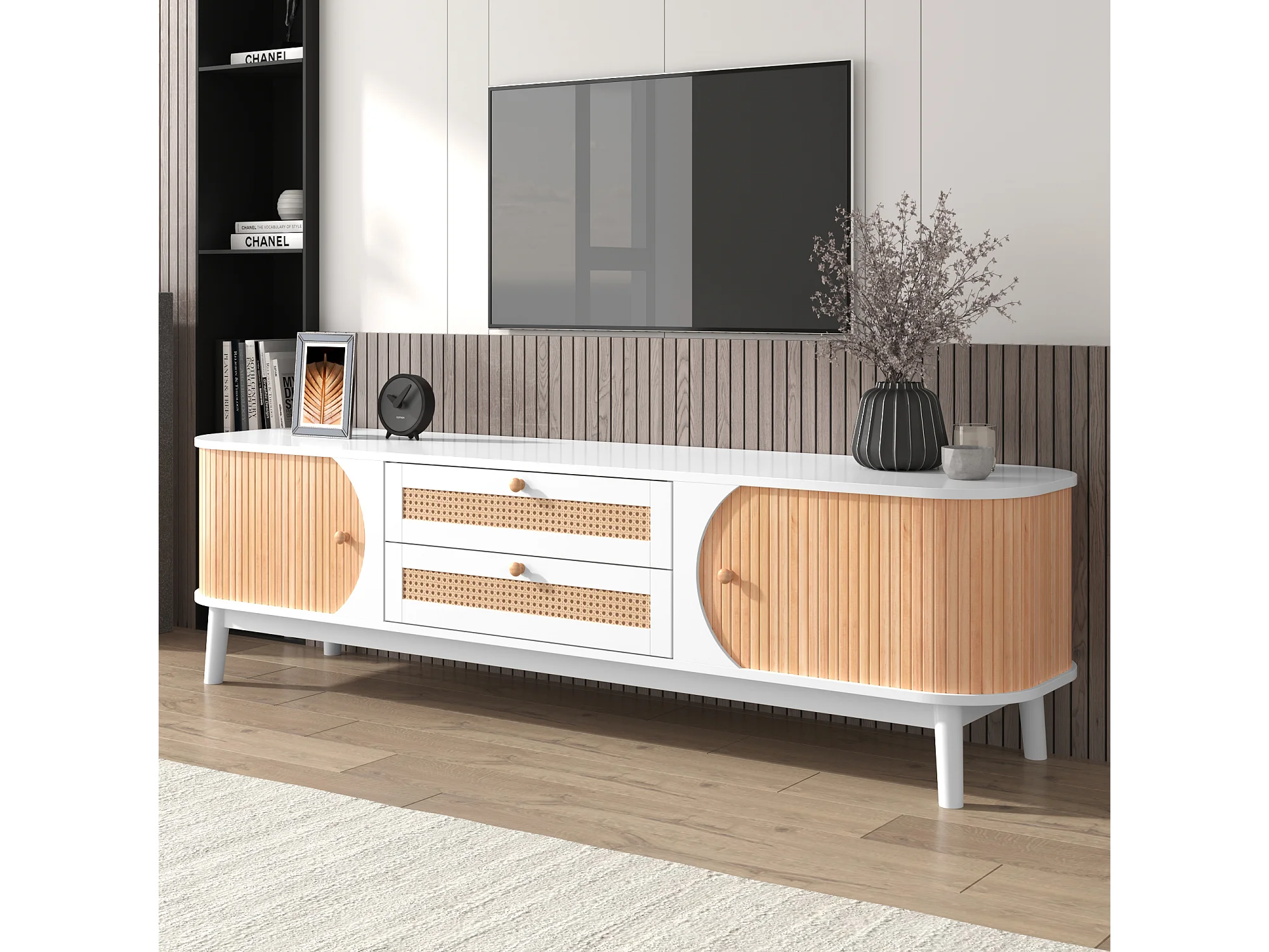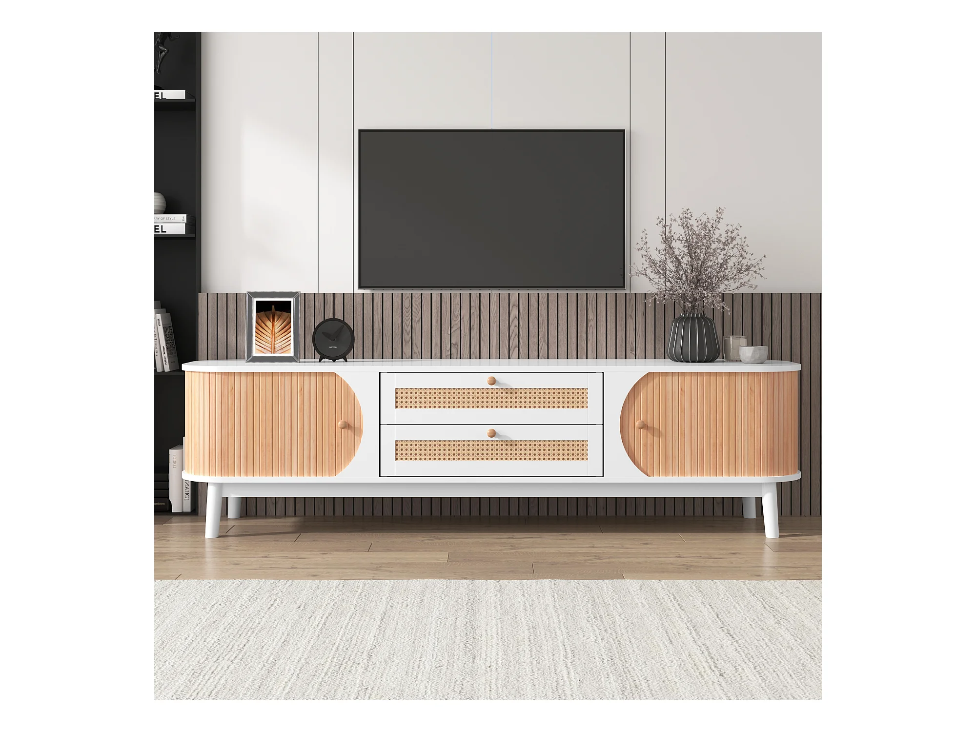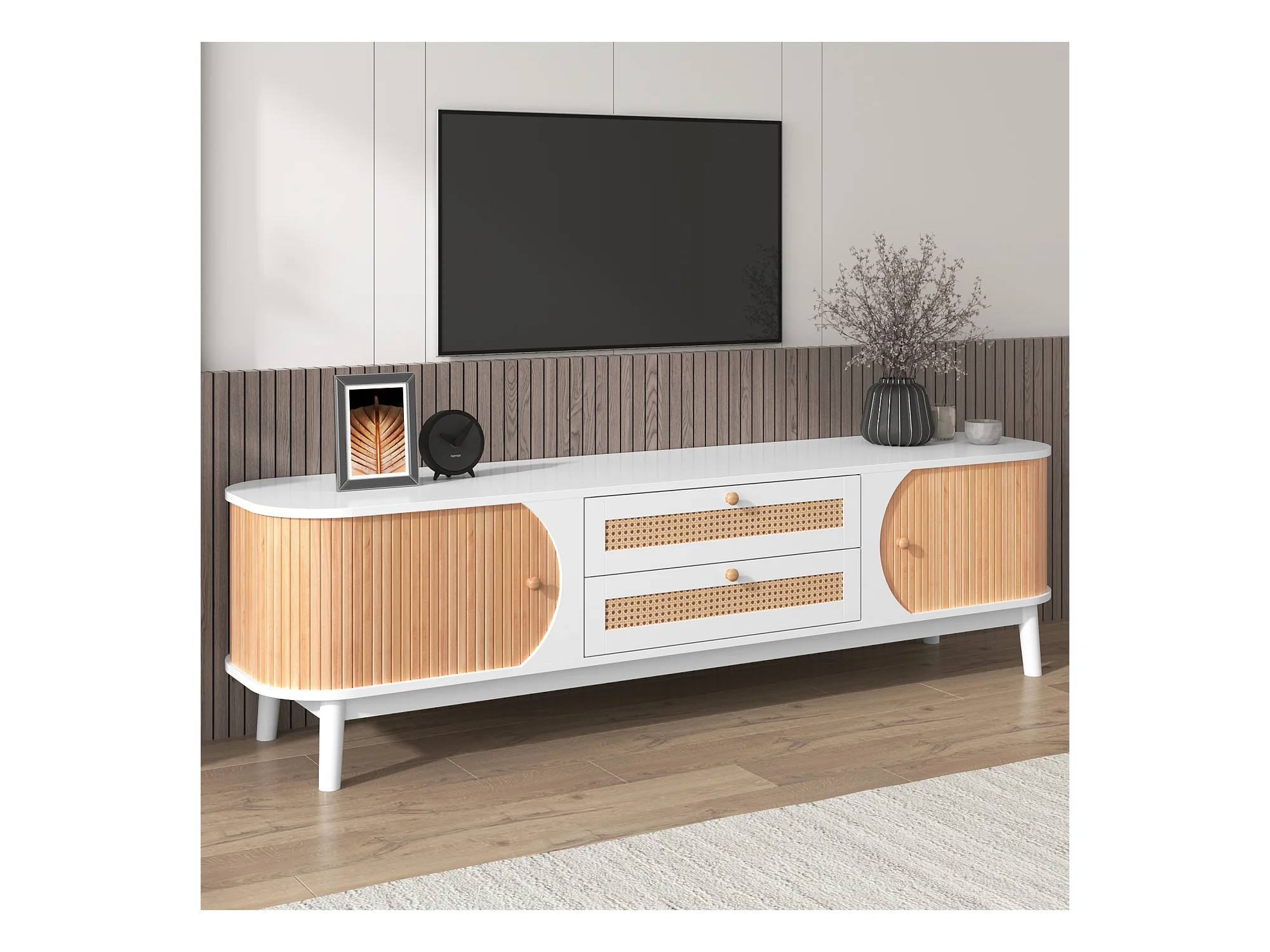 Meuble TV en bois naturel, avec portes et tiroirs en rotin, solution de rangement, style rustique, MDF, blanc, (170x39.5x46cm)