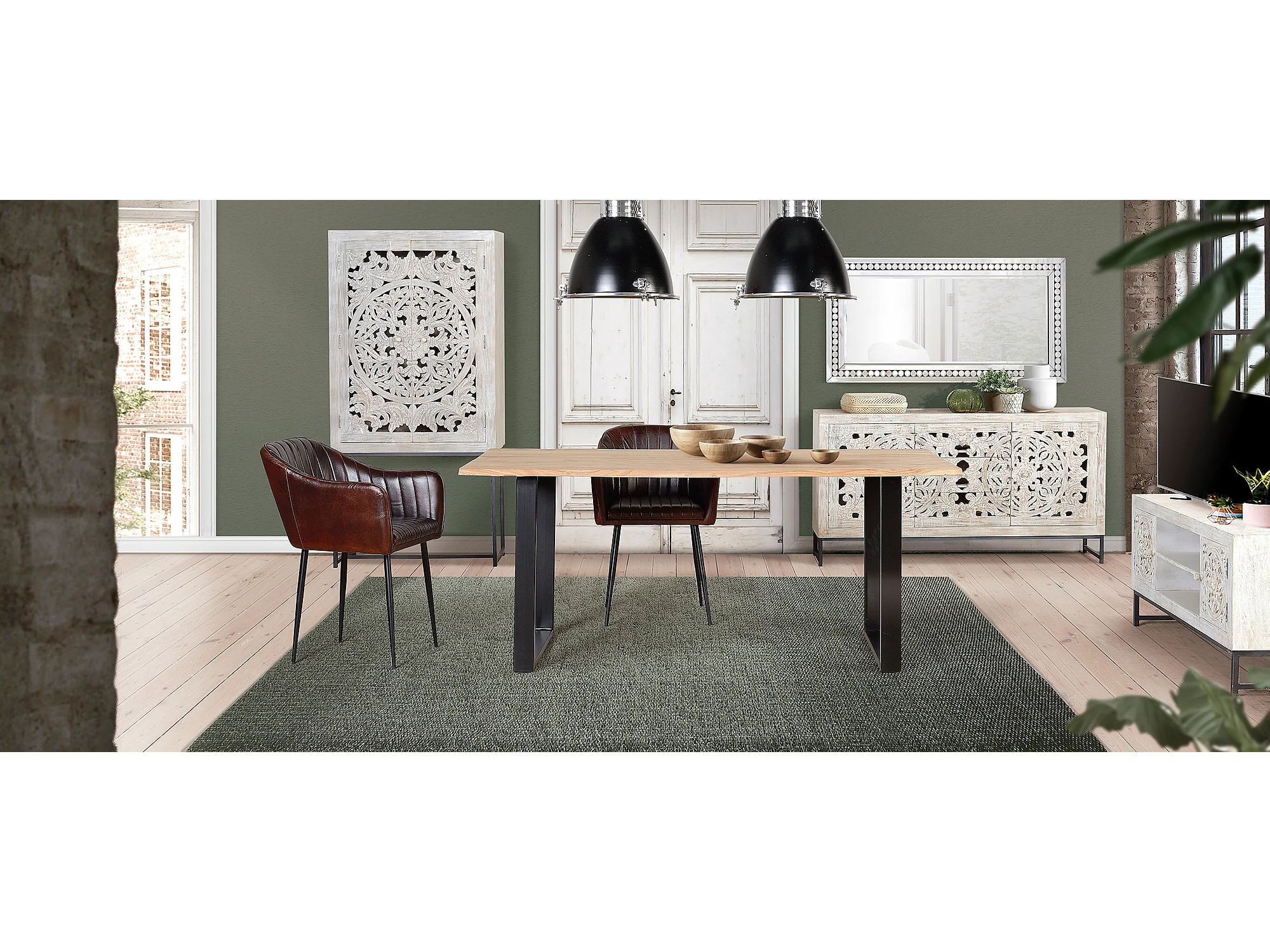 Meuble TV manguier et pieds métal blanc vieilli