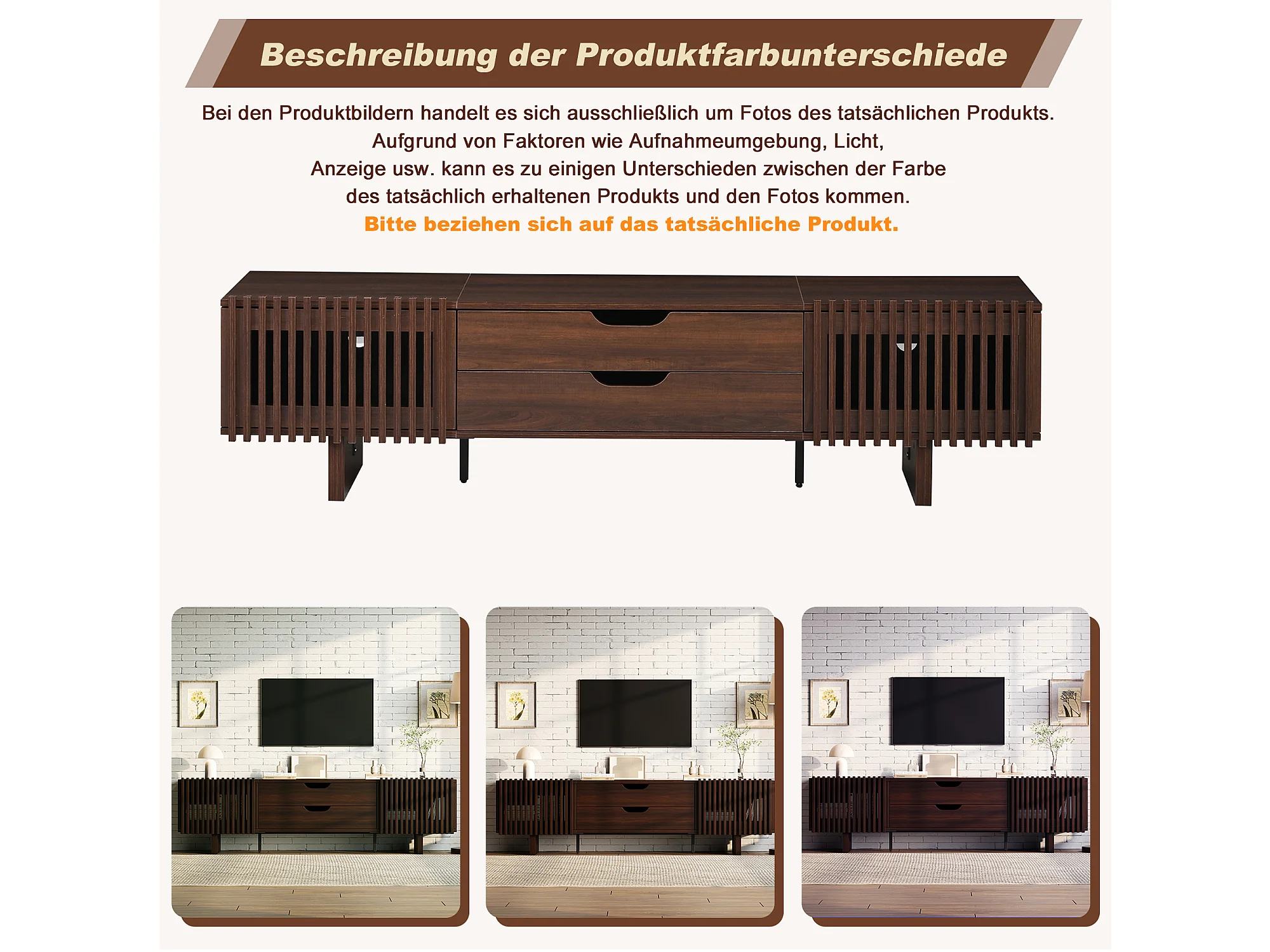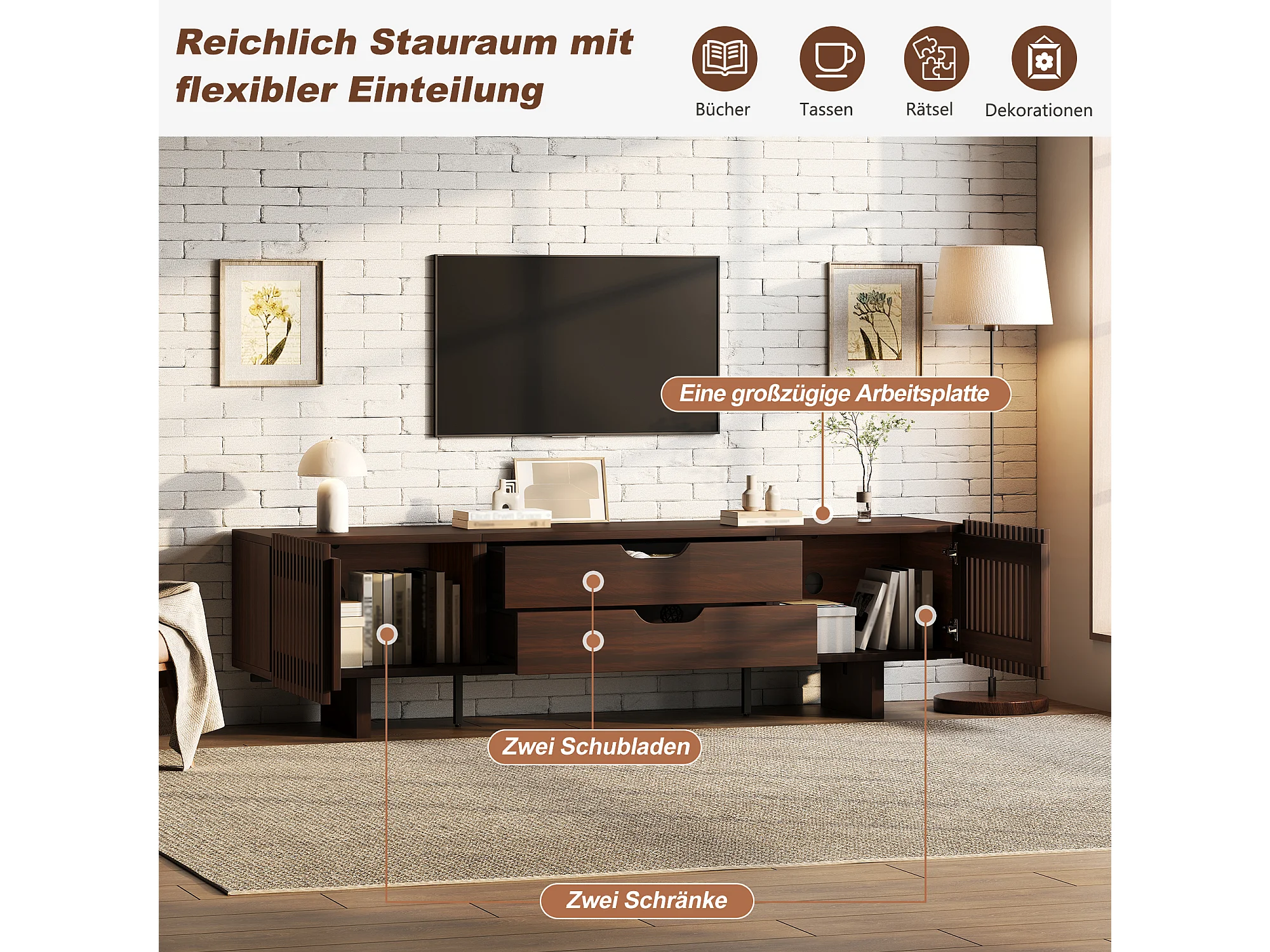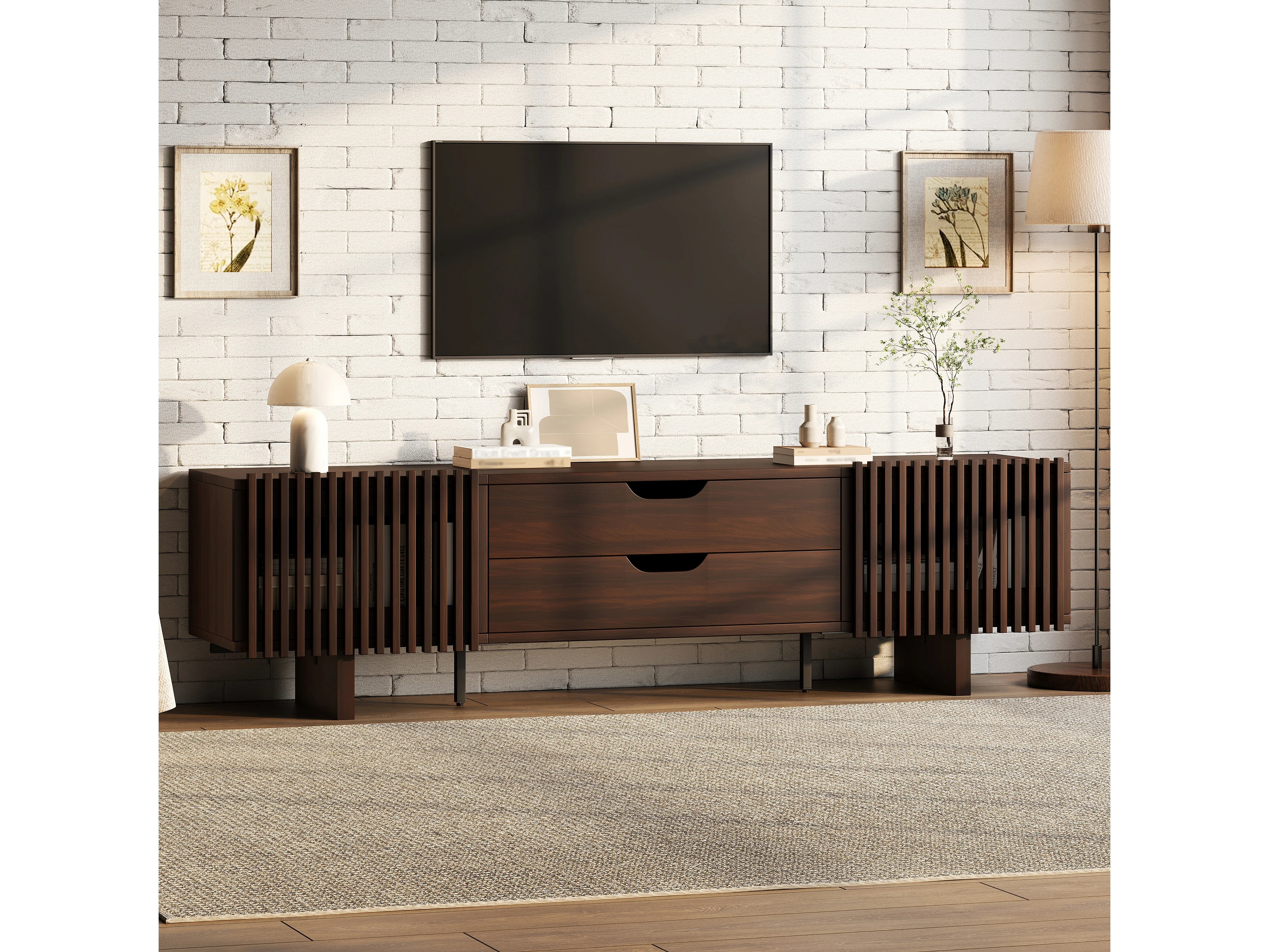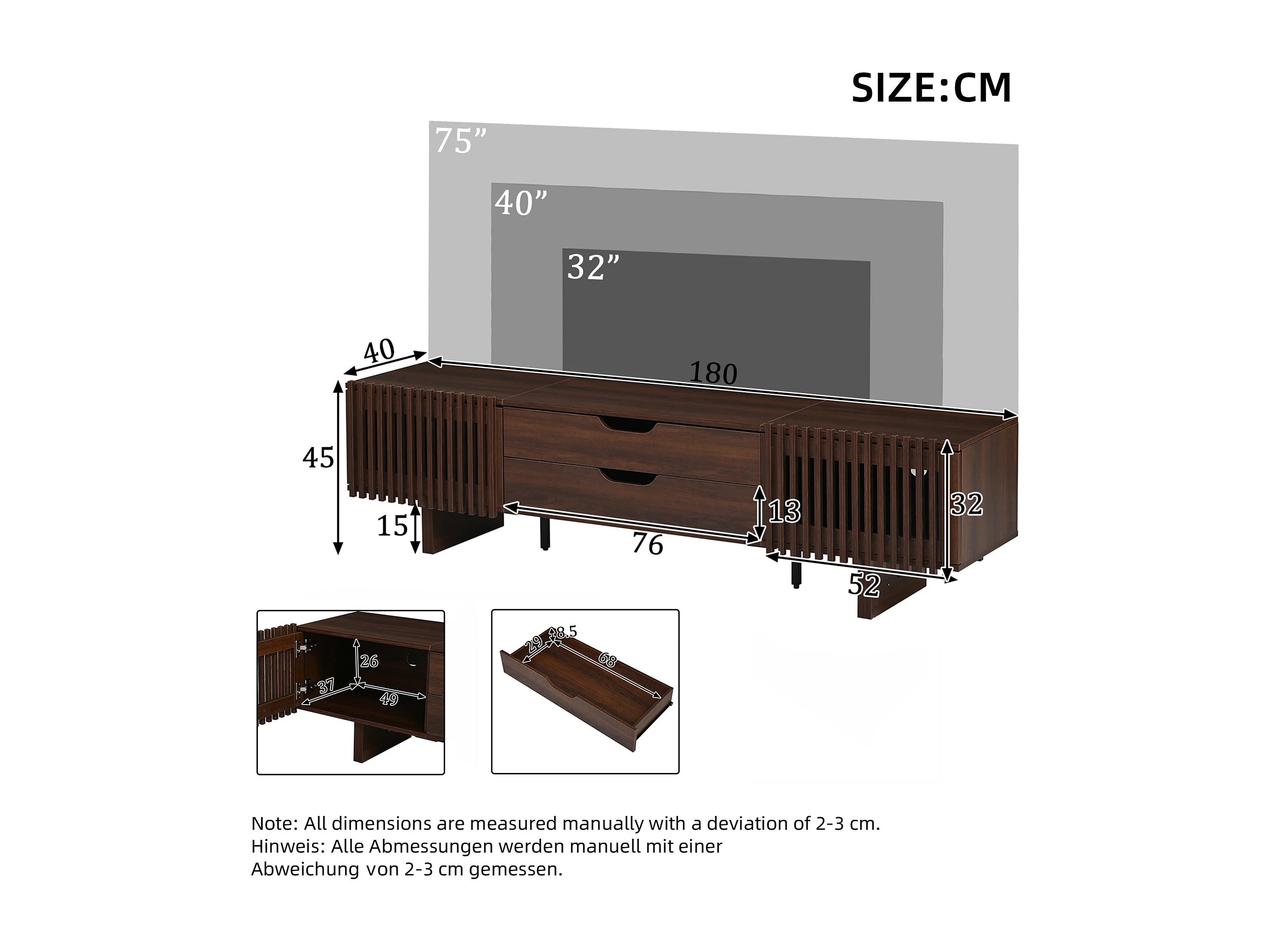 Meuble TV en noyer foncé - 180 x 40 x 45 cm - avec 2 tiroirs + 2 portes - pour TV 75 pouces - MDF