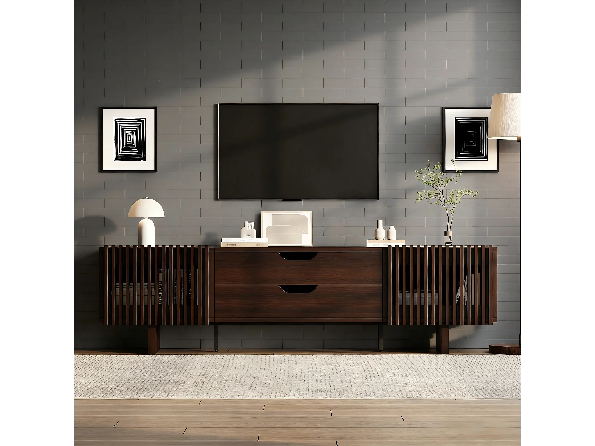Meuble TV ovale à rayures verticales - 180 x 40 x 45 cm - avec 4 tiroirs + 2 portes coulissante - MDF - noyer foncé