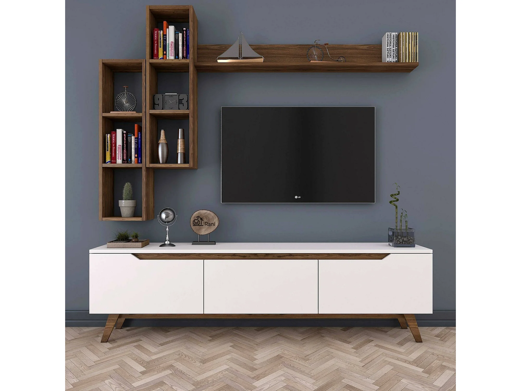 Meuble TV Erato, Buffet de salon, Armoire basse pour TV, Base murale de rangement, 180x35h49 cm, Blanc et Noyer