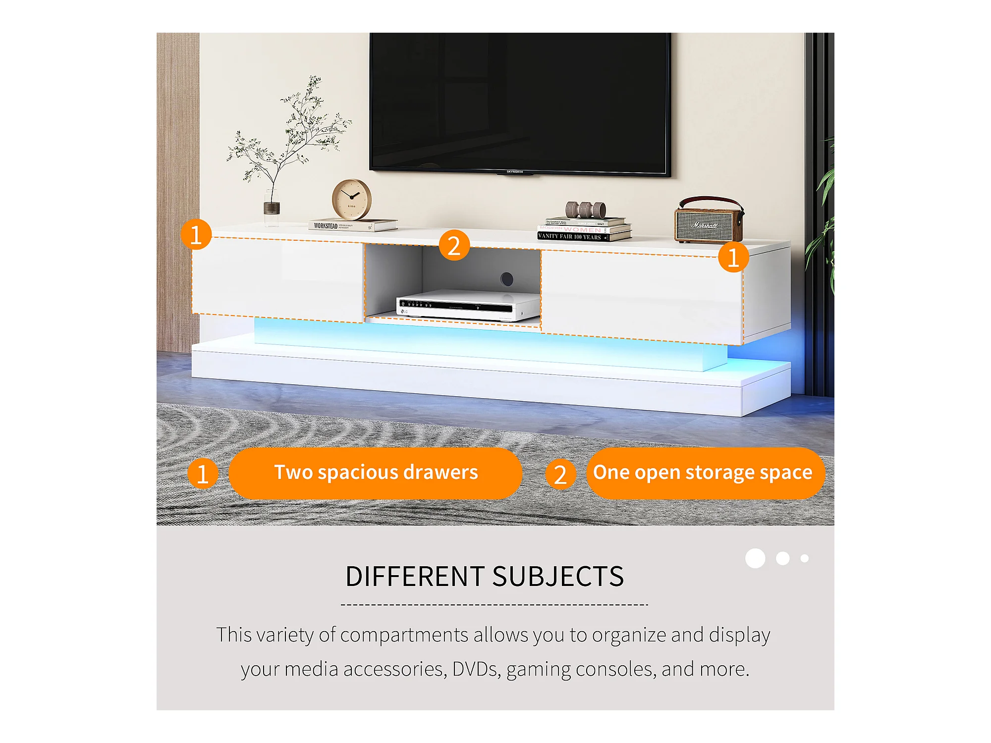 Meuble TV Haut Brillant, LED, 160cm, 2 tiroirs, Contrôle via application, Design Anti-basculement, Blanc (160x35x40.5cm)