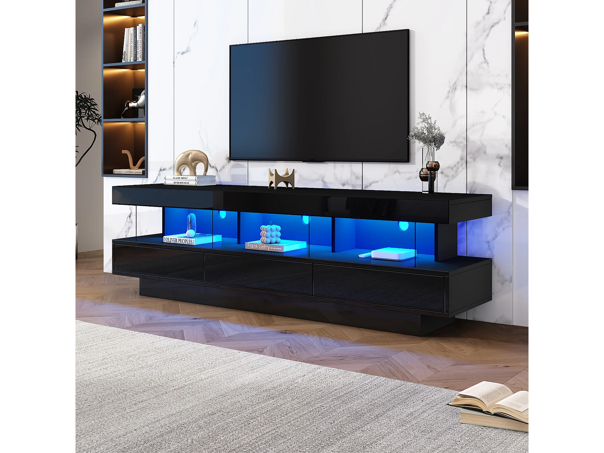 Meuble TV haut de gamme avec LED, 3 étagères en verre, contrôle via application, Bluetooth, pour TV de 60-69 pouces, noir (160x38x50.5 cm)