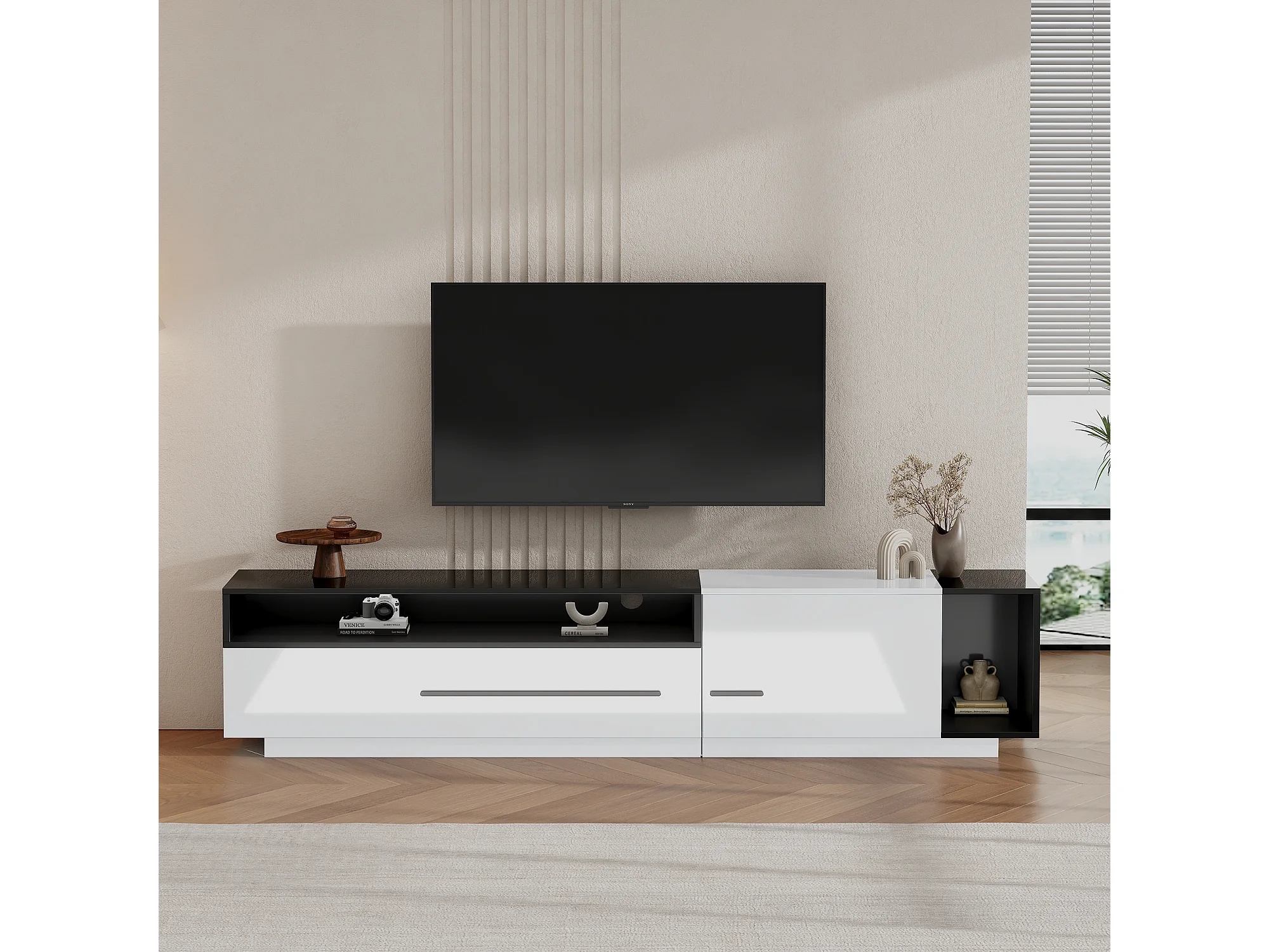 Meuble TV haut de gamme avec tiroir et porte, design moderne, noir et blanc, pour TV jusqu'à 70 pouces (170x38x42.3 cm)
