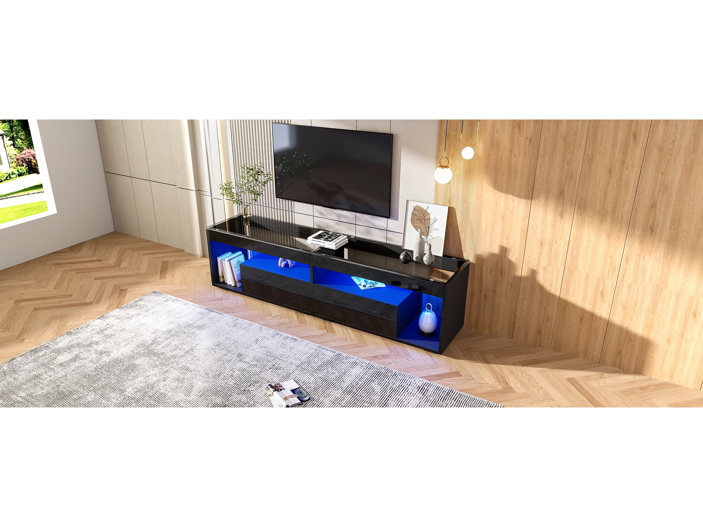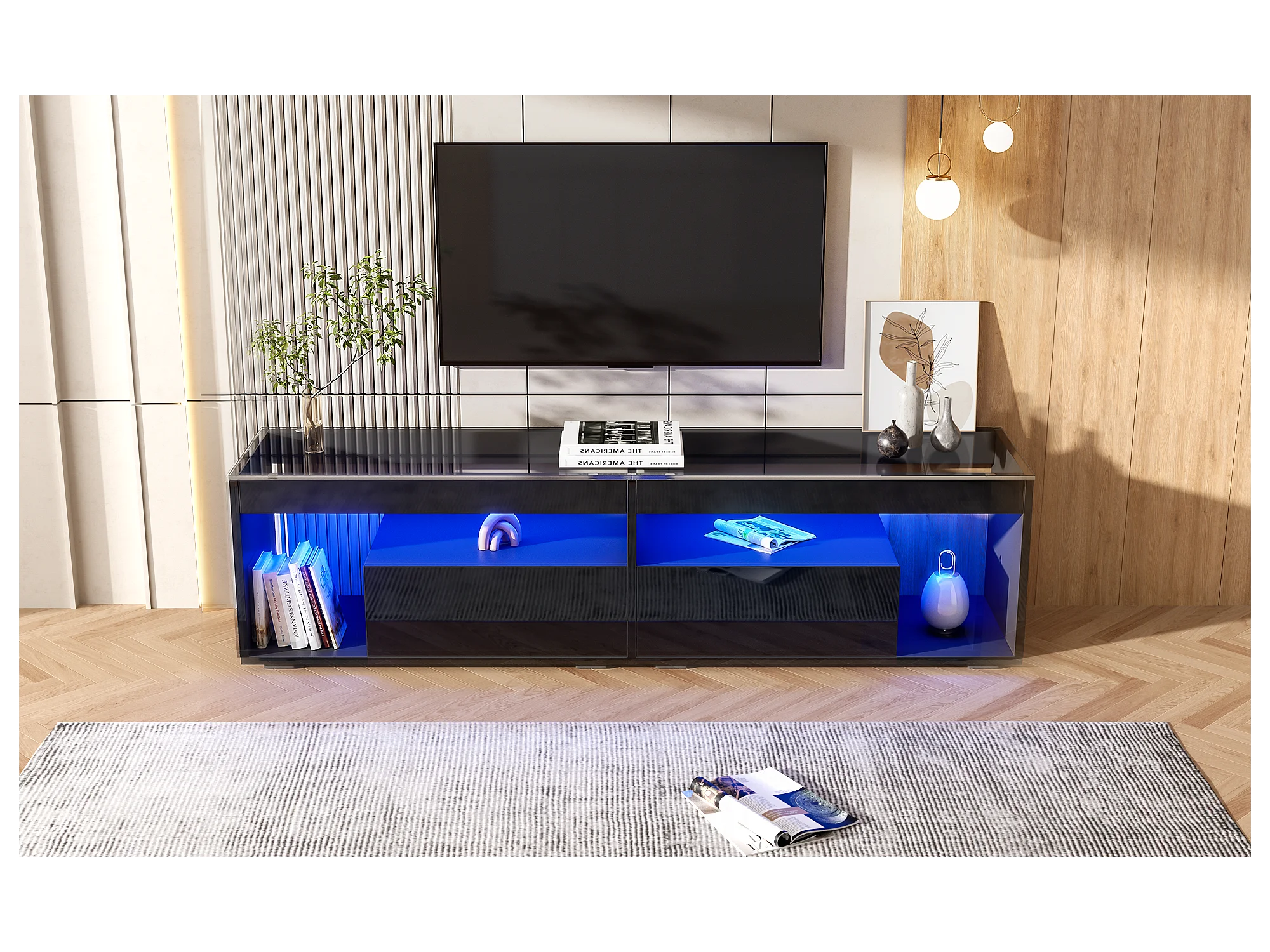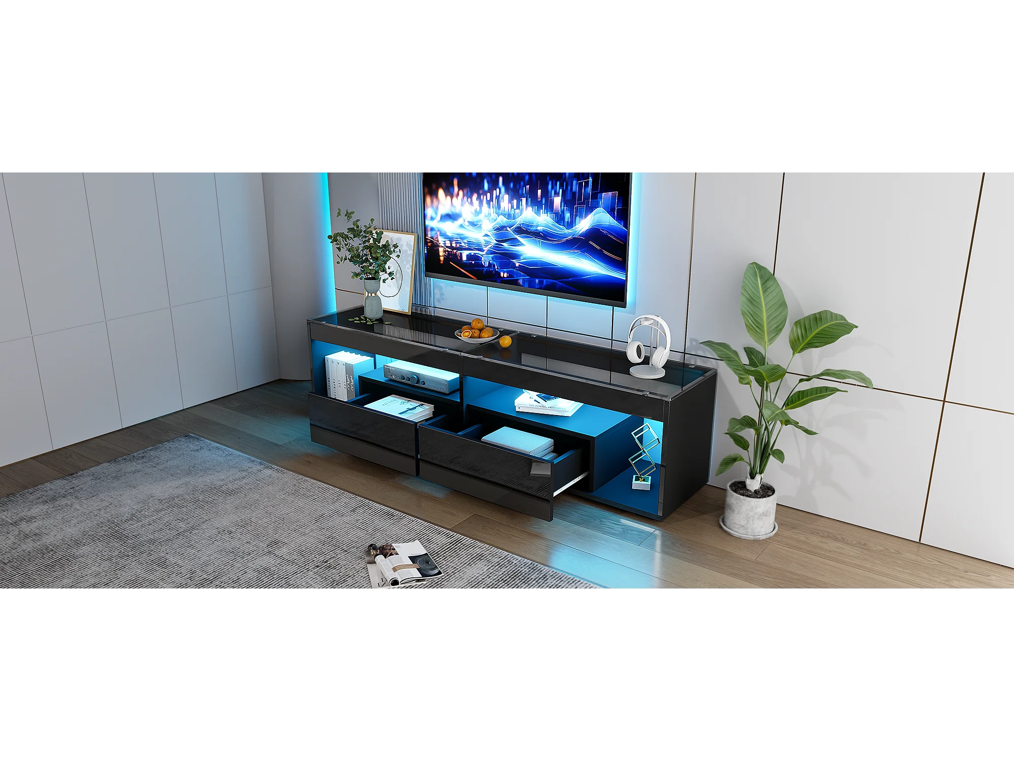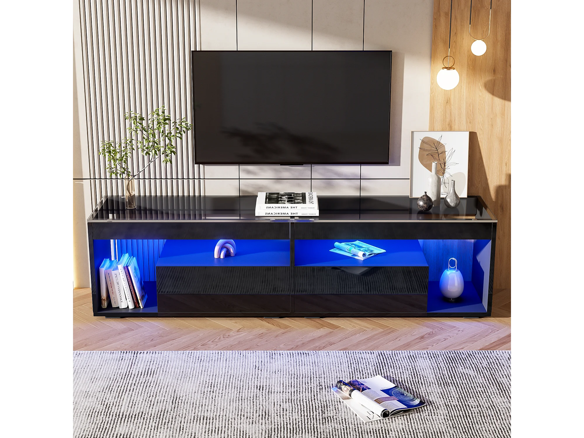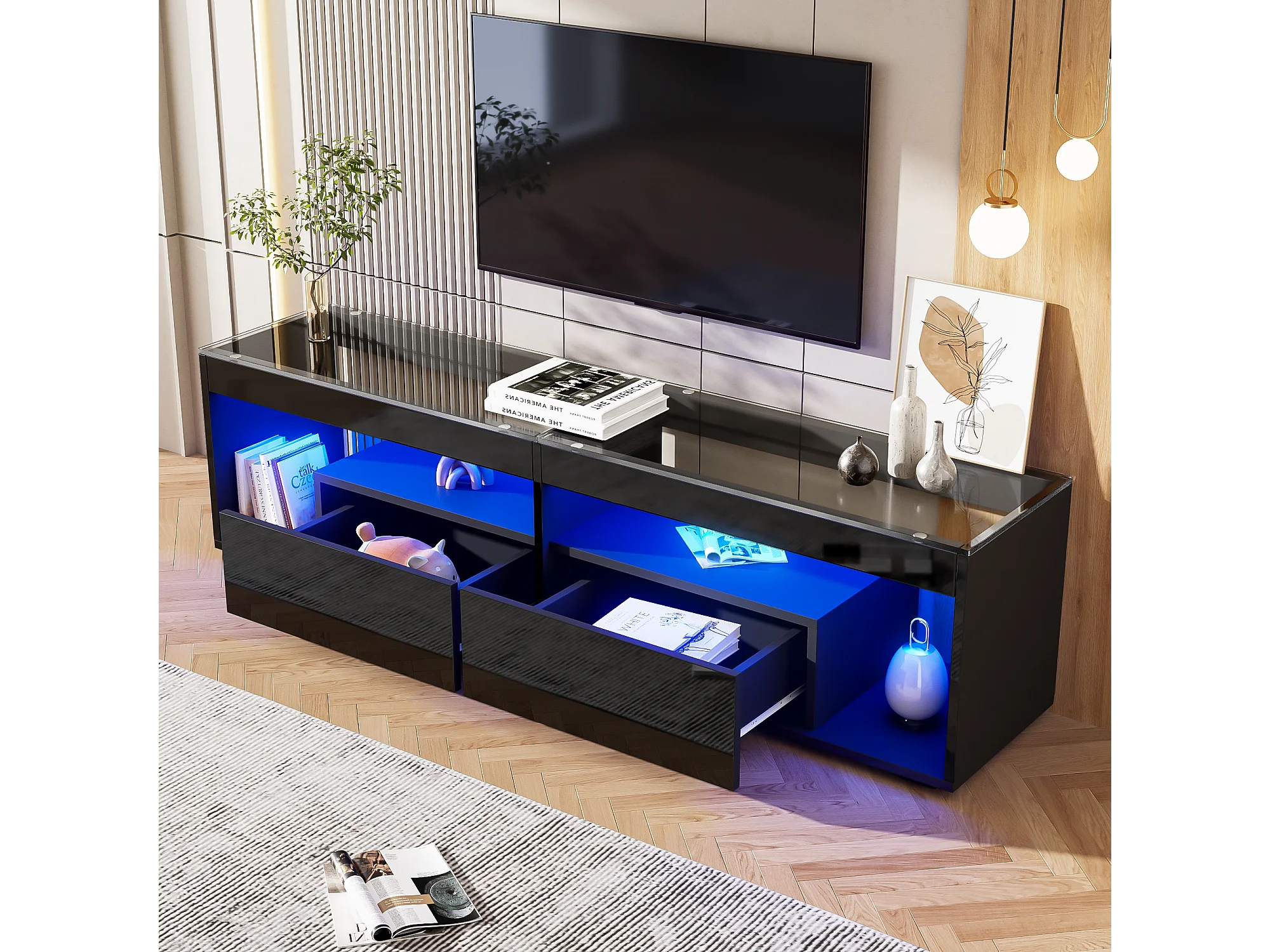 Meuble TV haut laqué avec LED, pour téléviseurs jusqu'à 70 pouces, avec 2 tiroirs, matériau en panneaux de particules, noir (180x40x46cm)