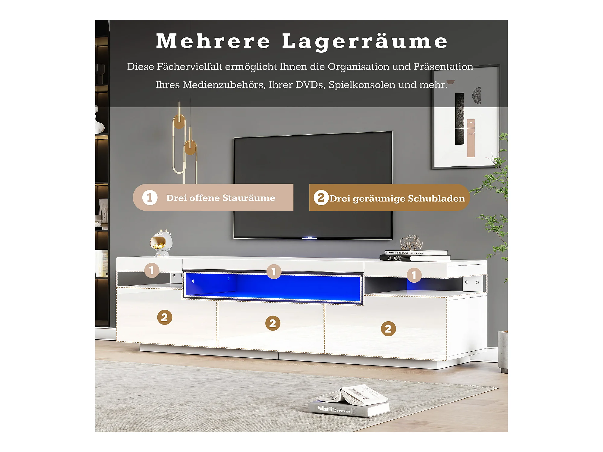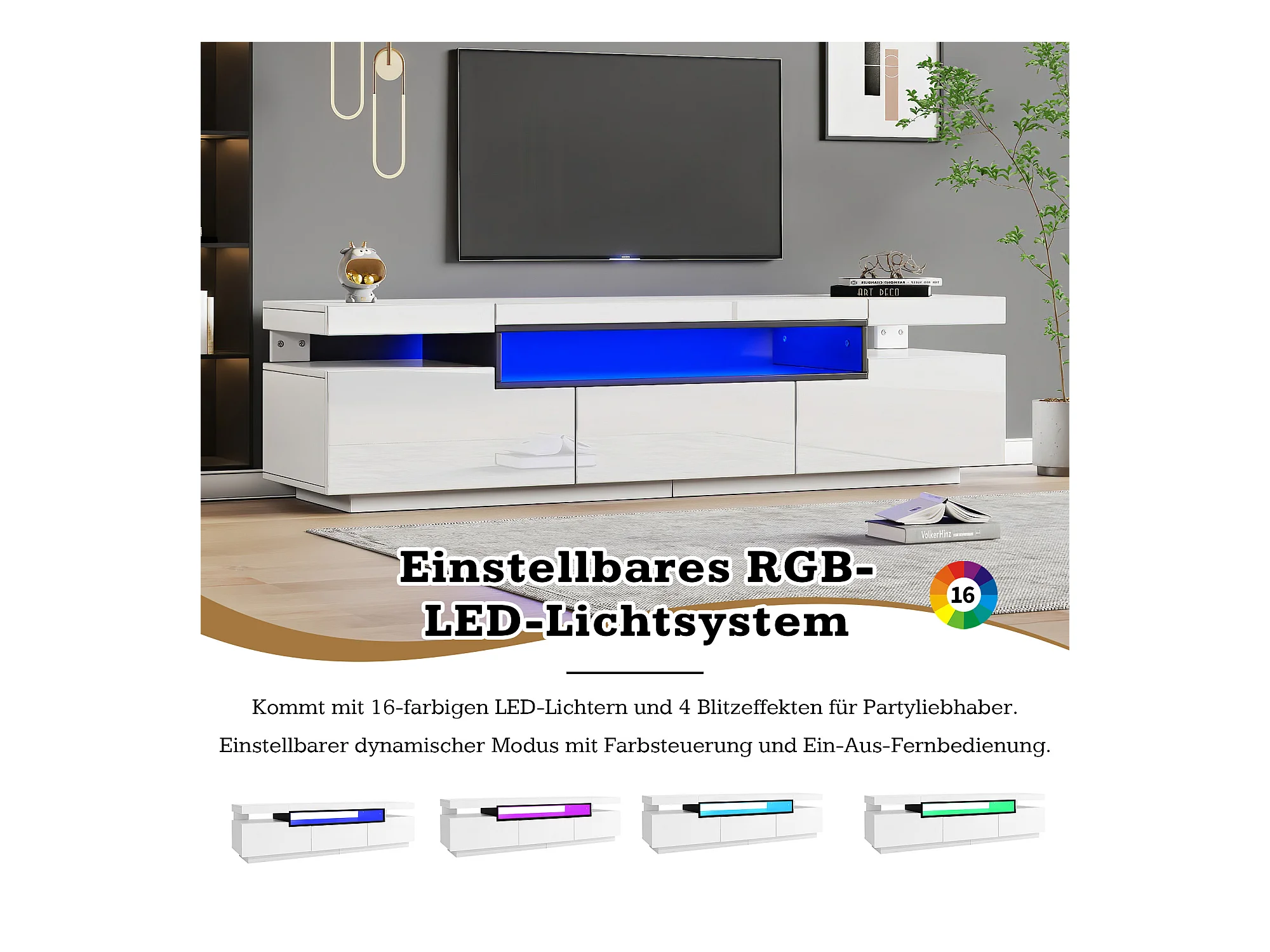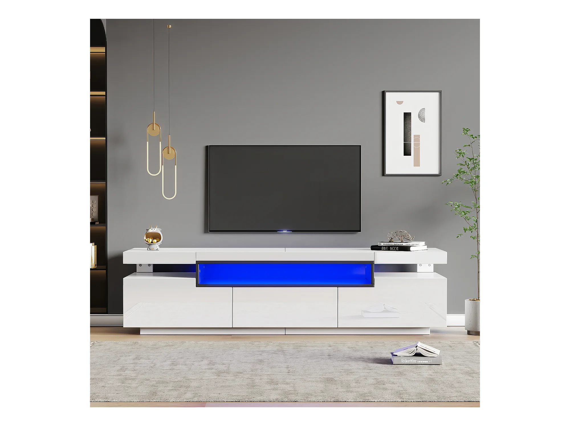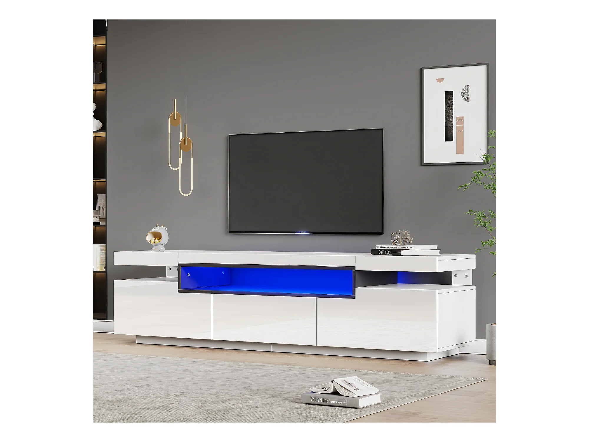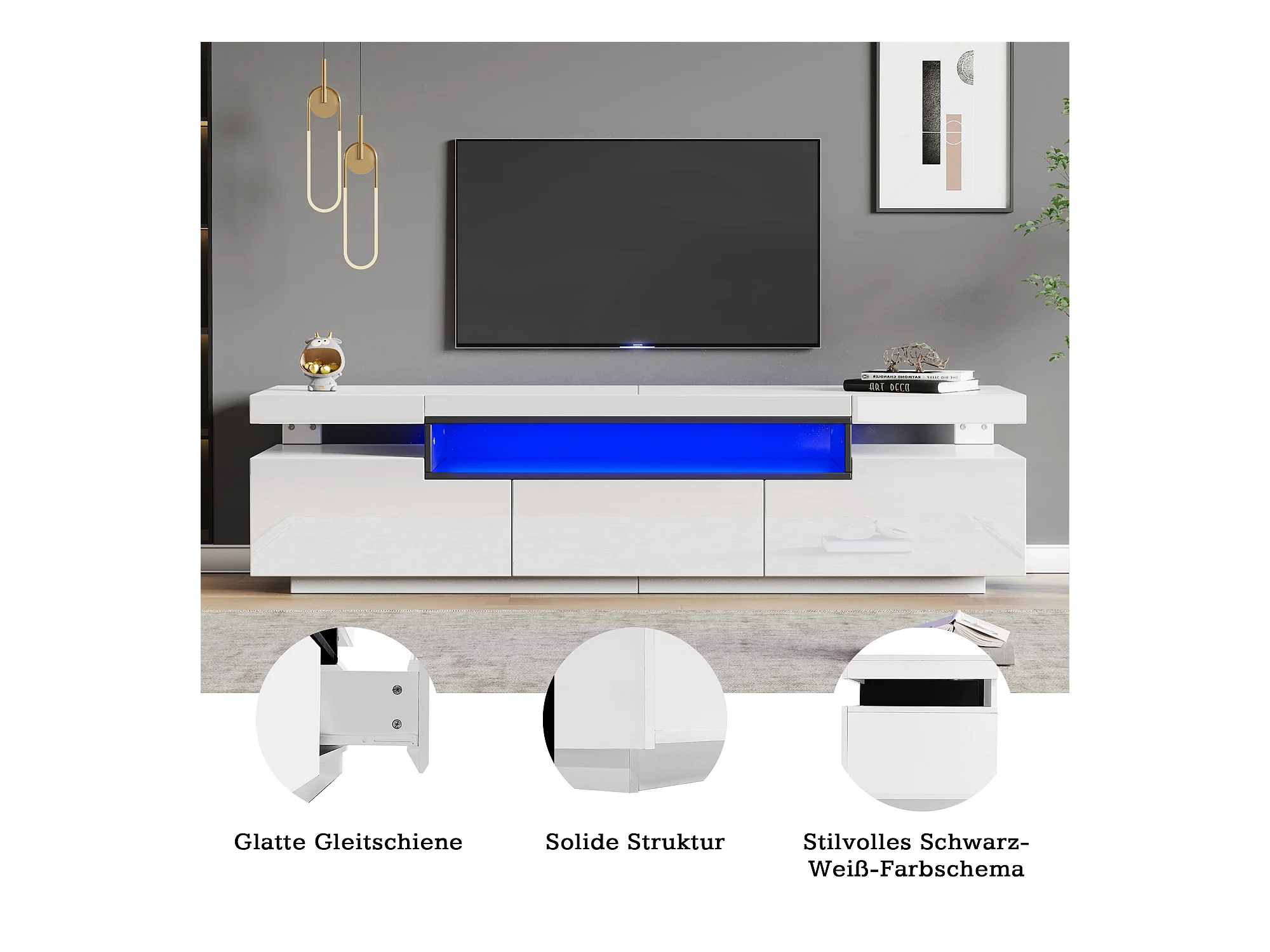 Meuble TV Lowboard avec éclairage LED, 3 tiroirs et gestion des câbles, pour TV jusqu'à 70 pouces, blanc brillant (200x40x42 cm)