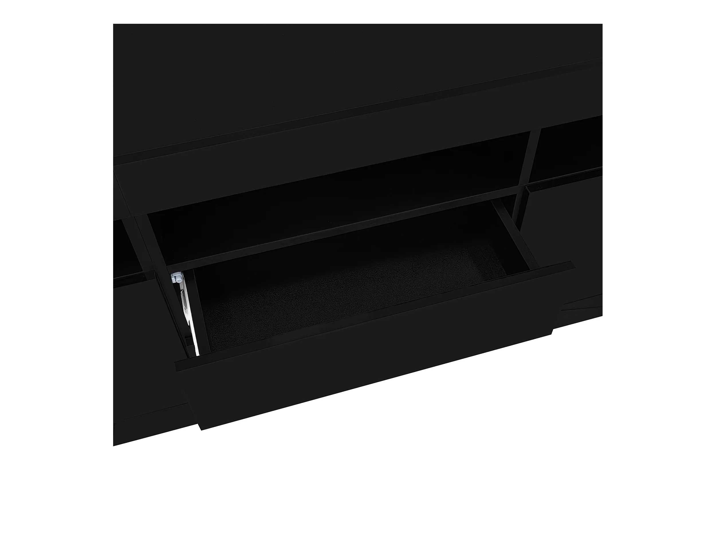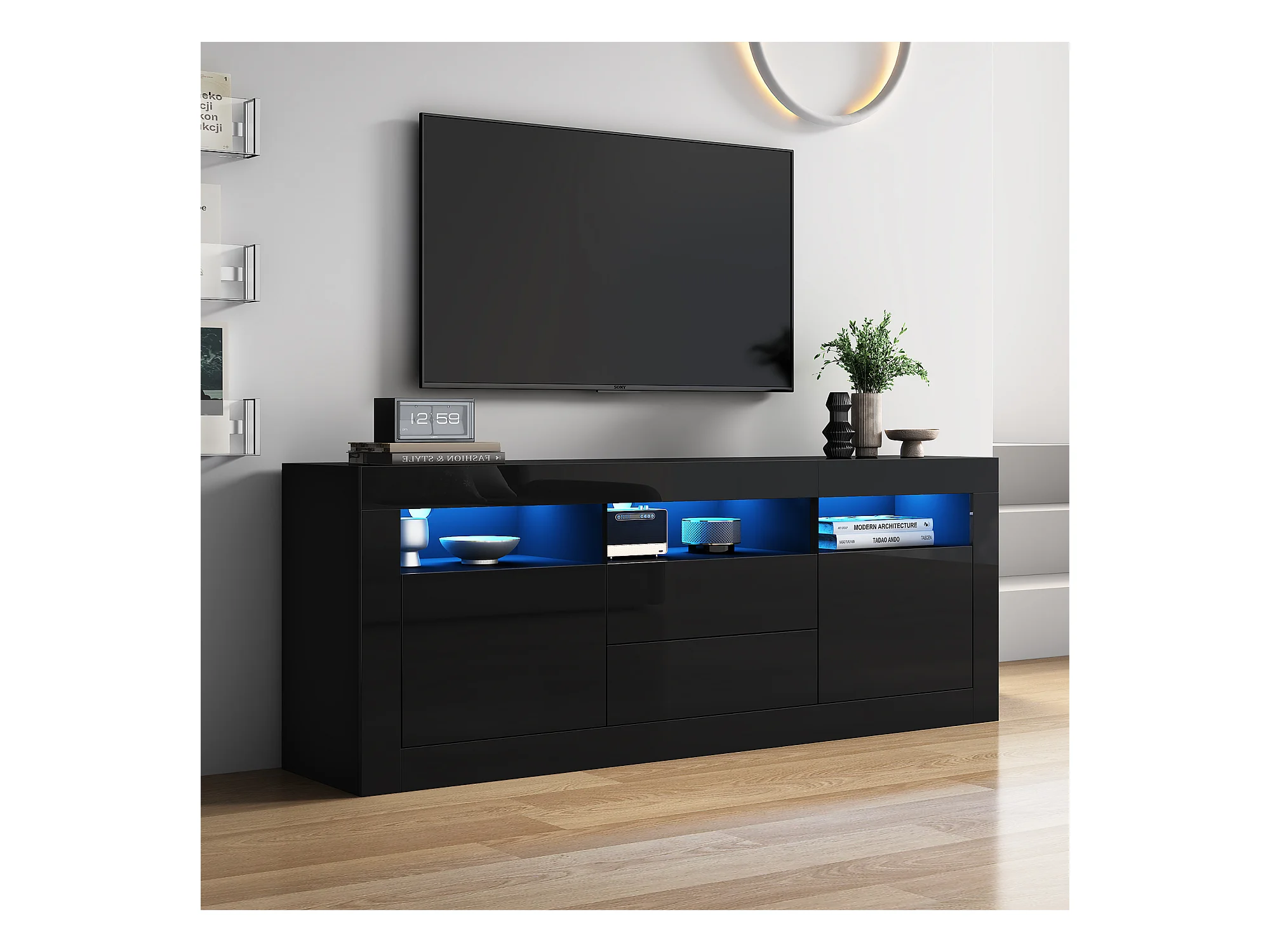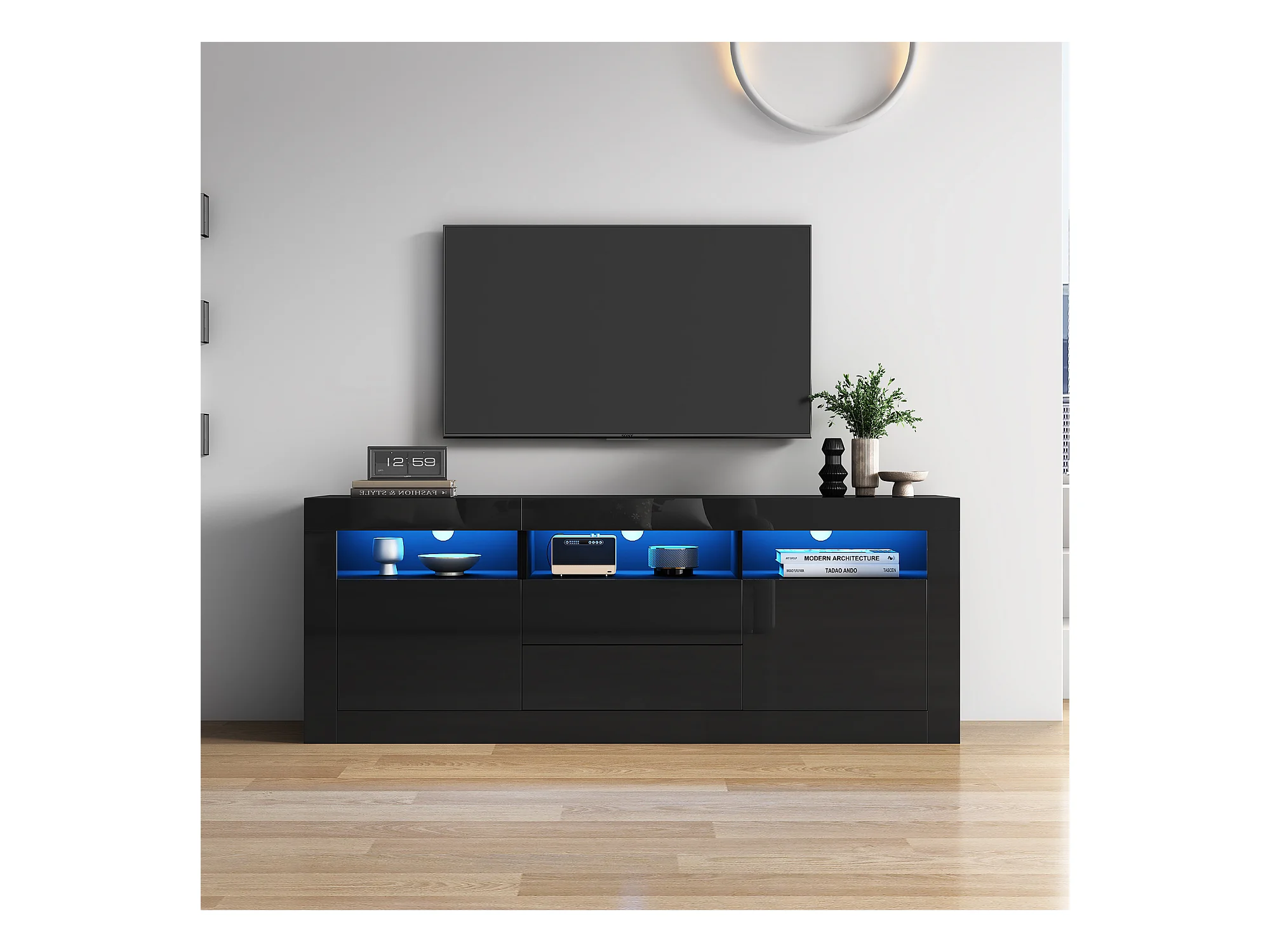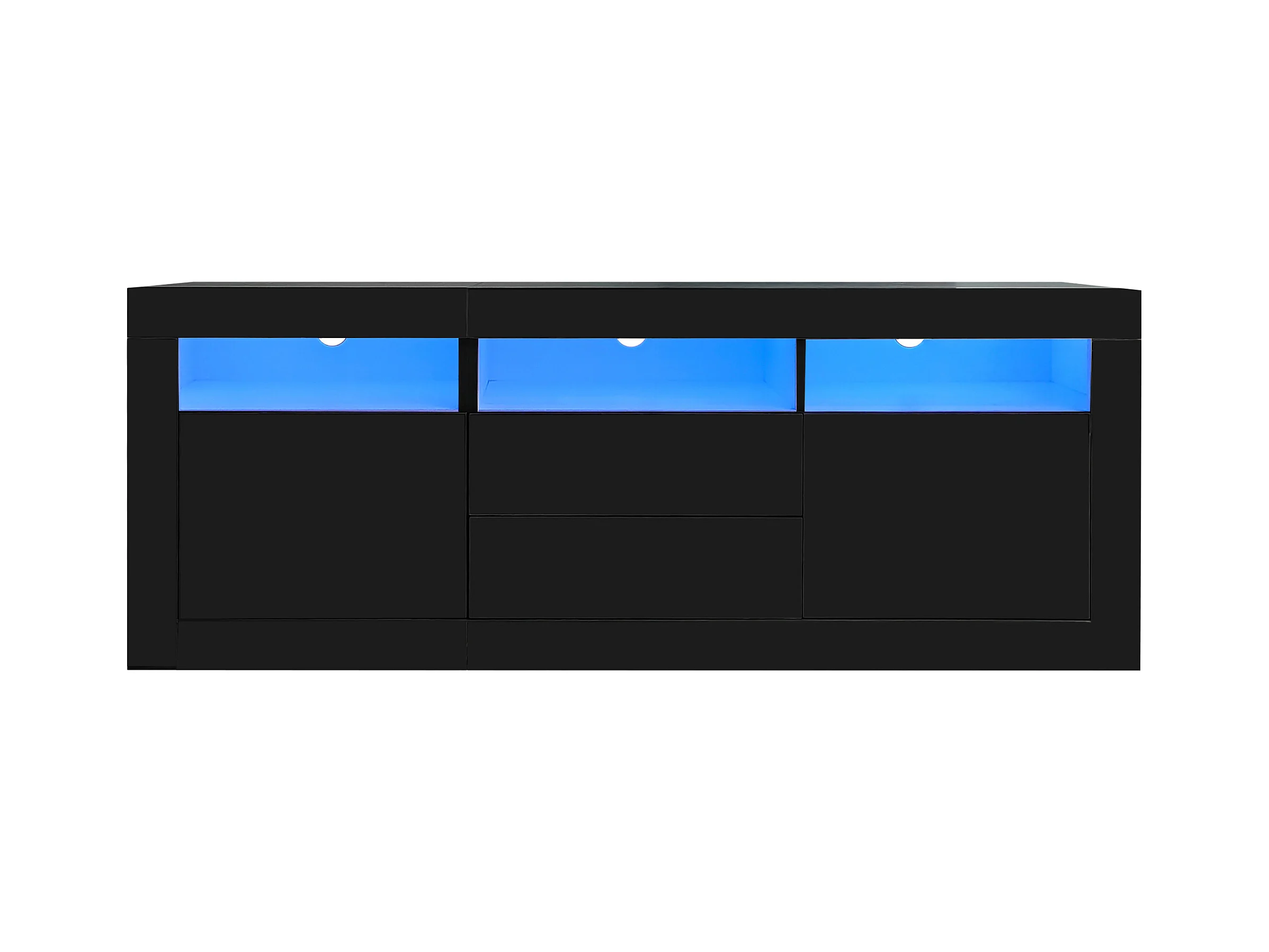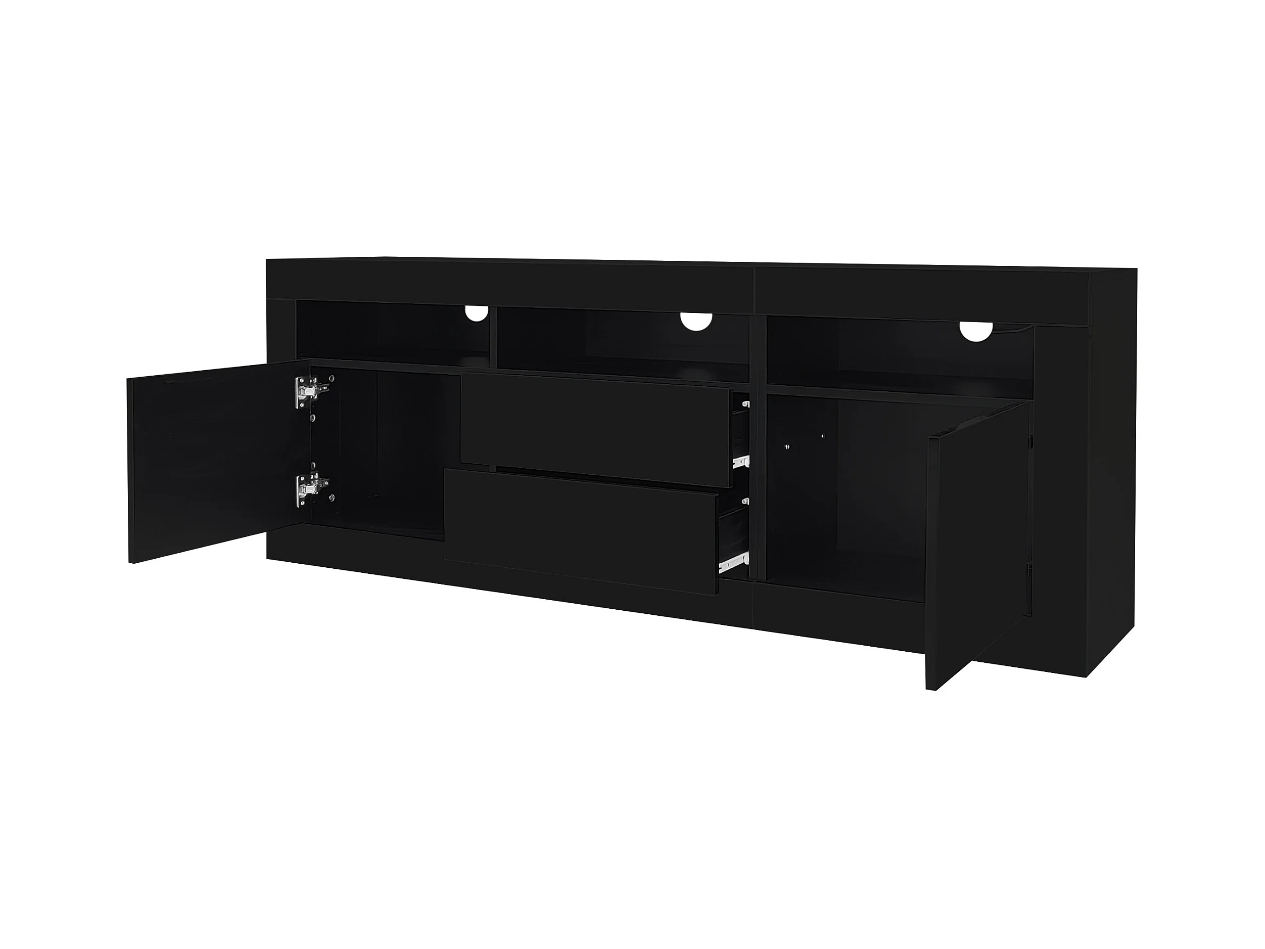 Meuble TV LED avec 3 compartiments ouverts, 2 portes et 2 tiroirs, noir - pour salon et bureaux