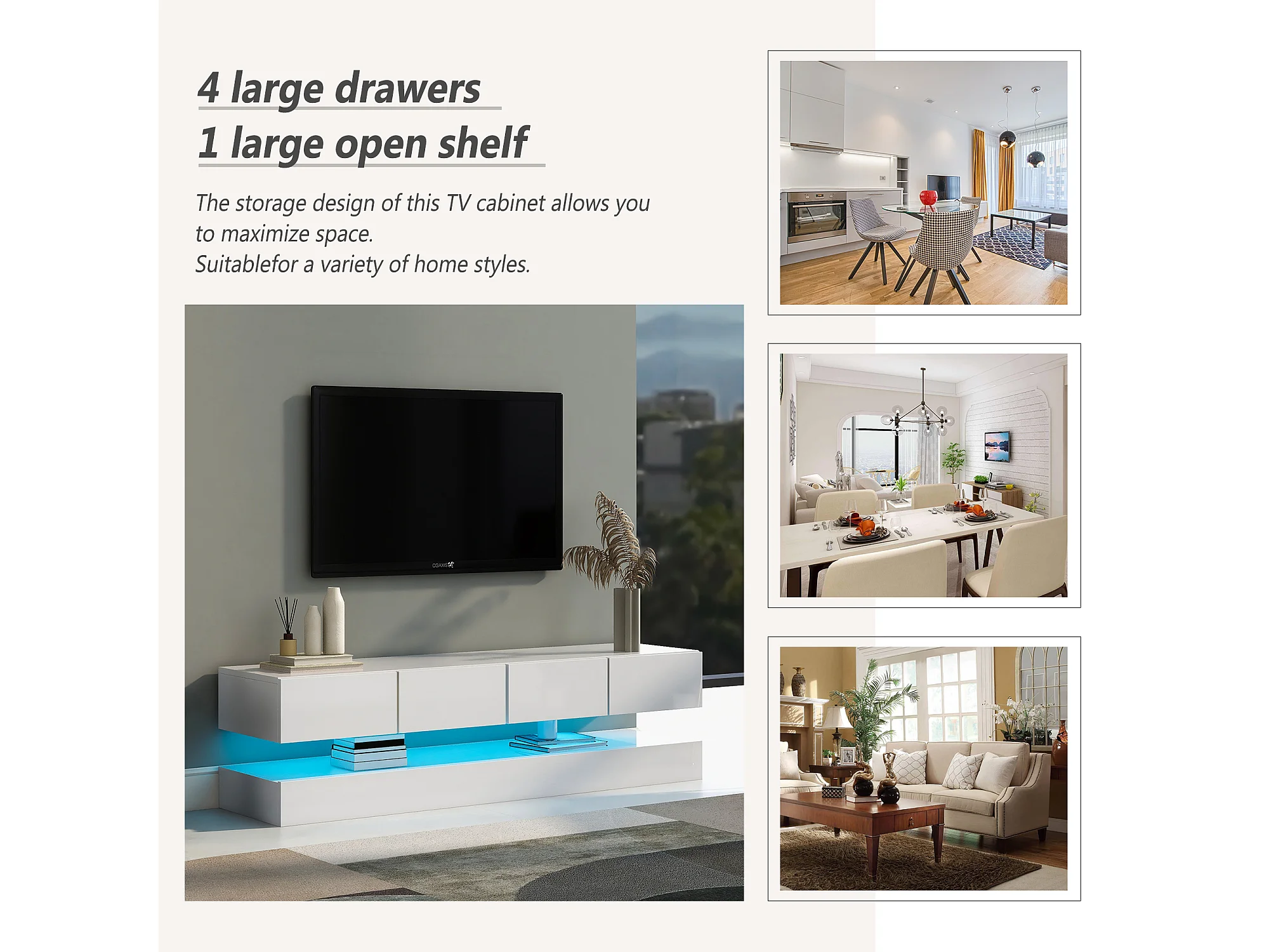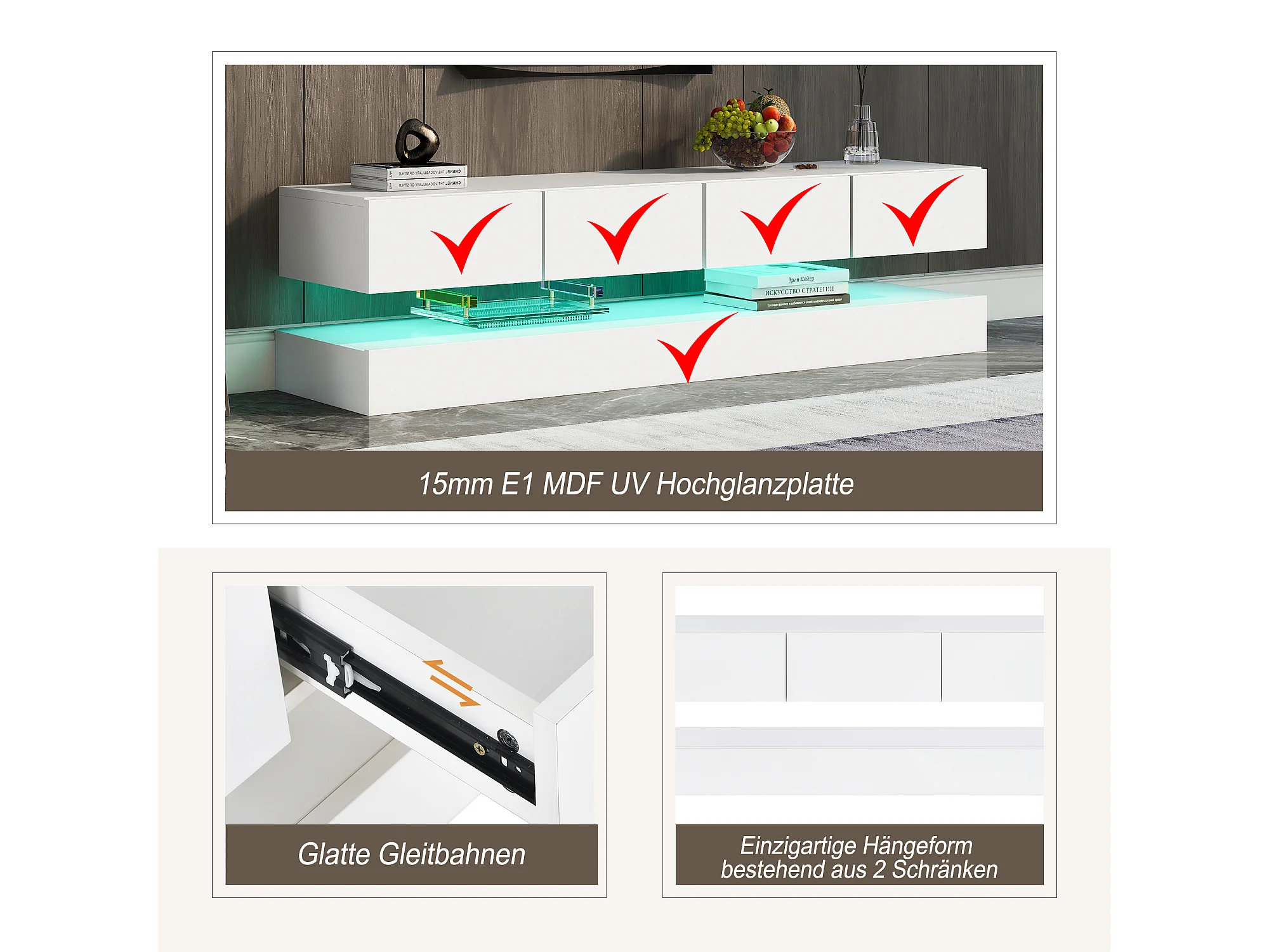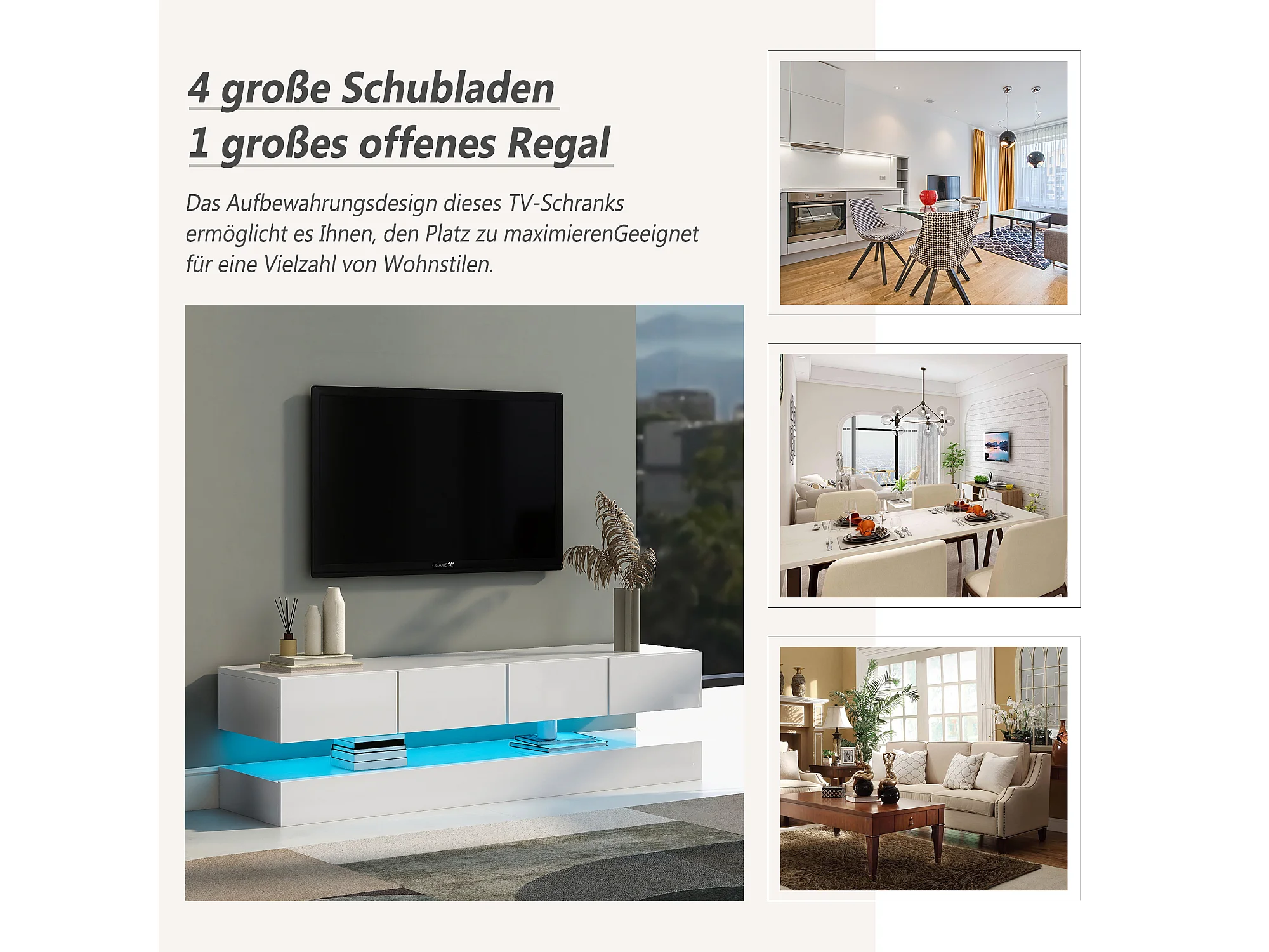 Meuble TV LED, mural, 2 armoires, 4 tiroirs, 16 couleurs LED, Bluetooth, Blanc (130x33x15cm)