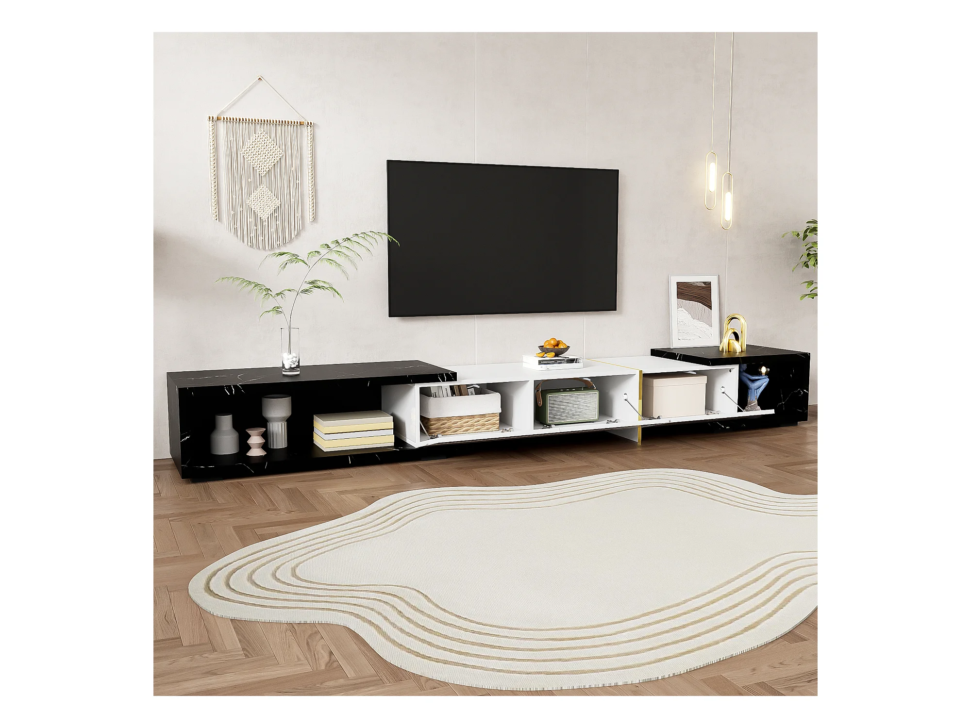 Meuble TV, longueur variable 140-260cm, rotatif, aspect marbre, décorations dorées