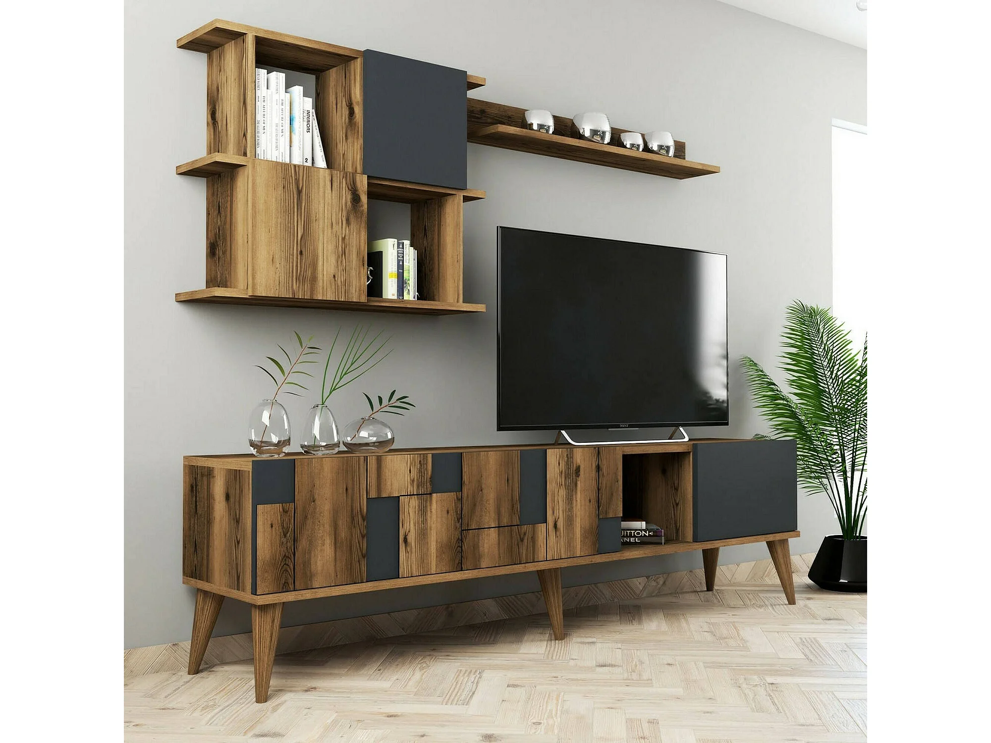 Meuble TV Menk, Buffet de salon, Armoire basse pour TV, Base murale de rangement, 180x34h49 cm, Noyer et Anthracite