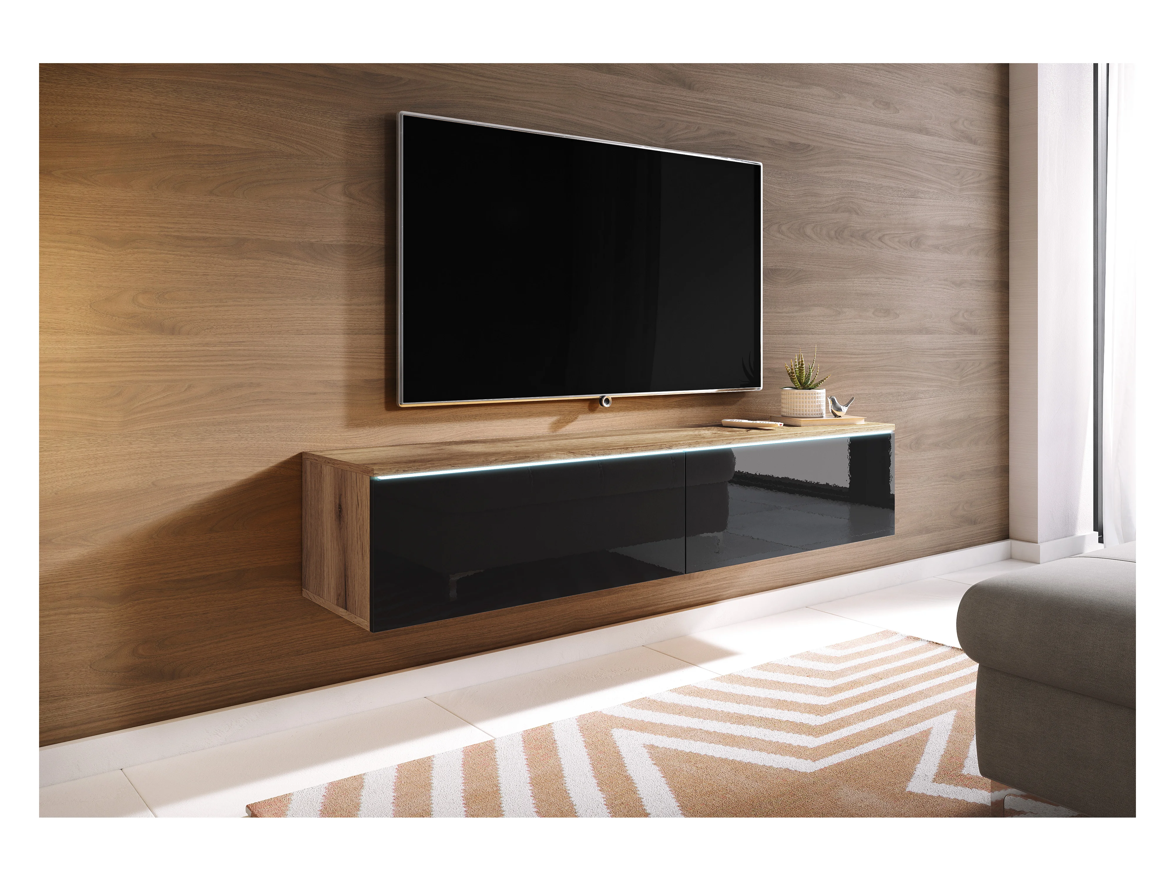 Meuble TV moderne 180 cm pour salon avec LED – 2 portes, sans poignées, caisson chêne wotan, façades noir brillant, à poser ou à suspendre
