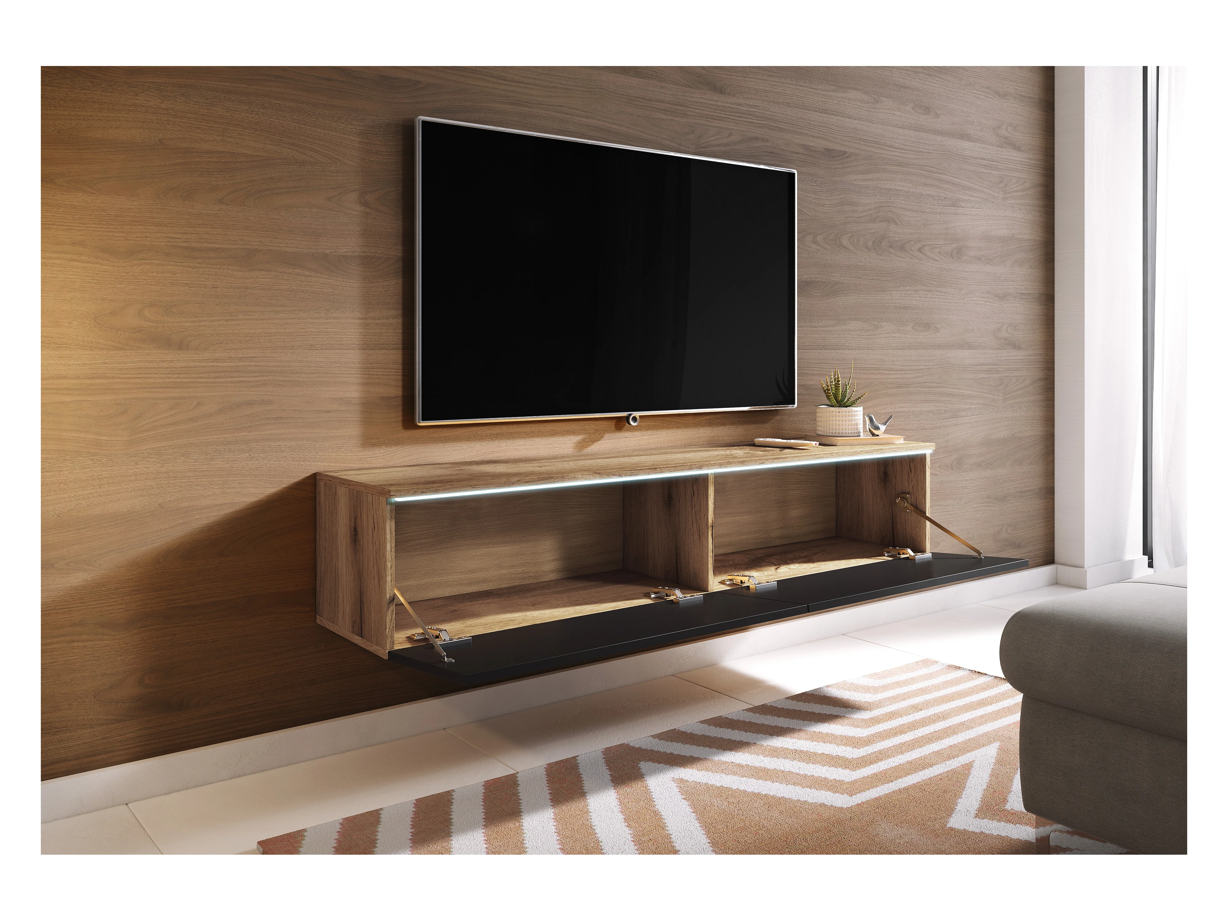 Meuble TV moderne 180 cm pour salon avec LED – 2 portes, sans poignées, chêne artisan, à poser ou à suspendre