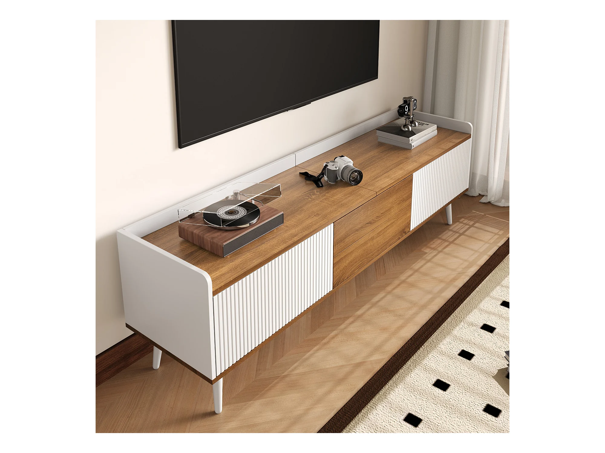 Meuble TV moderne - 160 x 39 x 49.5 cm - avec 3 portes - MDF + aggloméré - naturel + blanc