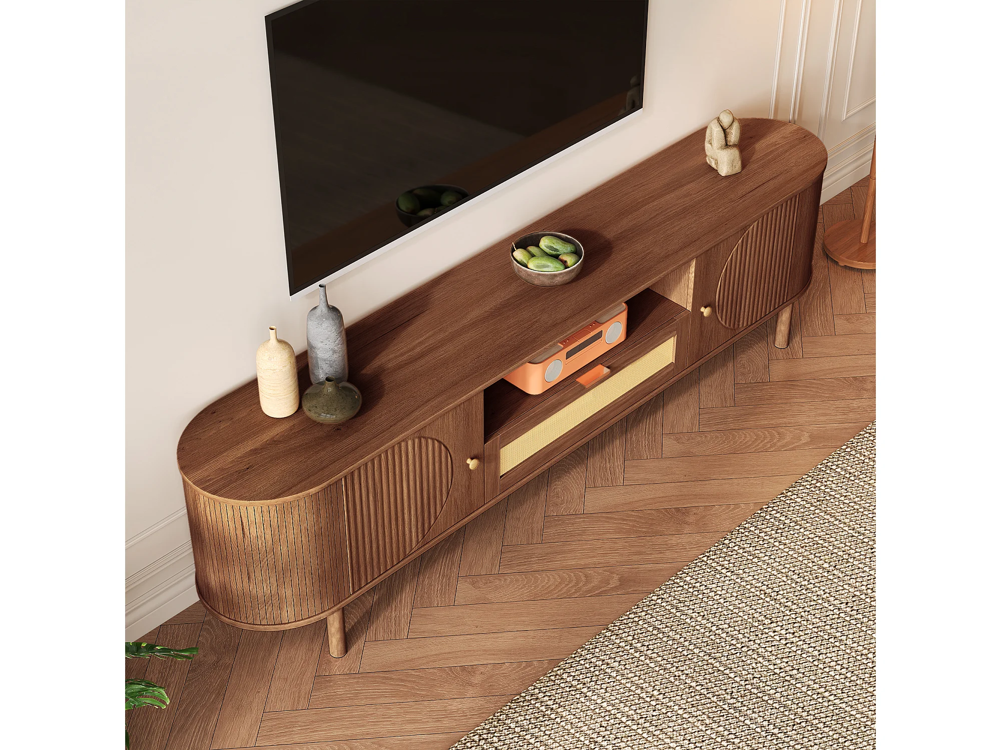 Meuble TV moderne - 175 x 36 x 51 cm - avec tiroirs en rotin + étagère ouvert + 2 portes - pieds en métal - MDF - marron