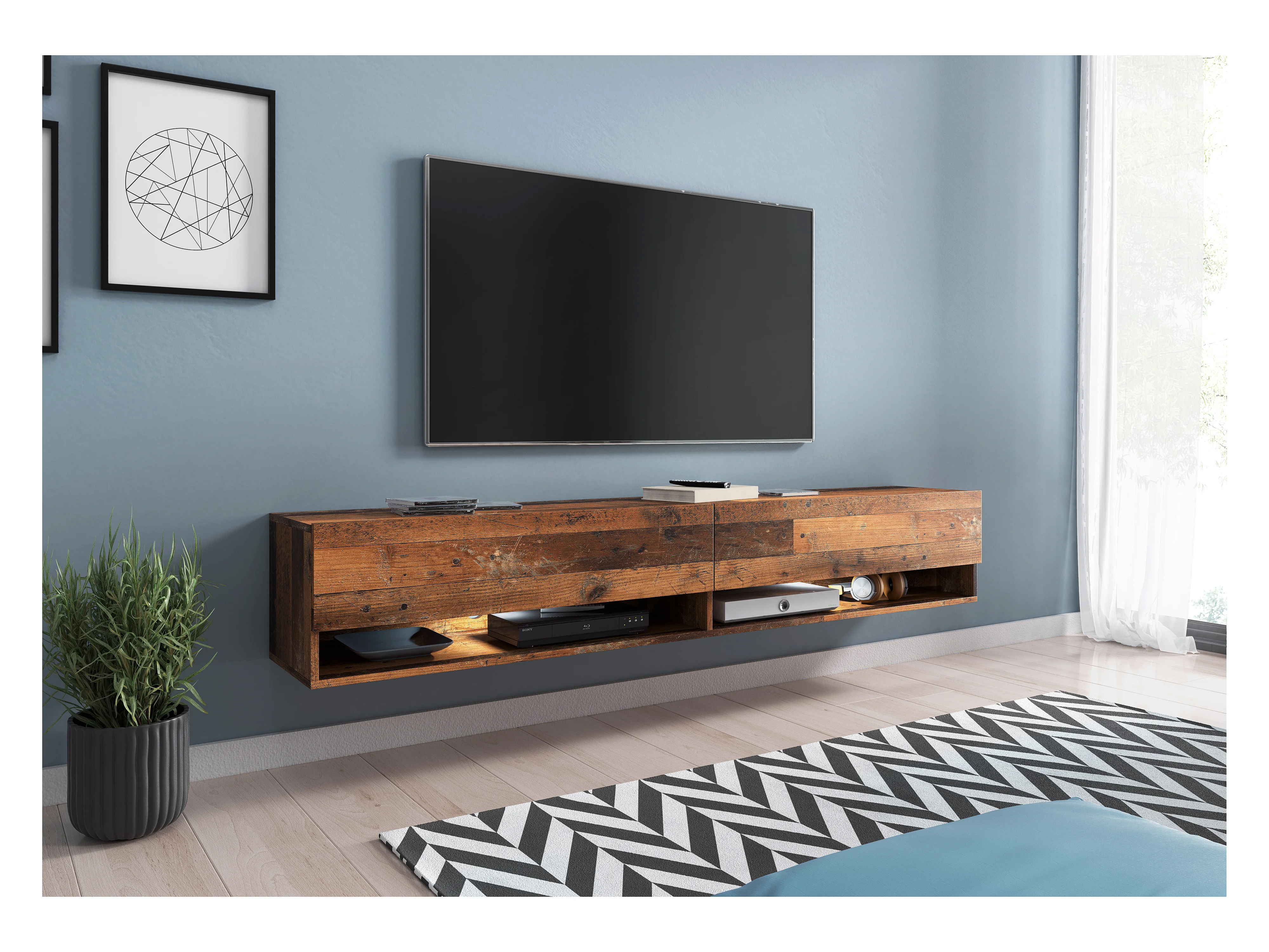 Meuble TV moderne 180 cm avec LED sans poignées – old style mat suspendu ou posé