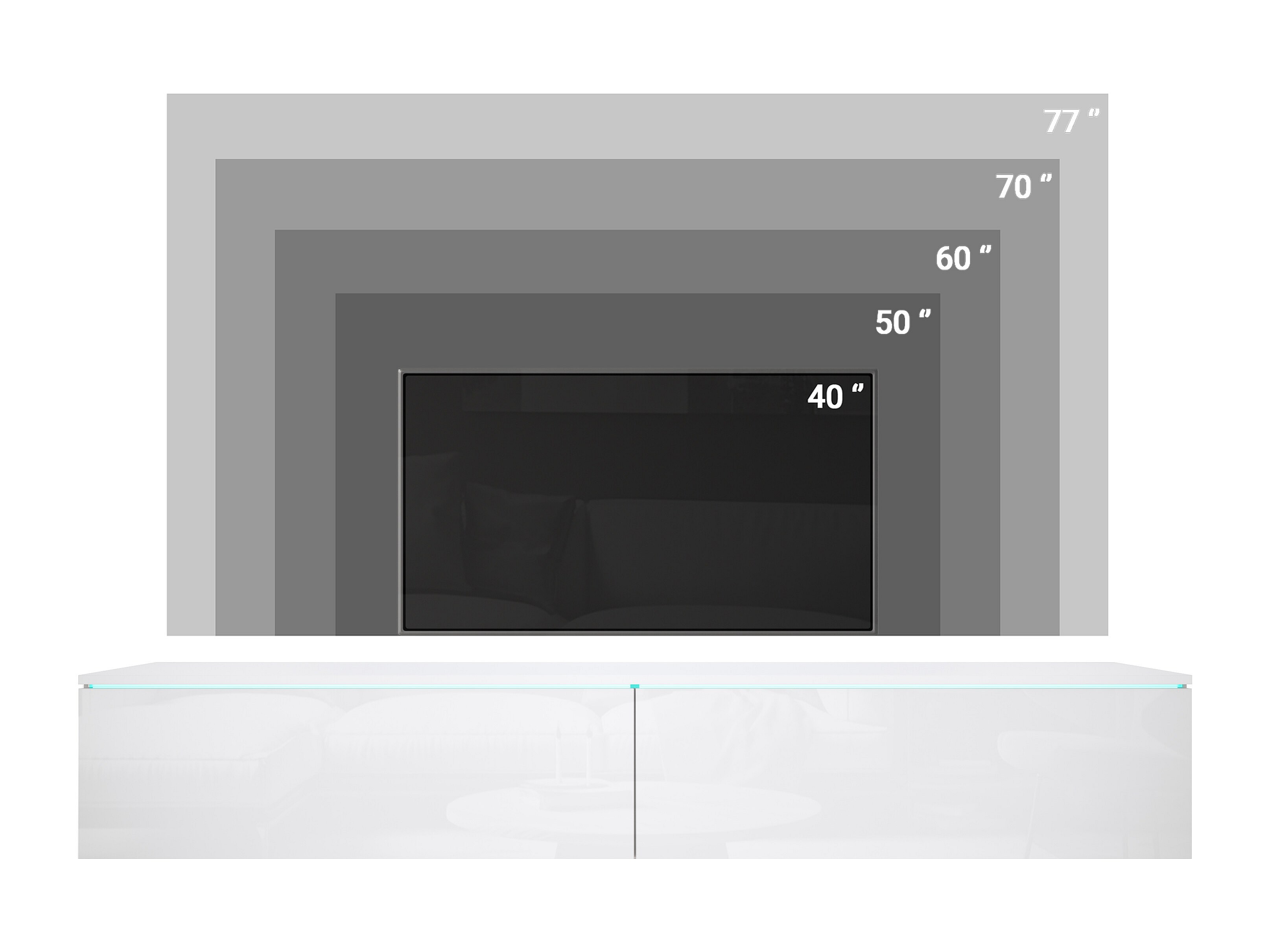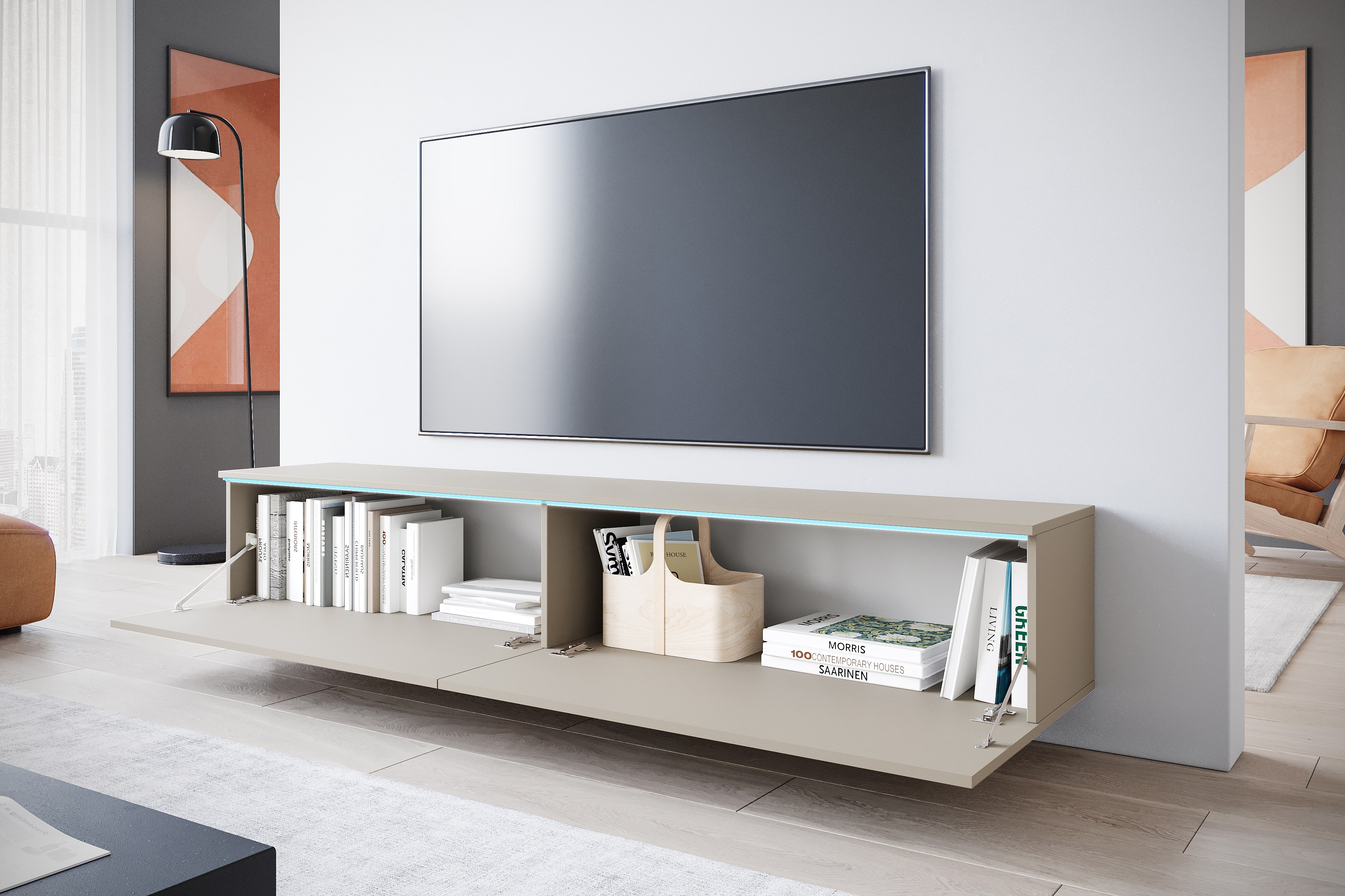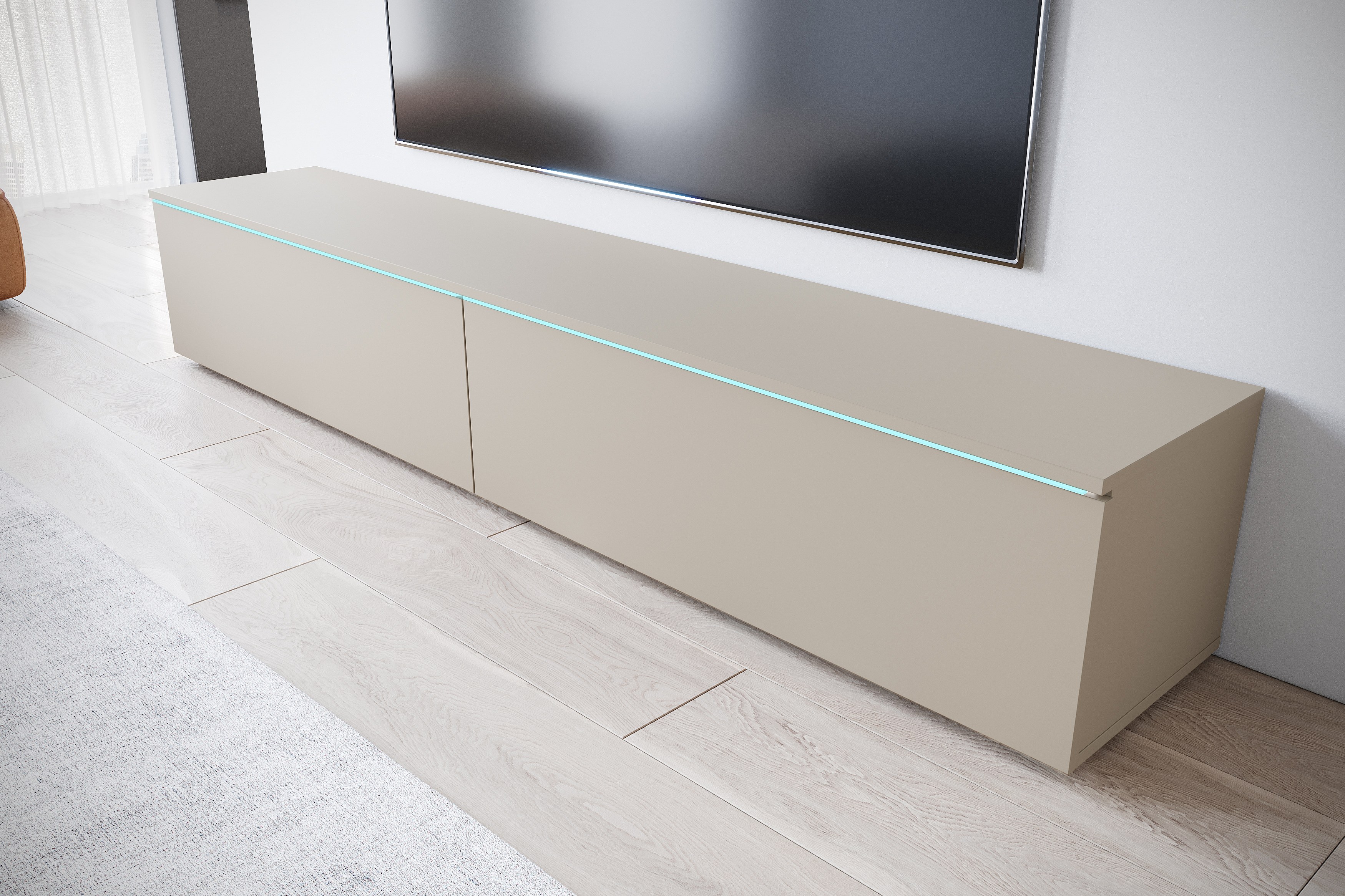 Meuble TV moderne 180 cm pour salon avec LED – 2 portes, sans poignées, beige cachemire mat, à poser ou à suspendre