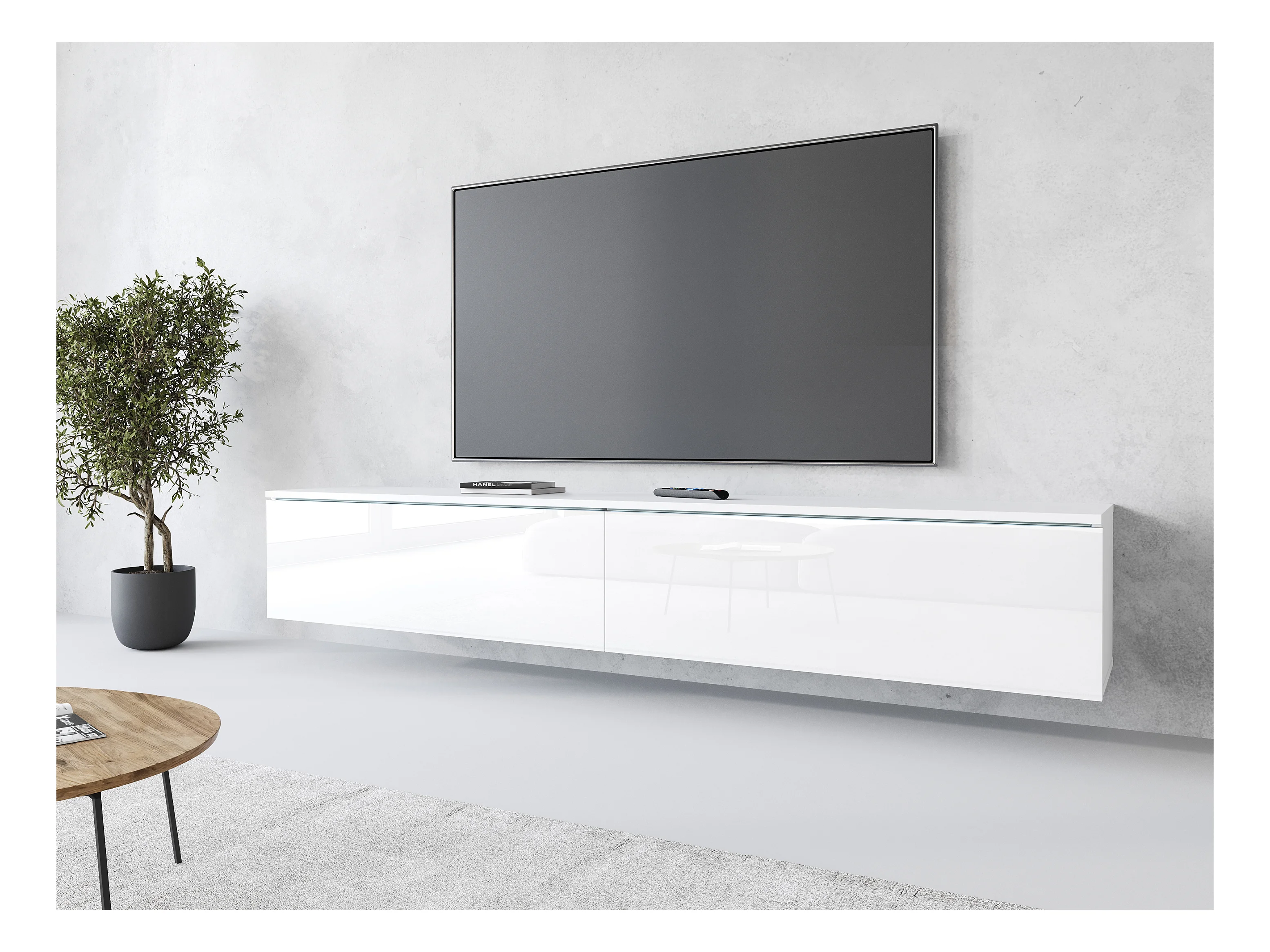 Meuble TV moderne 180 cm pour salon avec LED – 2 portes, sans poignées, caisson blanc mat, façades blanc brillant, à poser ou à suspendre