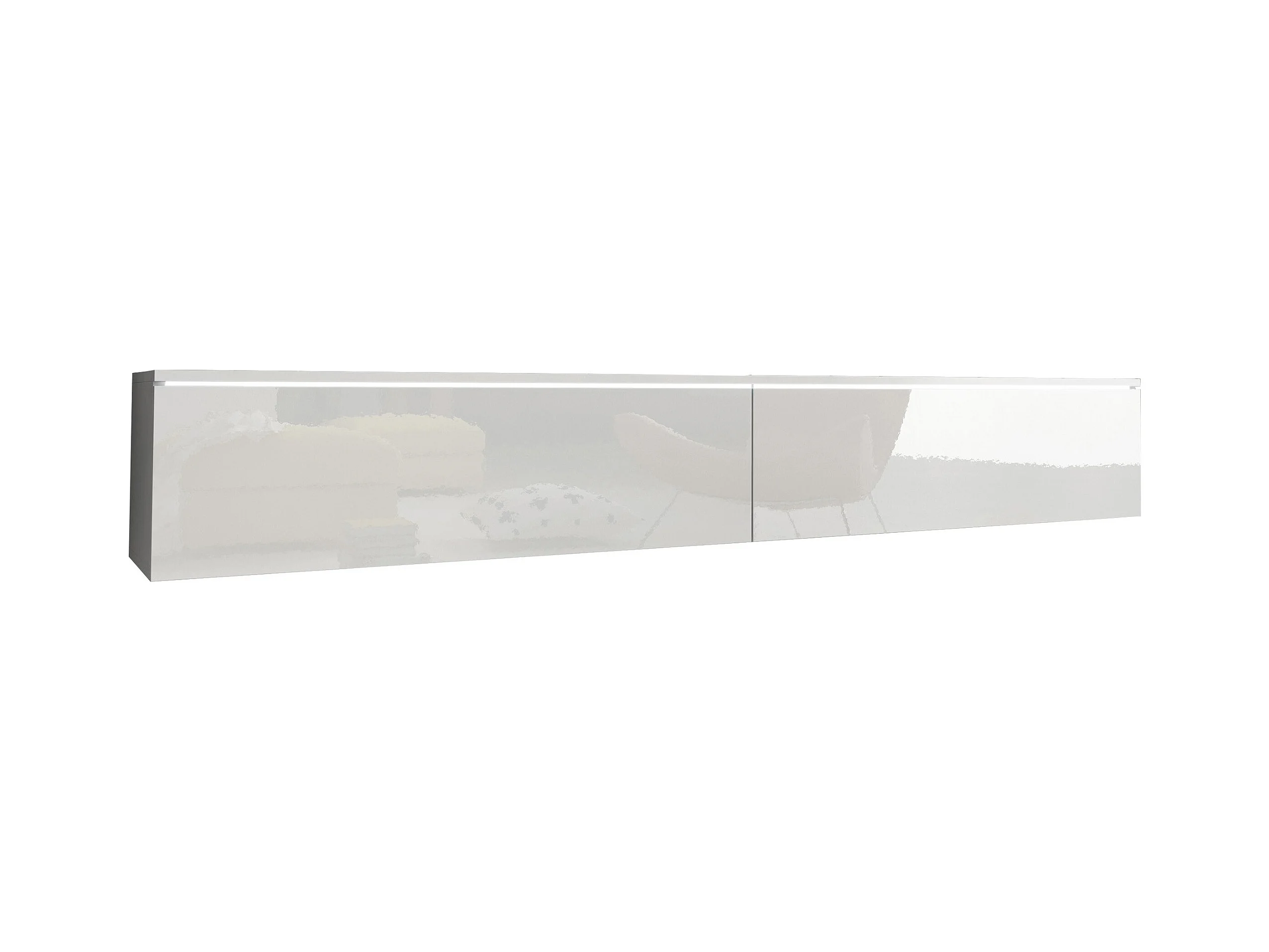 Meuble TV moderne 180 cm pour salon avec LED – 2 portes, sans poignées, caisson blanc mat, façades gris brillant, à poser ou à suspendre