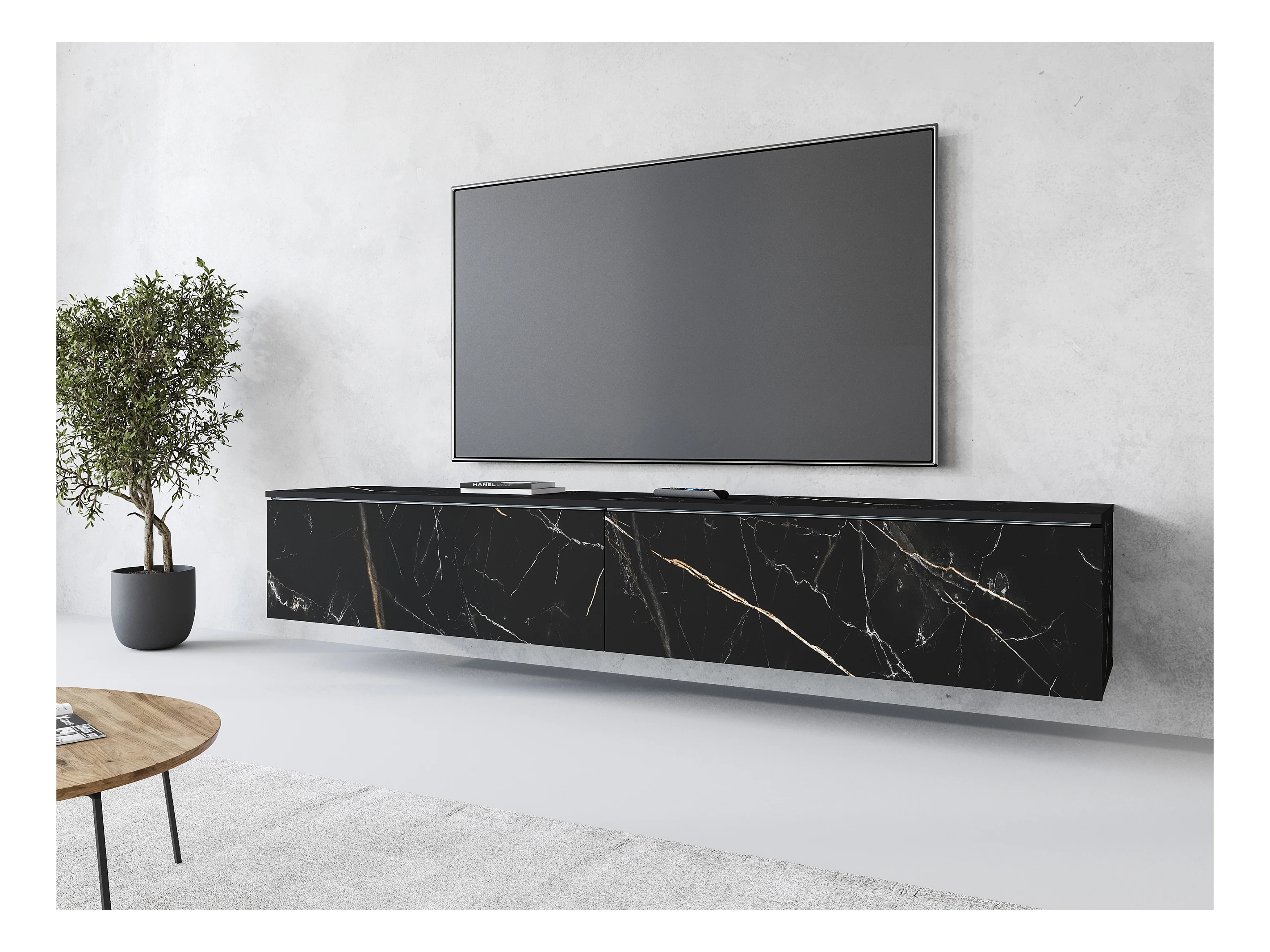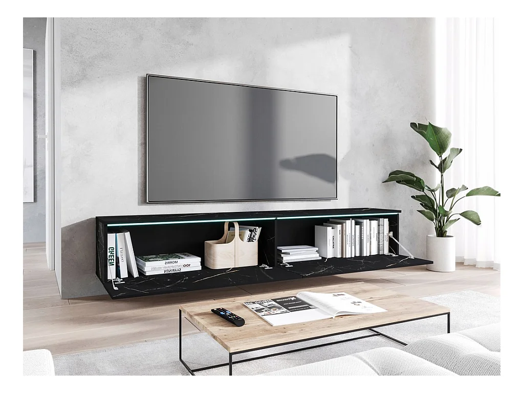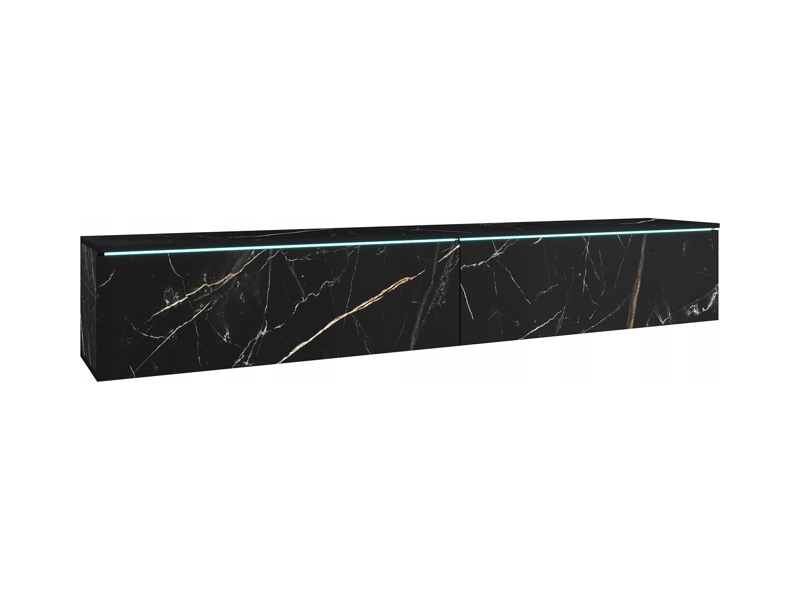 Meuble TV moderne 180 cm pour salon avec LED – 2 portes, sans poignées, marbre mat, à poser ou à suspendre